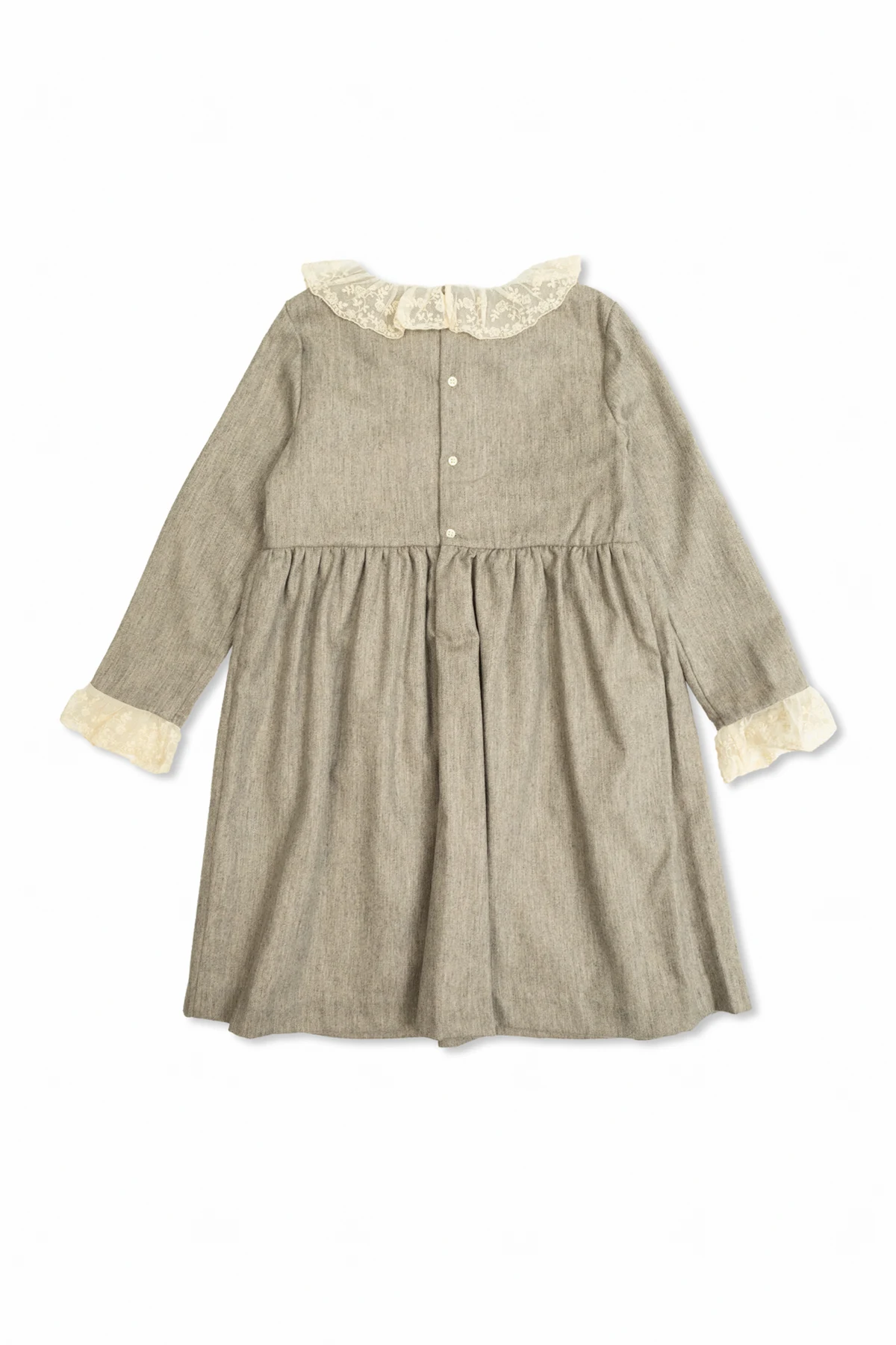 Introducing the Luxury Lace-Trimmed Dress from the esteemed French designer, Bonpoint. This exquisite piece from the exclusive girls\' collection, tailored for ages 4-14, epitomizes sophistication and grace. Crafted from a meticulous blend of high-quality materials, the outer layer combines wool, polyester, and viscose, while the inner lining is pure cotton, ensuring unparalleled comfort. The dress boasts a dominant gray hue, making it a versatile addition to any wardrobe. The design features long sleeves and a waistline that is tastefully defined, below which the fabric gently gathers to create a volumized silhouette. The intricate lace embellishments around the neckline and sleeve cuffs, adorned with a delicate floral pattern, add a touch of elegance and refinement. Practical yet stylish, the dress is equipped with buttons at the back, facilitating easy wear and removal. The interior neckline is lined with smooth fabric, enhancing the comfort for the wearer. Why Choose This Product? Exquisite design from the renowned Bonpoint. High-quality material blend for superior comfort and durability. Elegant lace detailing with a floral motif. Functional back buttons for easy dressing. Perfect for special occasions.