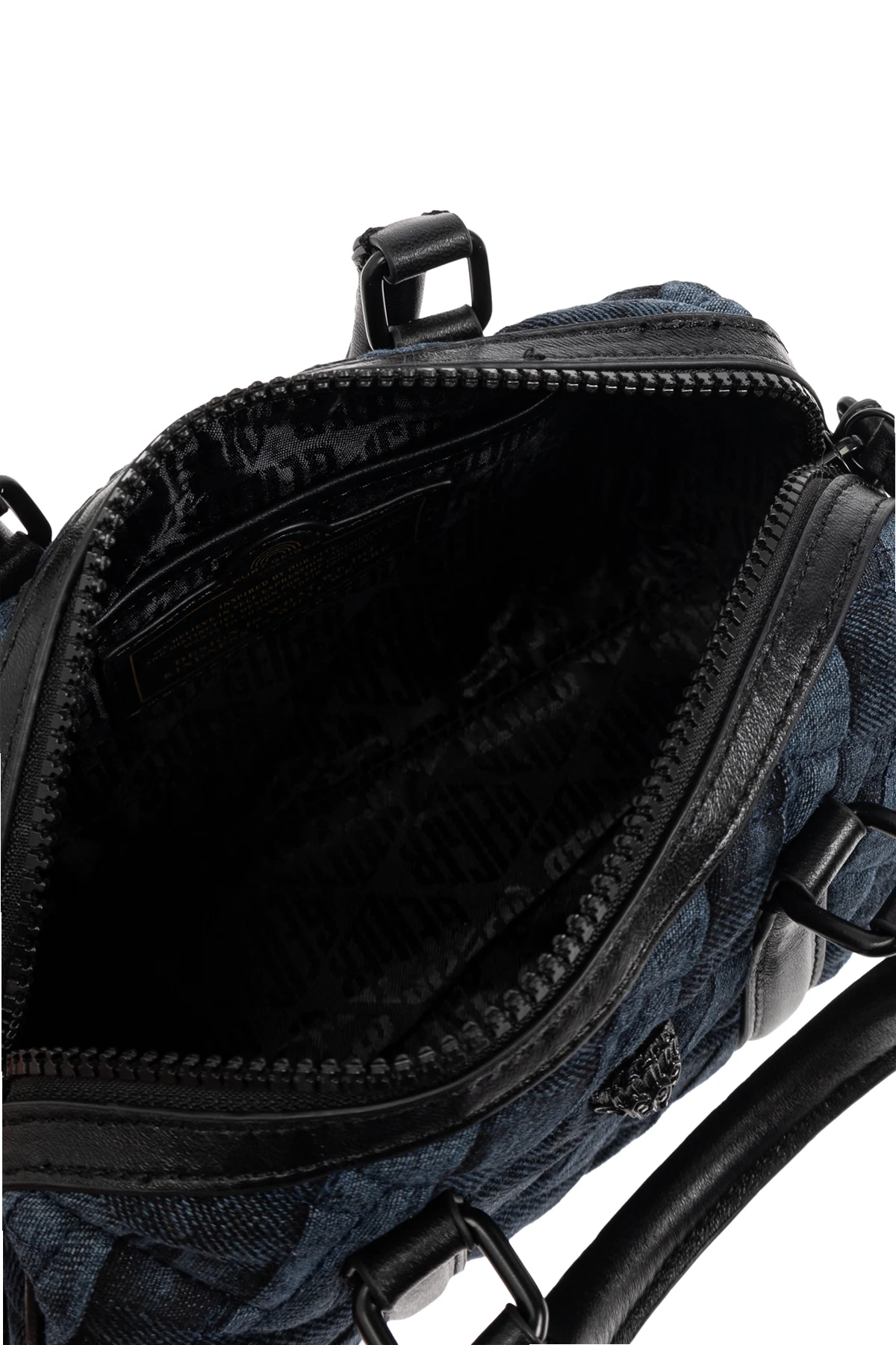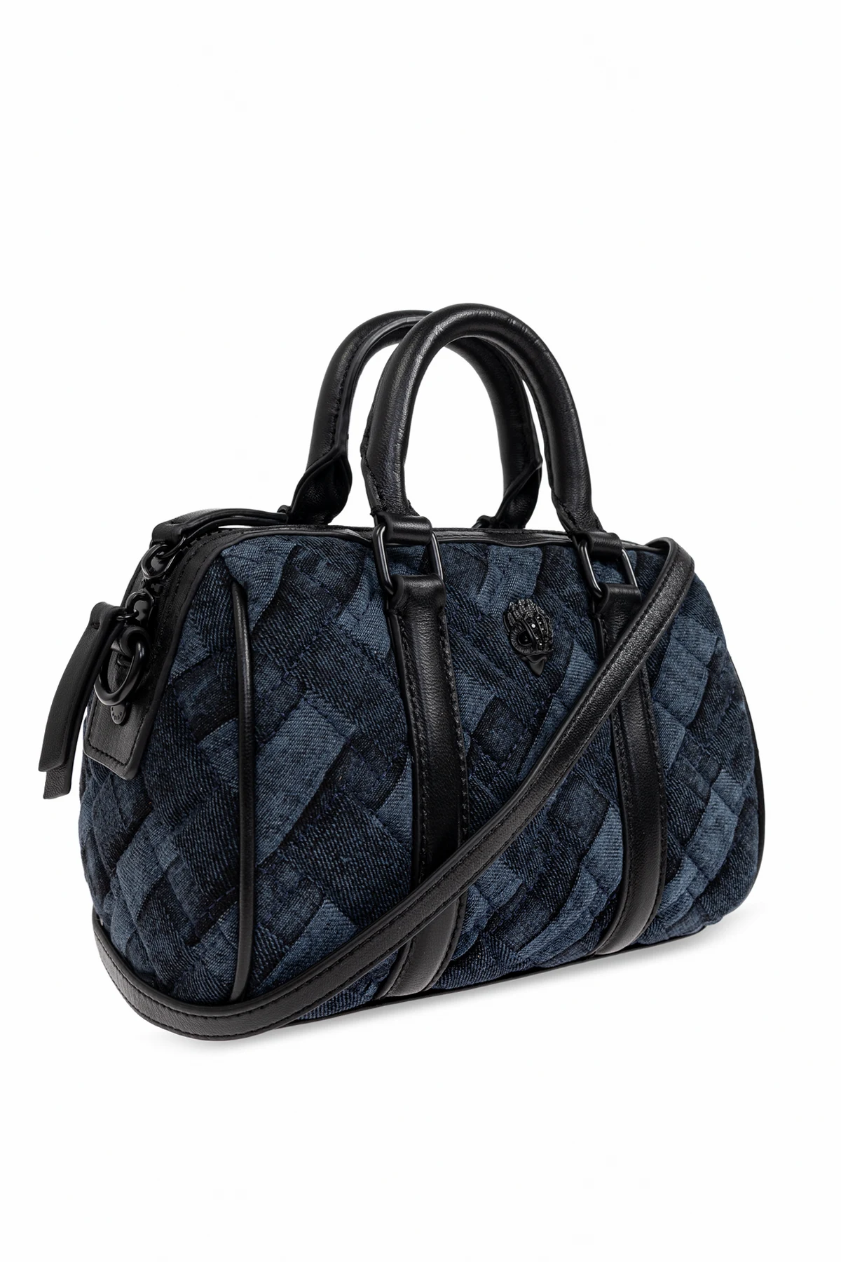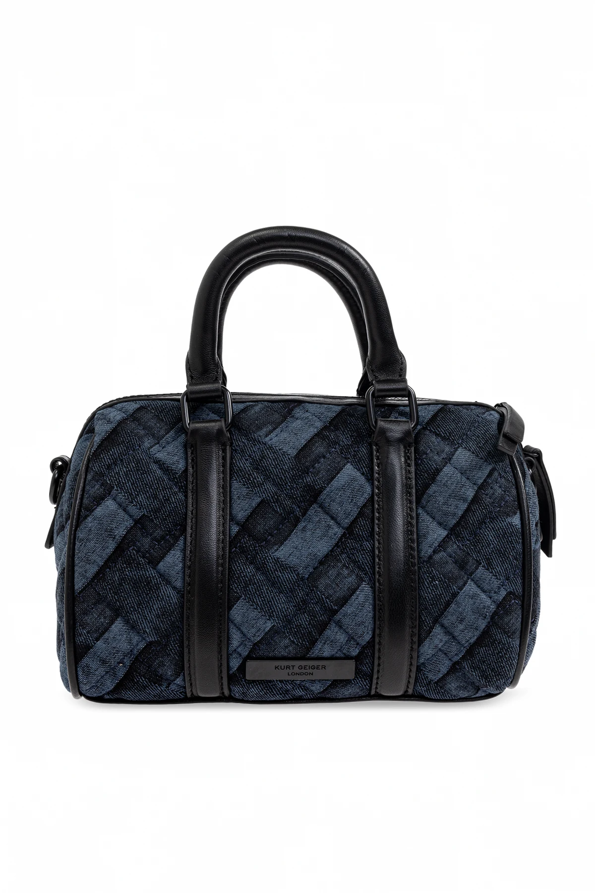 Introducing the Kensington Sm Boston handbag from the illustrious Kurt Geiger, a paragon of British elegance and sophistication. This exquisite piece, part of an exclusive collection, showcases a classic rectangular shape with rounded edges, exuding a timeless allure. Crafted from a woven-texture material in a predominant navy hue, the intersecting stripes pattern lends an air of refined sophistication. Enhancing its functionality, the bag features dual hand straps and a detachable shoulder strap, allowing for versatile styling. The front proudly displays the designer\'s emblem, an emblem of its prestigious origins. The intricate detailing, including straps and handles, are fashioned from smooth dark leather, offering a striking contrast to the bag\'s textured fabric. Inside, the bag conceals a zippered closure, enveloping a lined interior with a printed motif, infusing a touch of luxury. The spacious compartment and slip pocket ensure ample room for essentials. Why Choose This Product? Exquisite design with a refined woven texture. Functional versatility with hand straps and a shoulder strap. Elegant navy and black color palette. Secure zippered closure with a stylish interior lining. Designed by the celebrated Kurt Geiger, a beacon of British fashion.