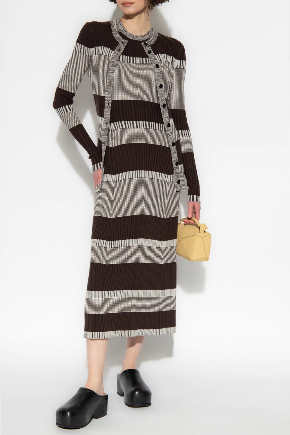 Brown and white sleeveless dress from Proenza Schouler White Label. Crafted from a silk and cotton blend, this style features a ribbed texture and a round neck.