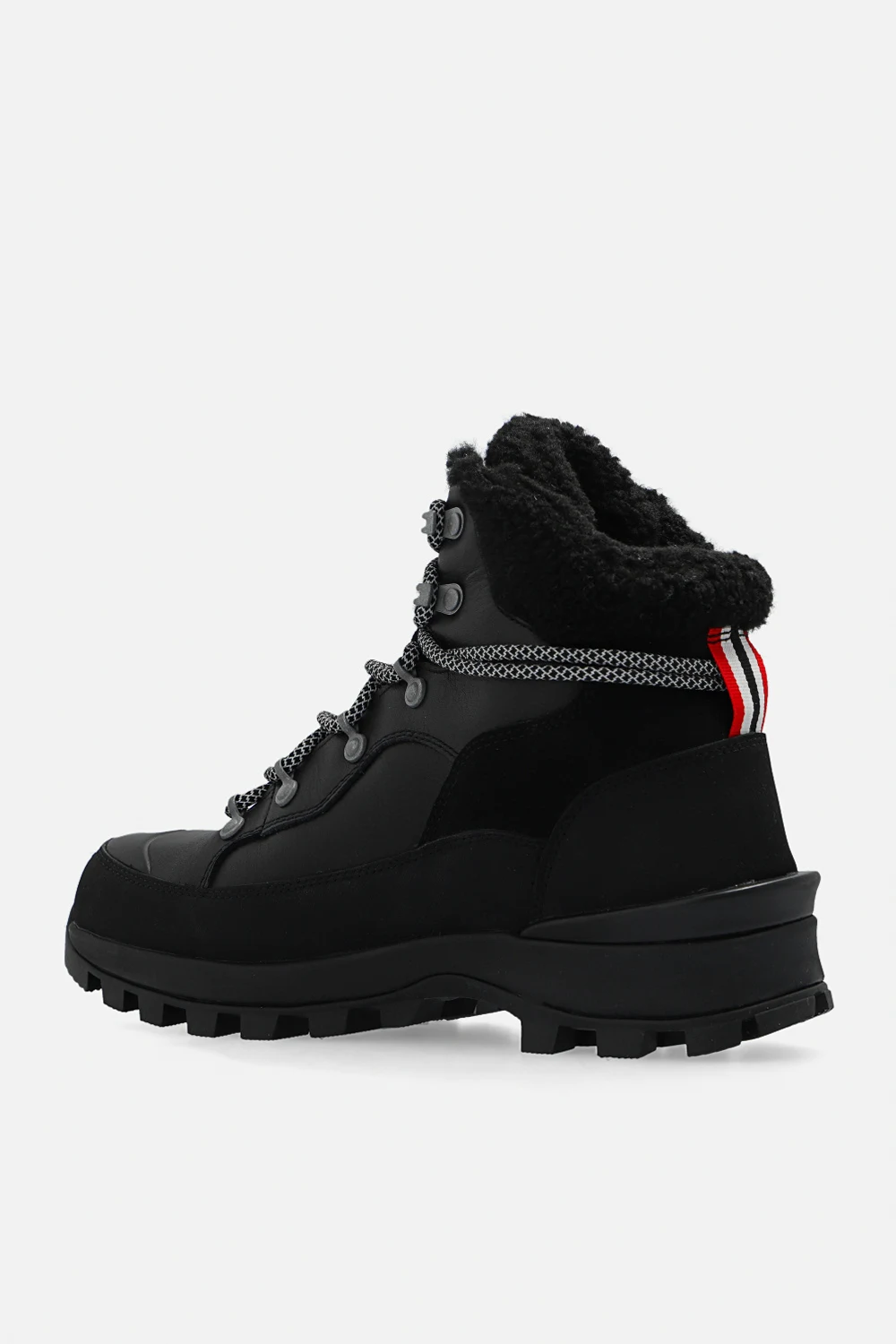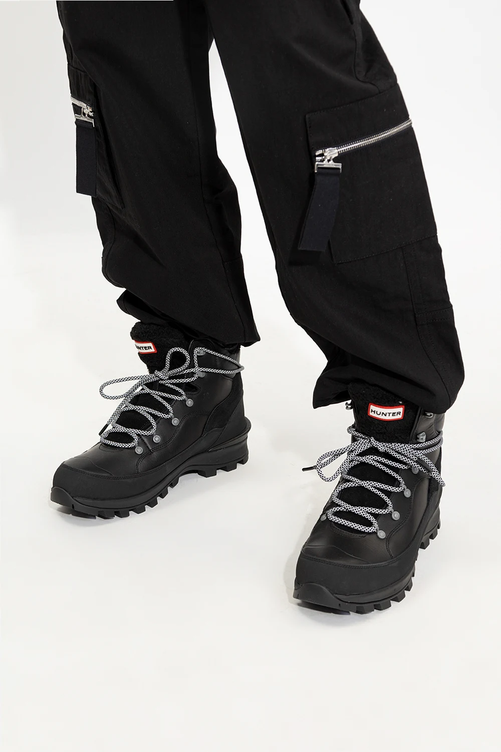Black ‘Explorer Mid’ hiking boots from Hunter. Crafted from leather and recycled nylon, this lace-up model features a logo patch, reflective shoelaces, a recycled lining and a high-grip TPU rubber midsole and outsole, which has deep tread to ensure mud release with every step. Rated to withstand temperatures as low as -20°C (-4°F).