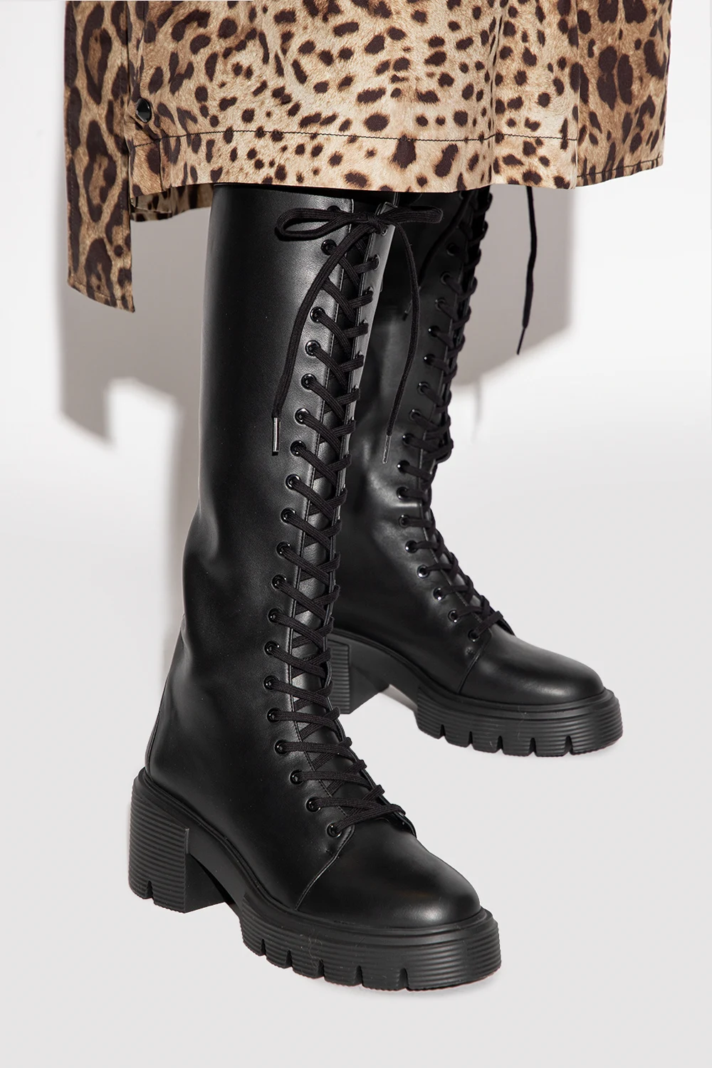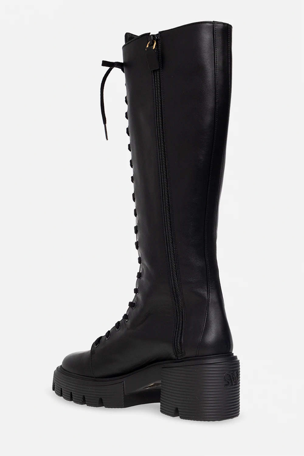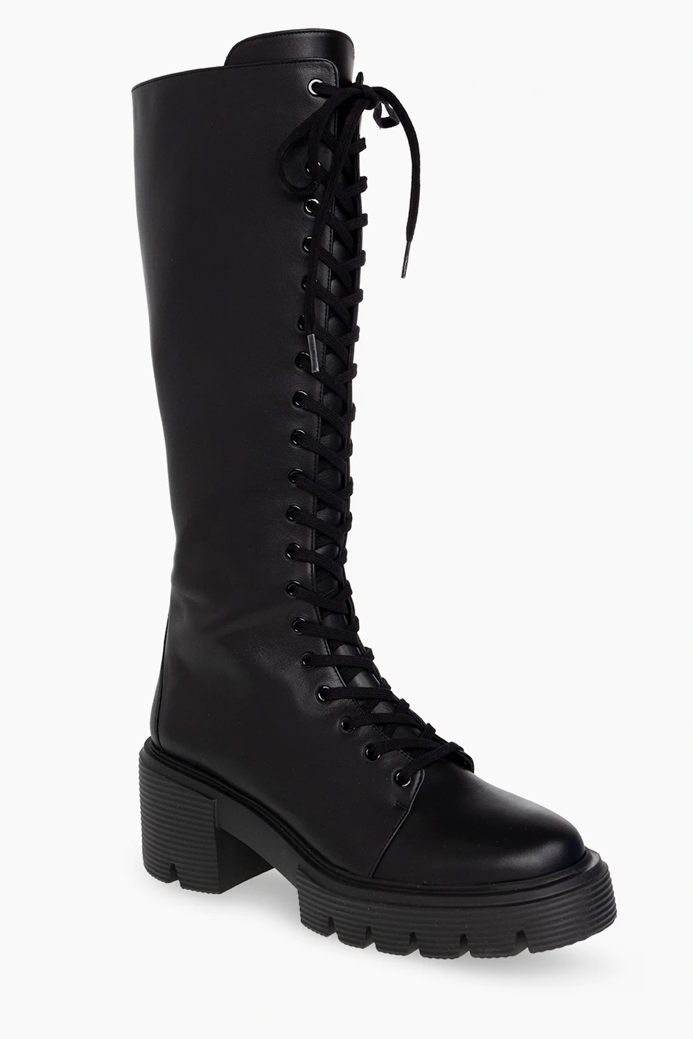 Black ‘Soho’ heeled boots from Stuart Weitzman. Crafted from leather, this lace-up model sits on a black rubber sole and features a side zipper.