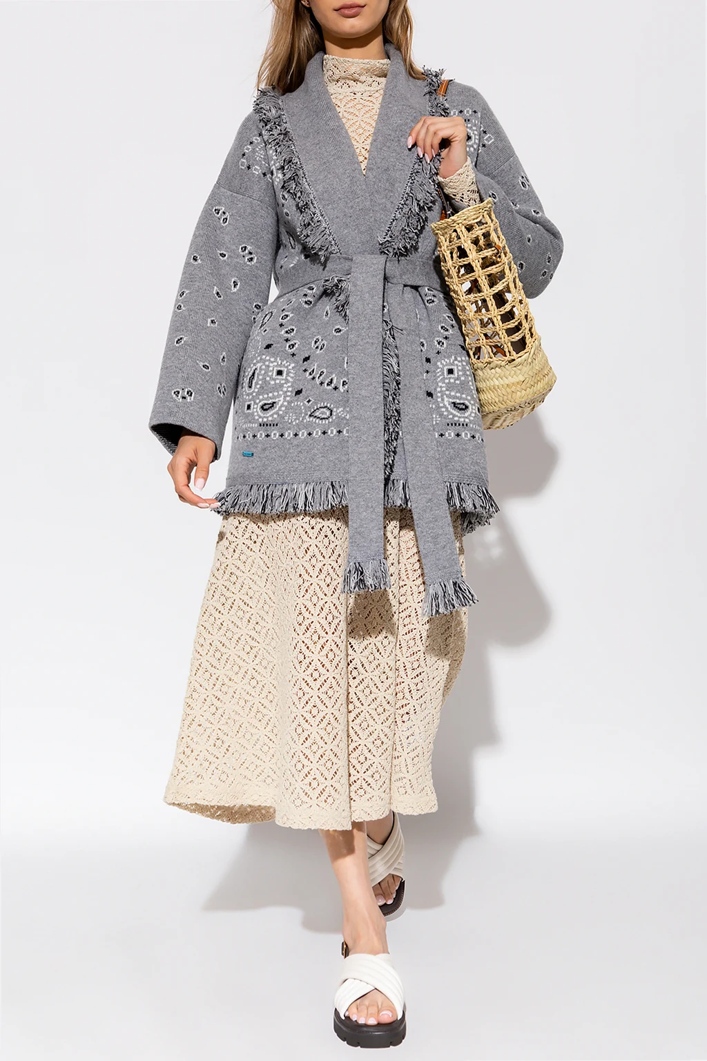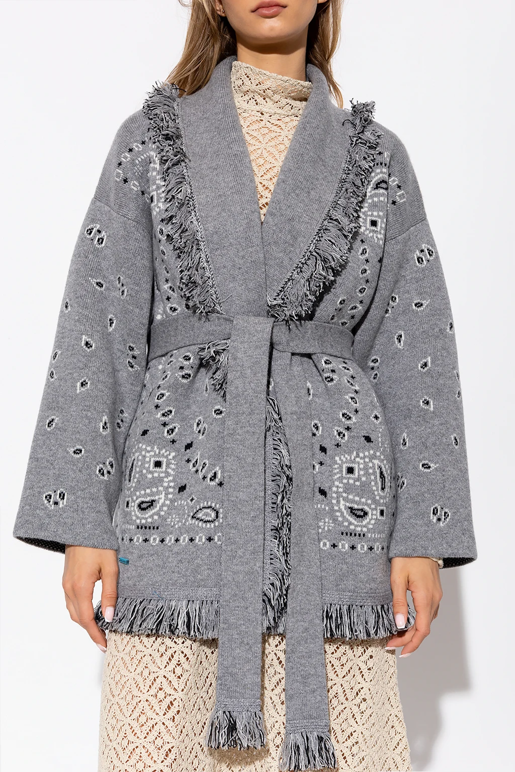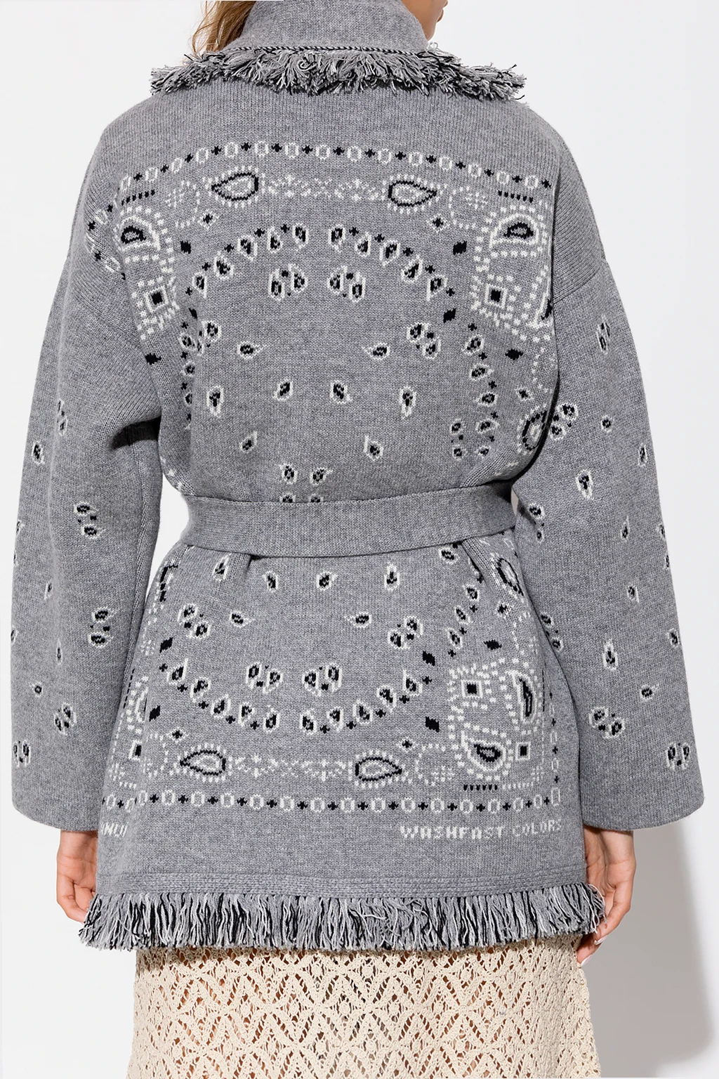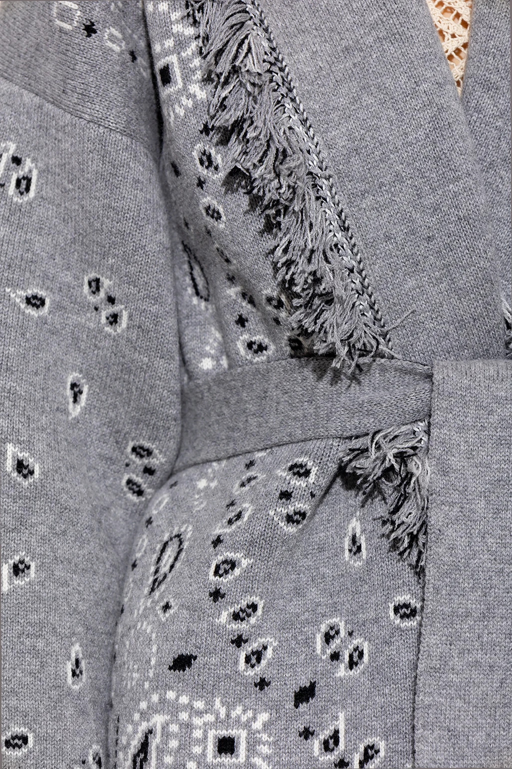 Grey ‘Bandana Jacquard Icon’ cardigan from Alanui. Crafted from cashmere with an oversize silhouette, this style showcases a white and black jacquard paisley pattern. It is complete with a shawl collar, two slip pockets, fringed trims, long sleeves and an attached belt.