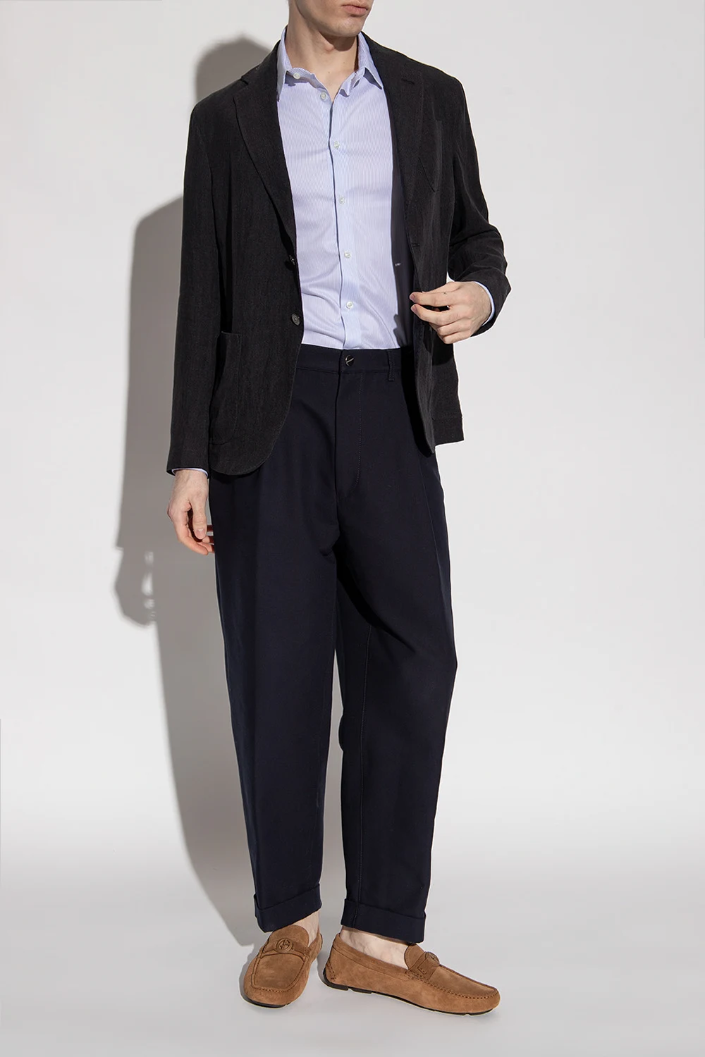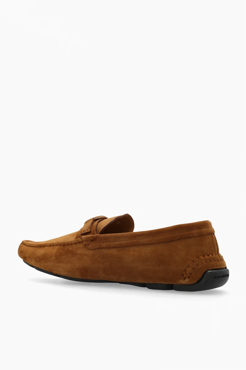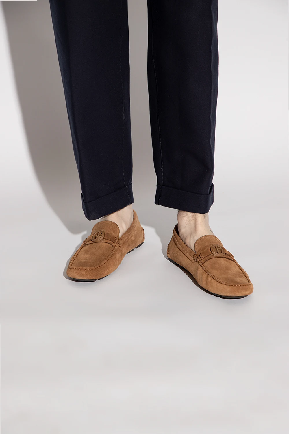 Brown moccasins from Giorgio Armani. Made of suede, this pair features a logo detail and dark brown rubber sole.