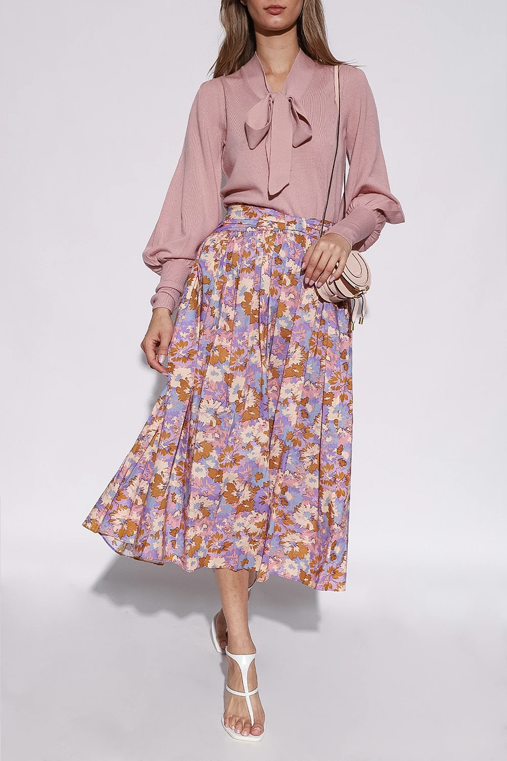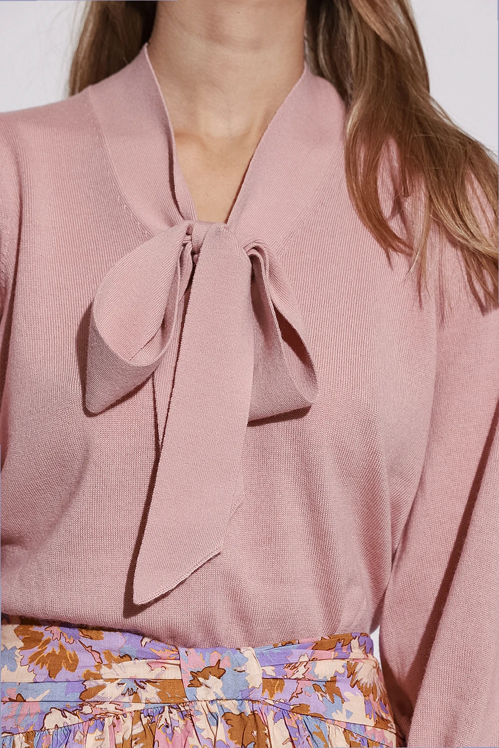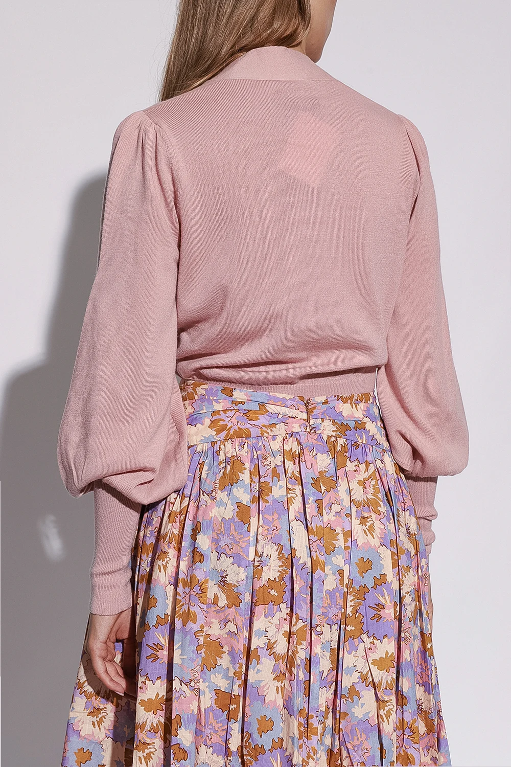 Pink sweater from Zimmermann. Crafted from merino wool, this design features a V-neck with a decorative tie neck, puff sleeves and ribbed edges.