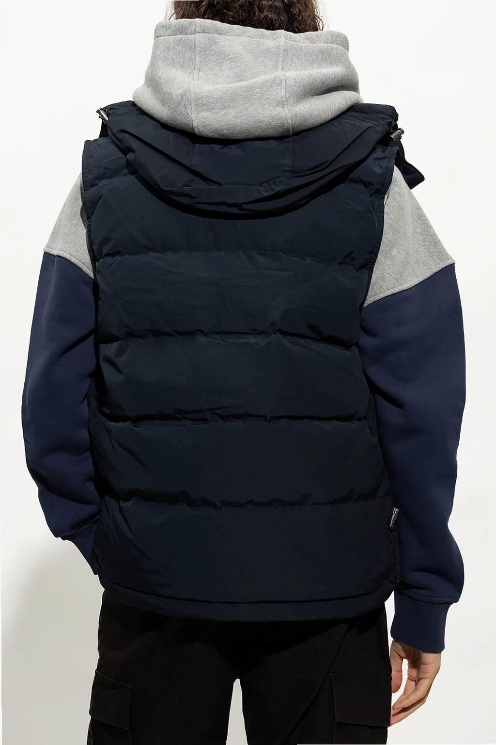 Navy ‘Aleutian’ vest from Woolrich. Fastened with a two-way zip and snaps, this design features a detachable hood, drawstrings on the sides, logo embroidery and four snap-fastened pockets – two with flaps.