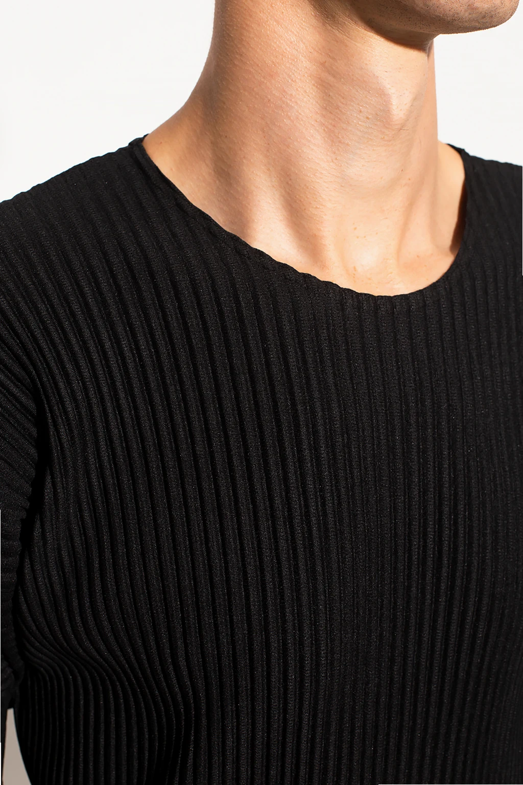 Black pleated T-shirt from Issey Miyake Homme Plisse. This crewneck design is enriched by stitching details.