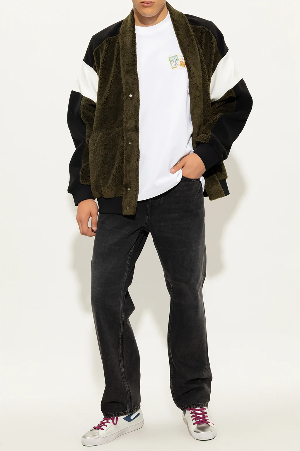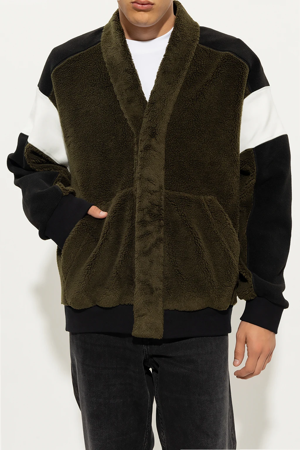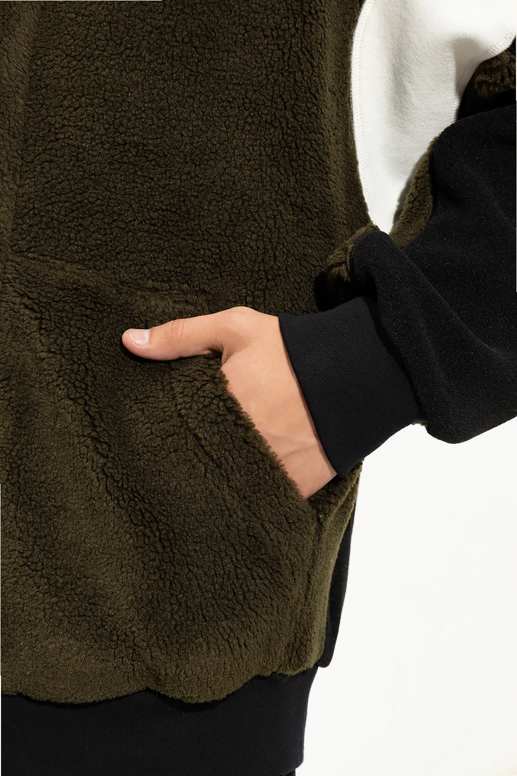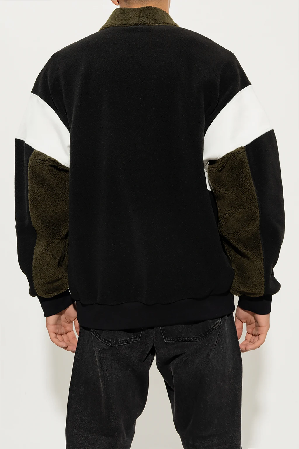 Black, white and dark green fleece sweatshirt from Ambush. Fastened with snaps, this V-neck design features two slip pockets and ribbed edges.