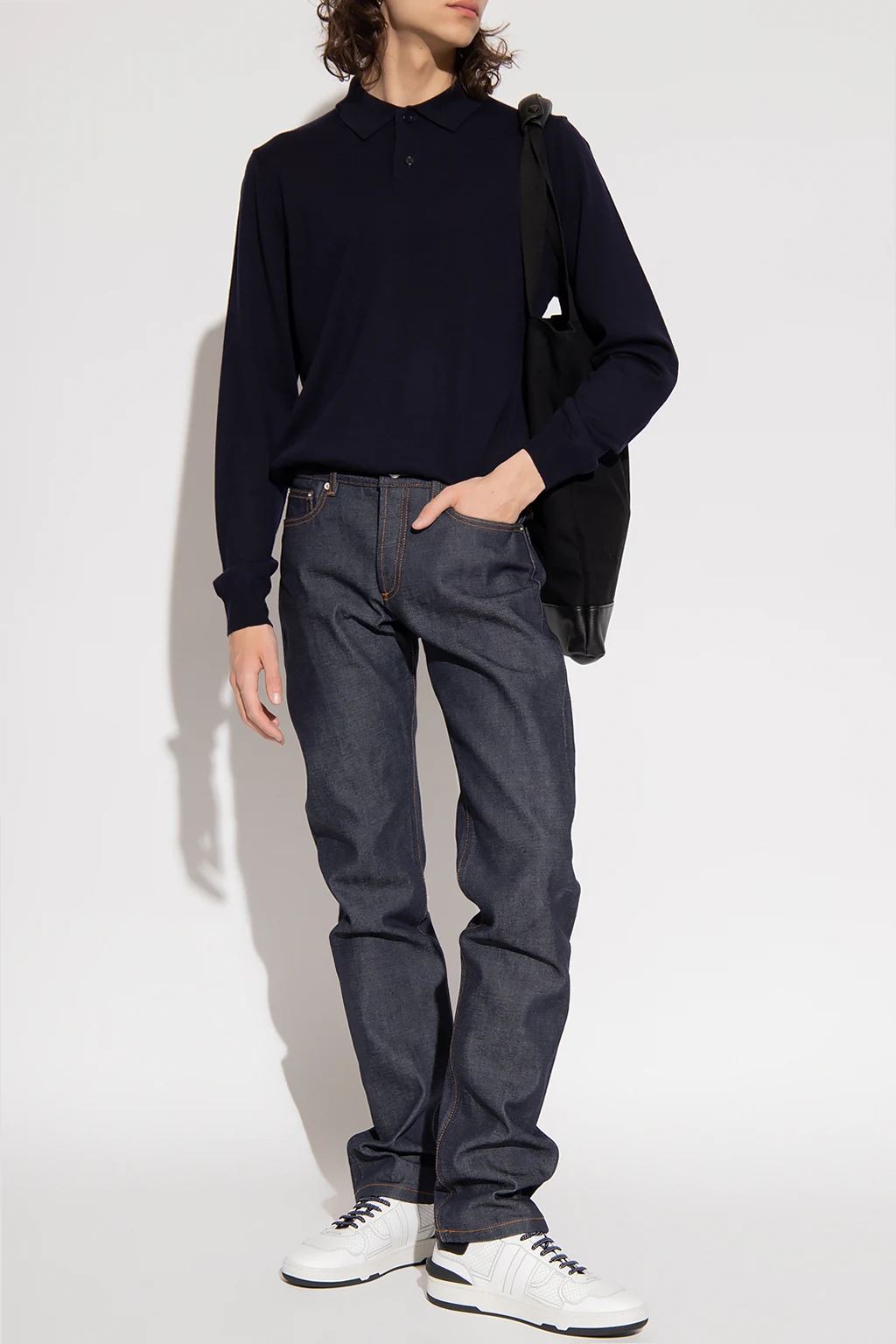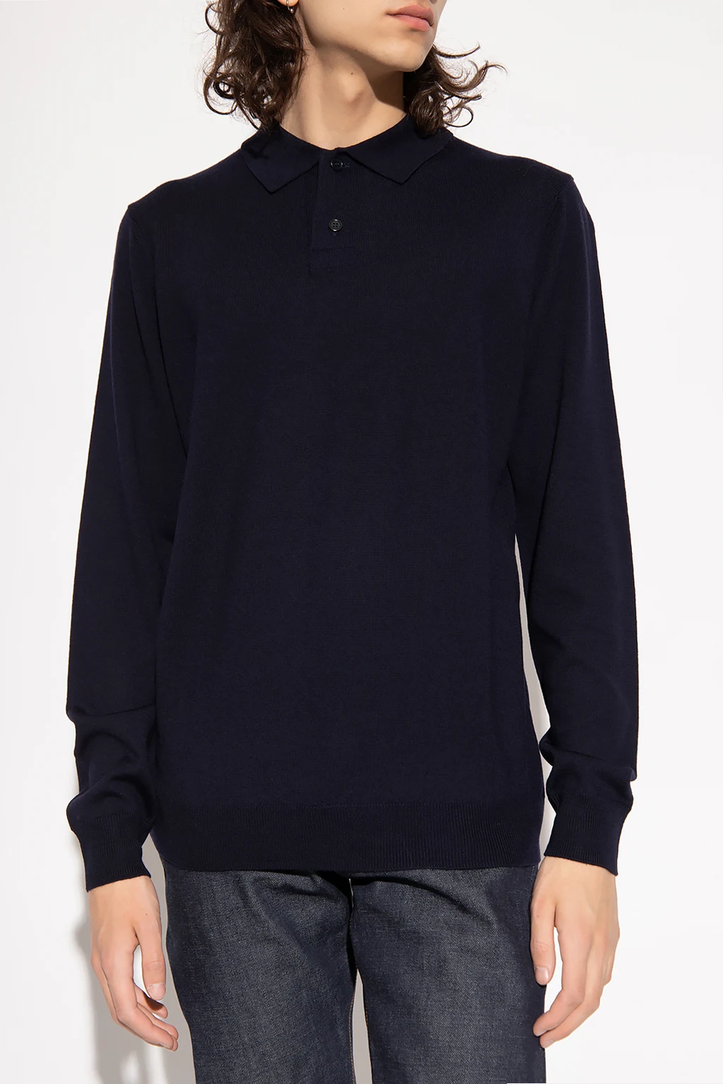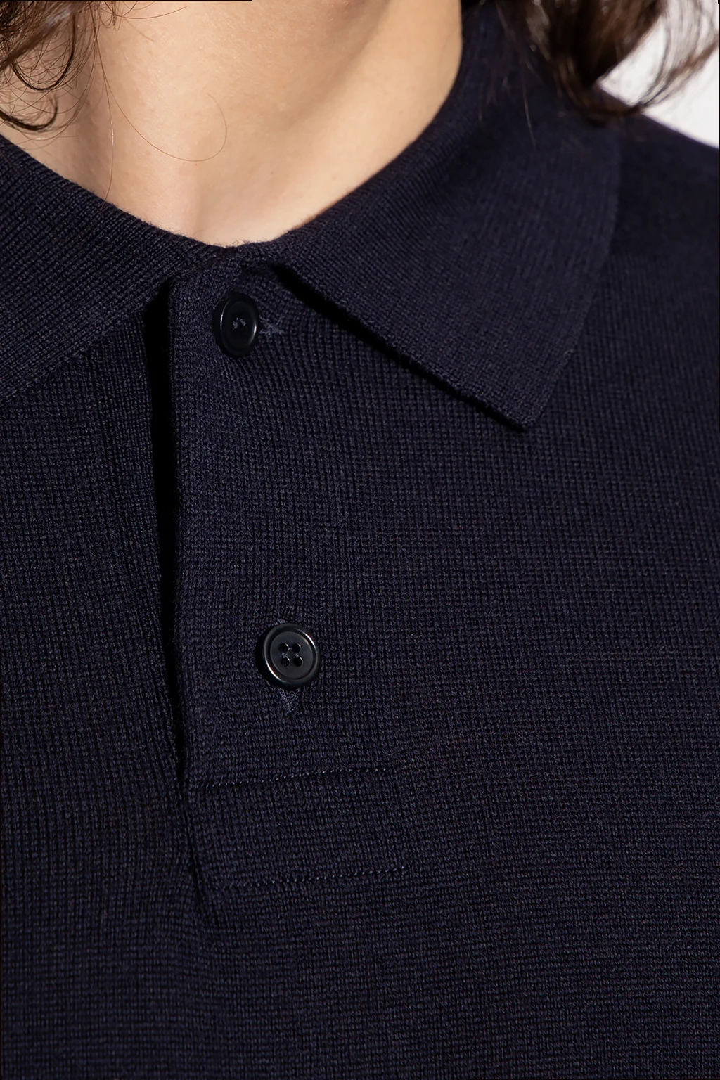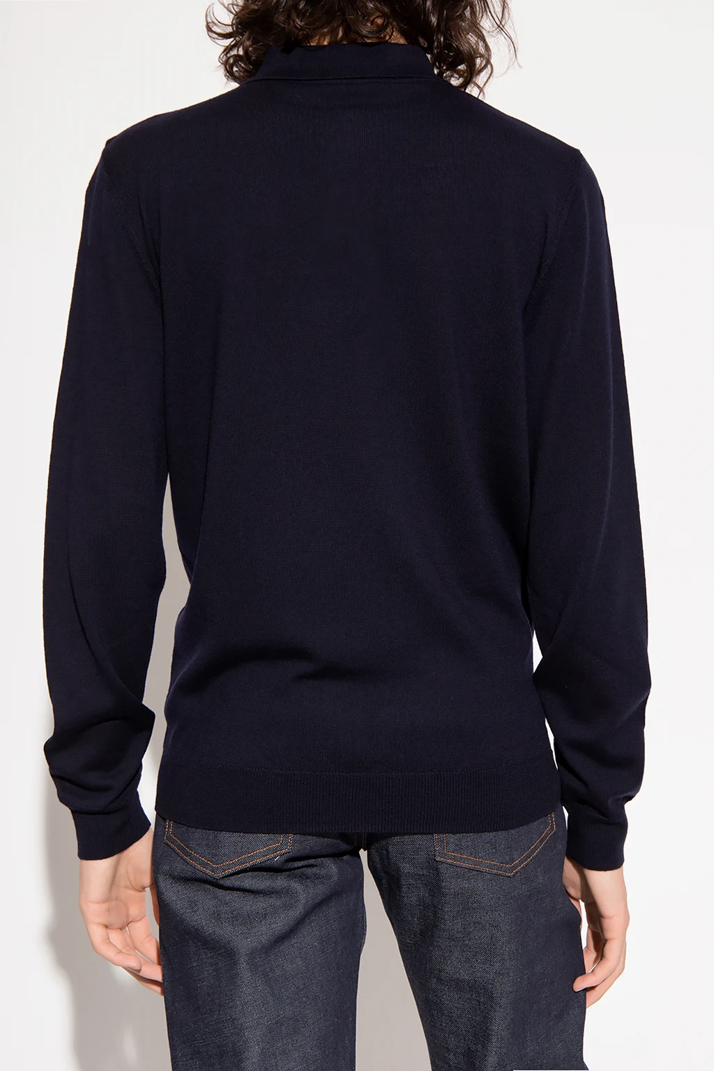 Navy polo shirt from A.P.C. Made of wool, this long sleeve design features a collar with button fastenings and ribbed trims at the hem and cuffs.