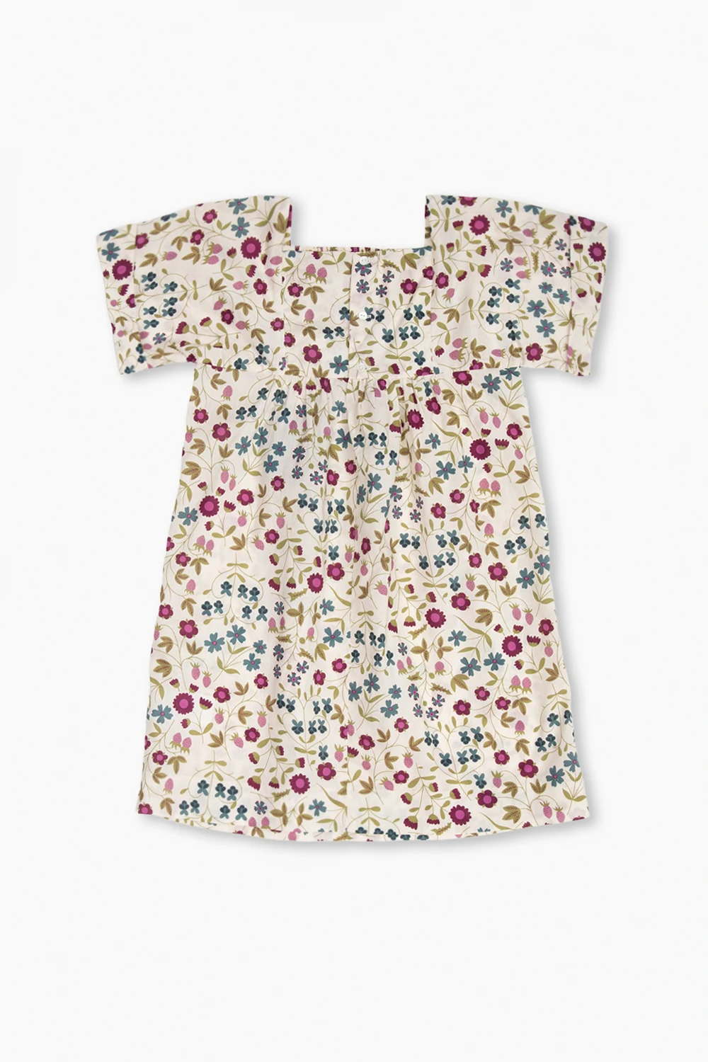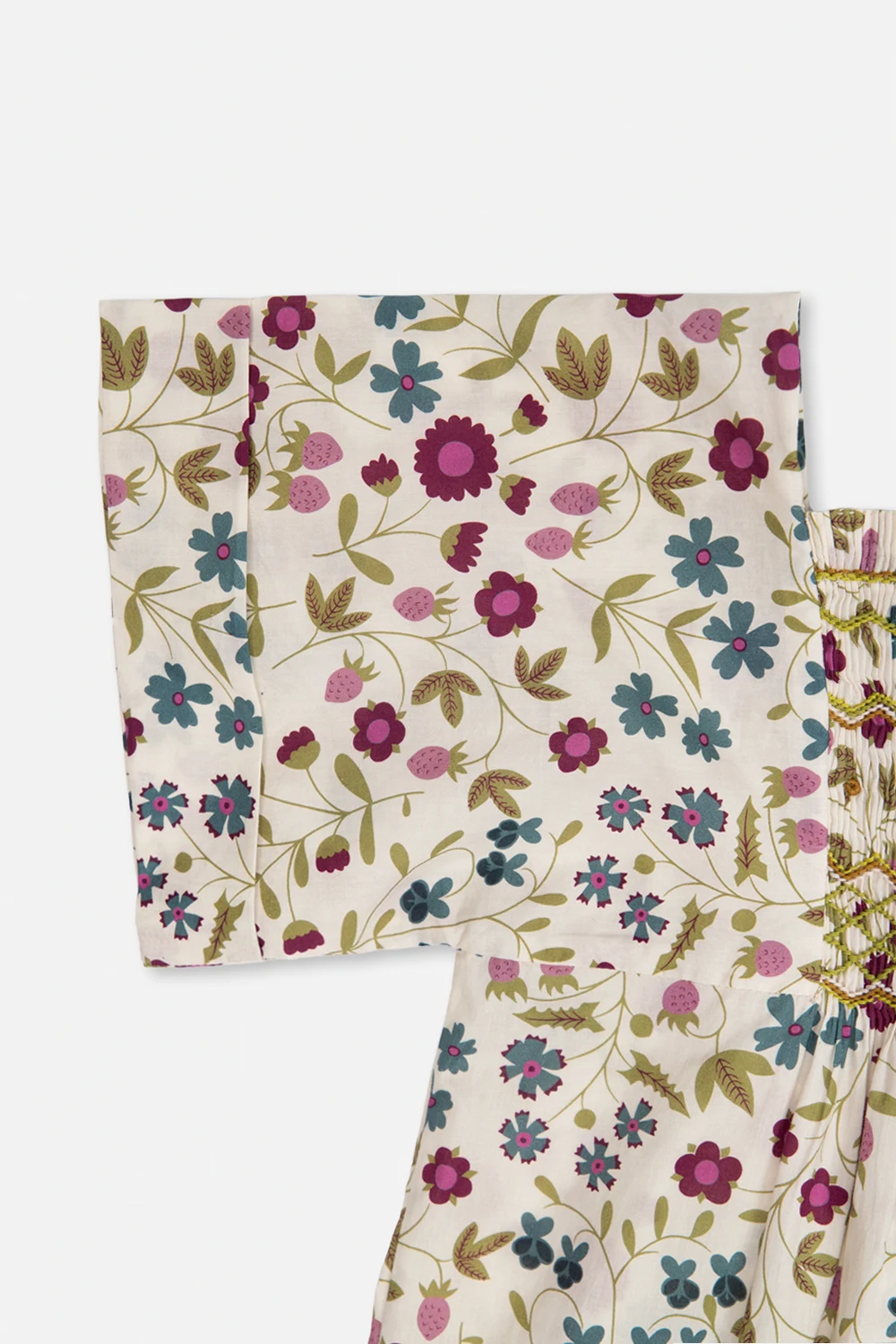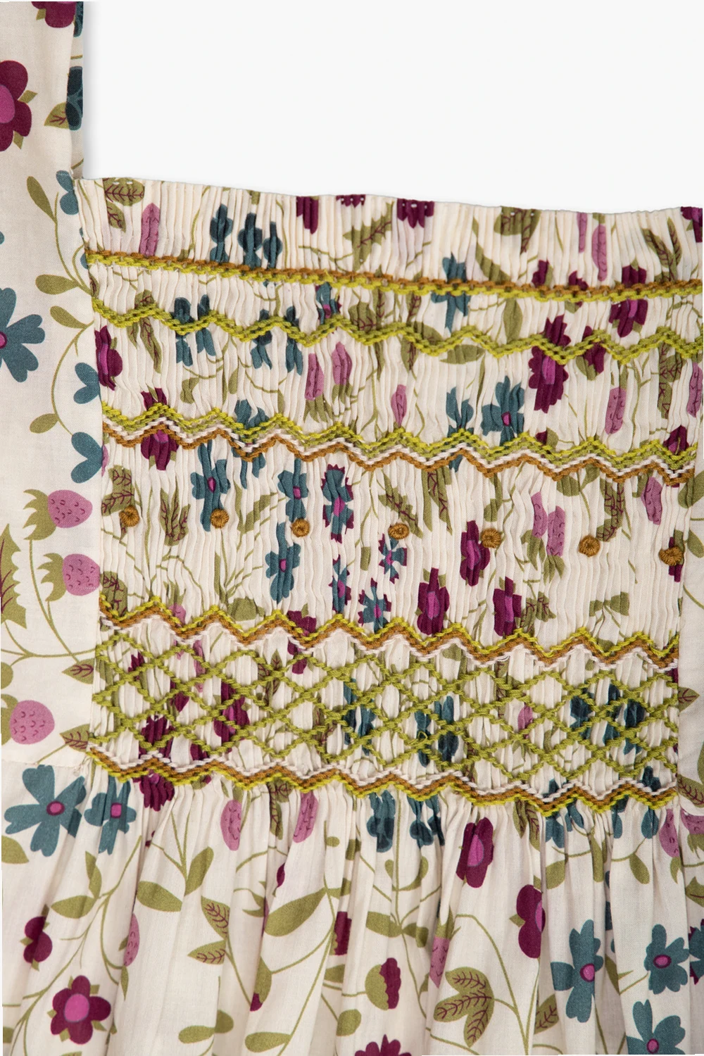 Cream ‘Paybanne’ dress from Bonpoint. Crafted from Liberty cotton, this style fastens with back buttons and showcases a colourful floral pattern. It is complete with a square neckline with gathers and graphic embroidery, short sleeves with rolled-up cuffs and a flared hem.