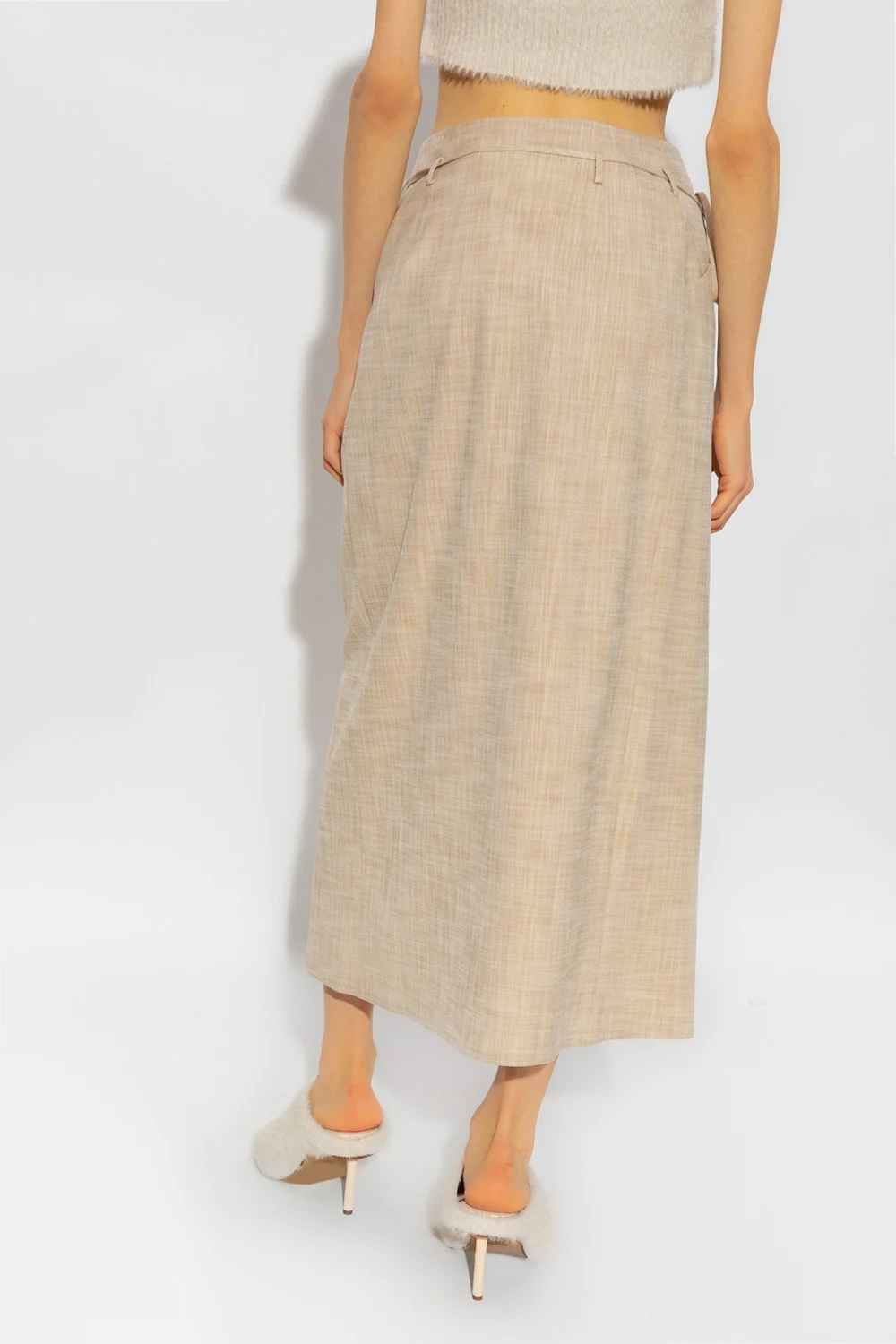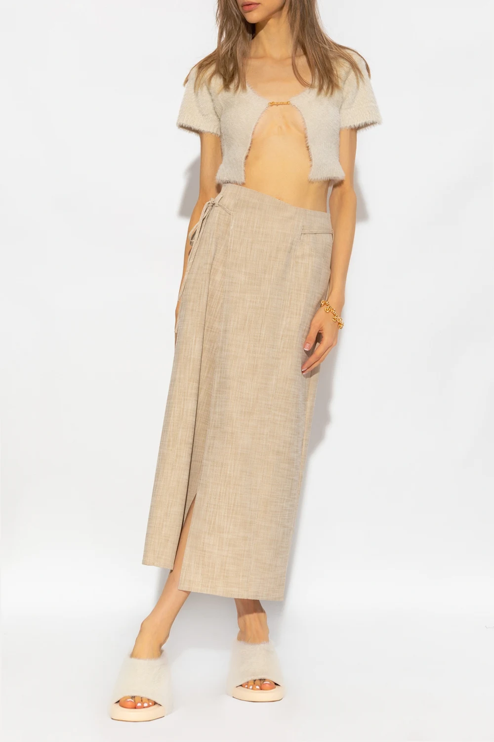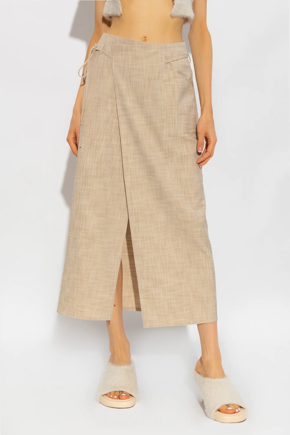 Beige ‘Amaya’ skirt from Cult Gaia. Cinched with drawstrings, this style features front button closures and two slip pockets.
