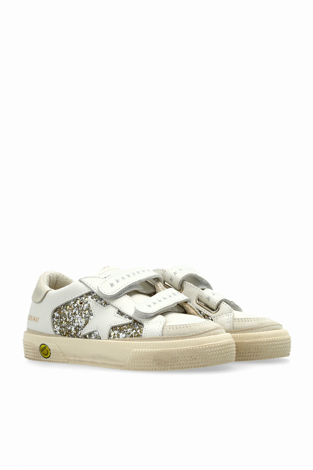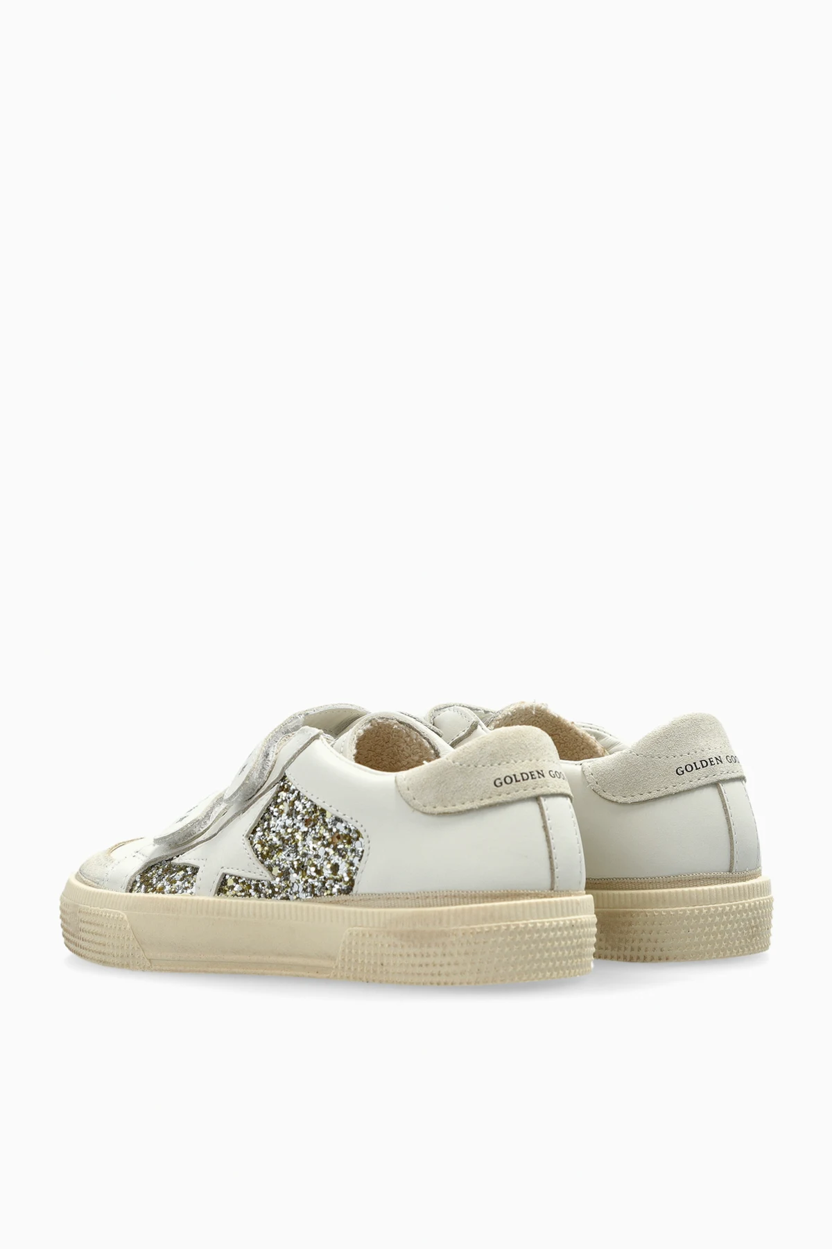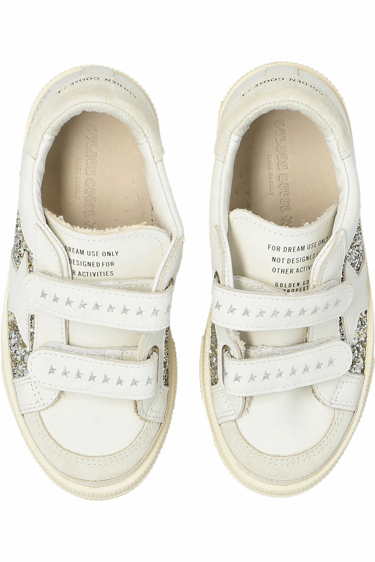 Introducing the May School Double Quarter And Toe, an exquisite addition to the exclusive Golden Goose Kids collection. These children\'s sneakers boast a classic low-top silhouette crafted from pristine white leather, adorned with shimmering elements that form a star pattern on the side panels. The double velcro straps are embellished with star-shaped decorative details, enhancing their unique appeal. Each pair features the distinct \"5000WAY\" inscription and the iconic \"GOLDEN GOOSE\" logo printed on the heel, exuding an air of sophistication and luxury. The beige rubber sole not only offers superior comfort but also imparts a stylish flair, making these sneakers a versatile choice for any occasion. Golden Goose, a prestigious Italian brand, is renowned for its leather sneakers and ready-to-wear collections, characterized by the signature star motif and a unique distressed finish. The brand\'s dedication to traditional craftsmanship and global inspiration is evident in these sneakers, combining elegance with the playful essence of children\'s fashion. Why choose this product? Exquisite Italian craftsmanship from Golden Goose. Unique star embellishments and logo detailing. Versatile design perfect for various occasions. Comfortable, durable rubber sole.