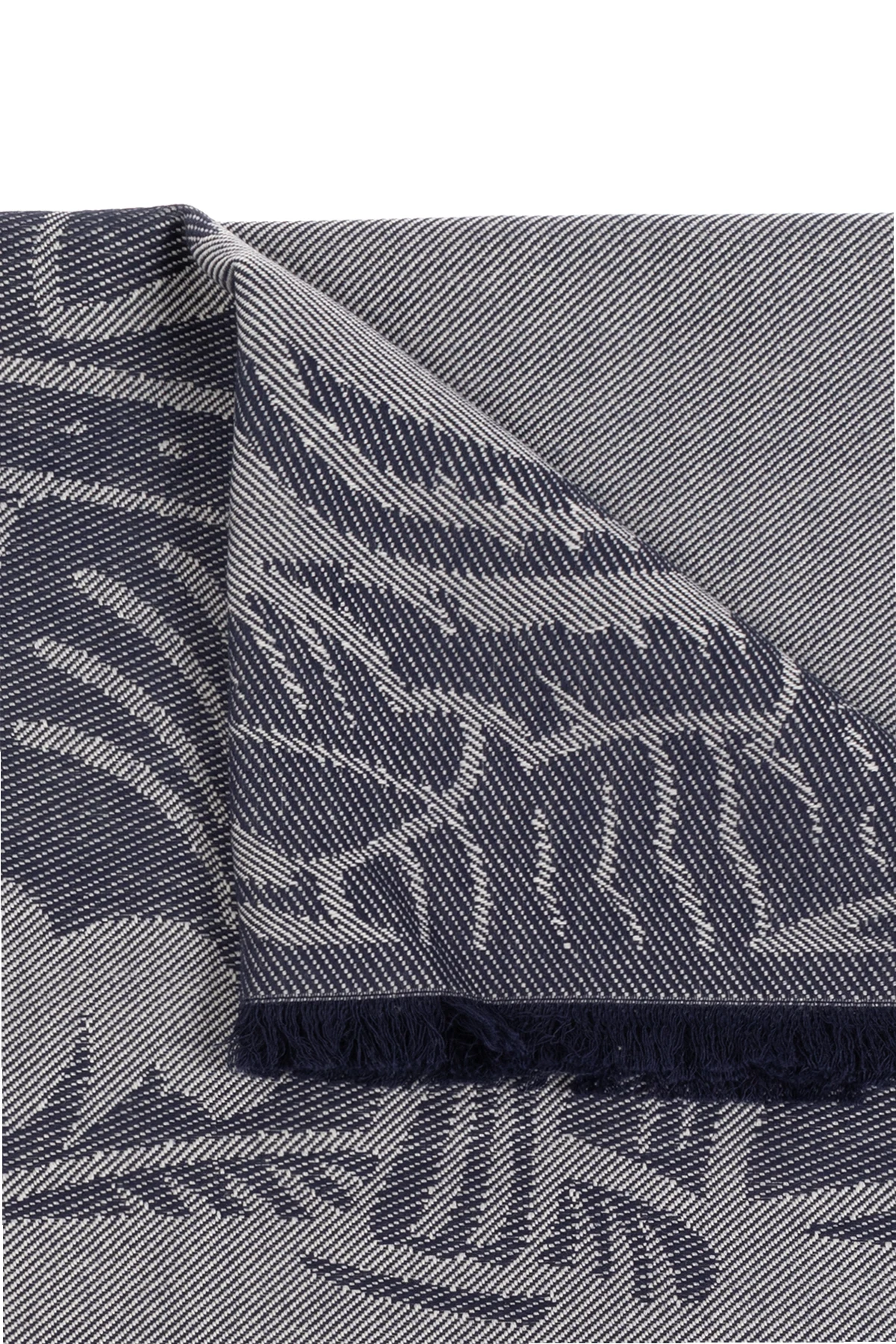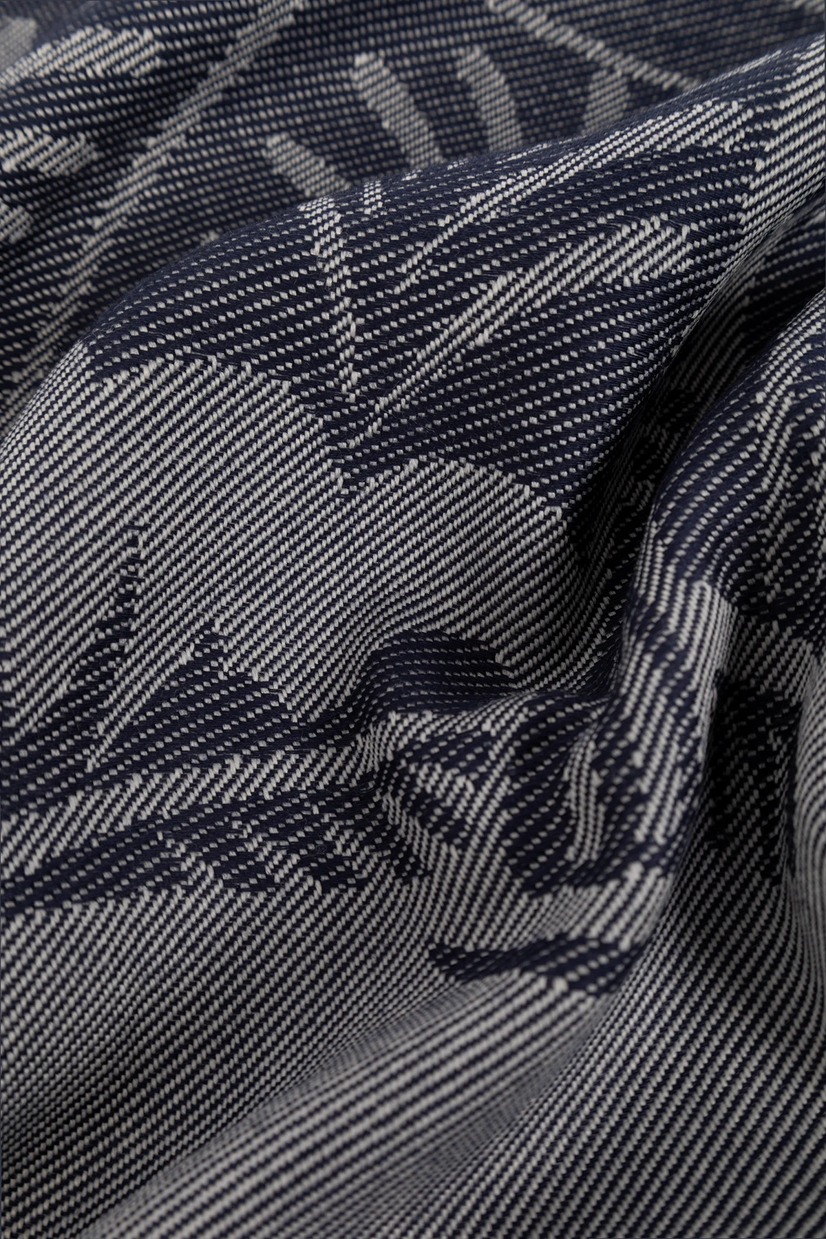 Navy blue and white scarf from Burberry. Made from a wool, cotton and cashmere blend, this item showcases a jacquard ‘Equestrian Knight’ pattern and frayed ends.
