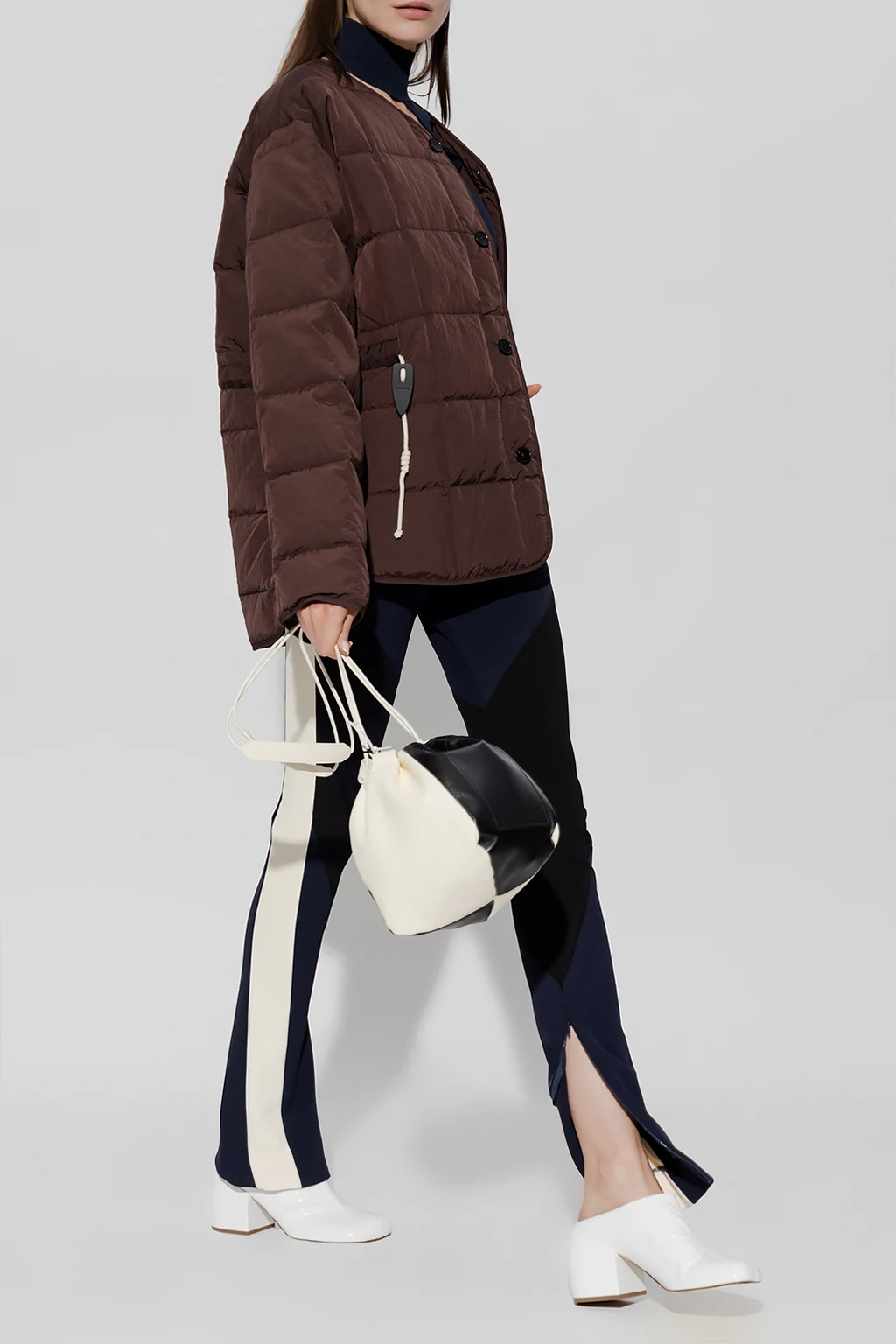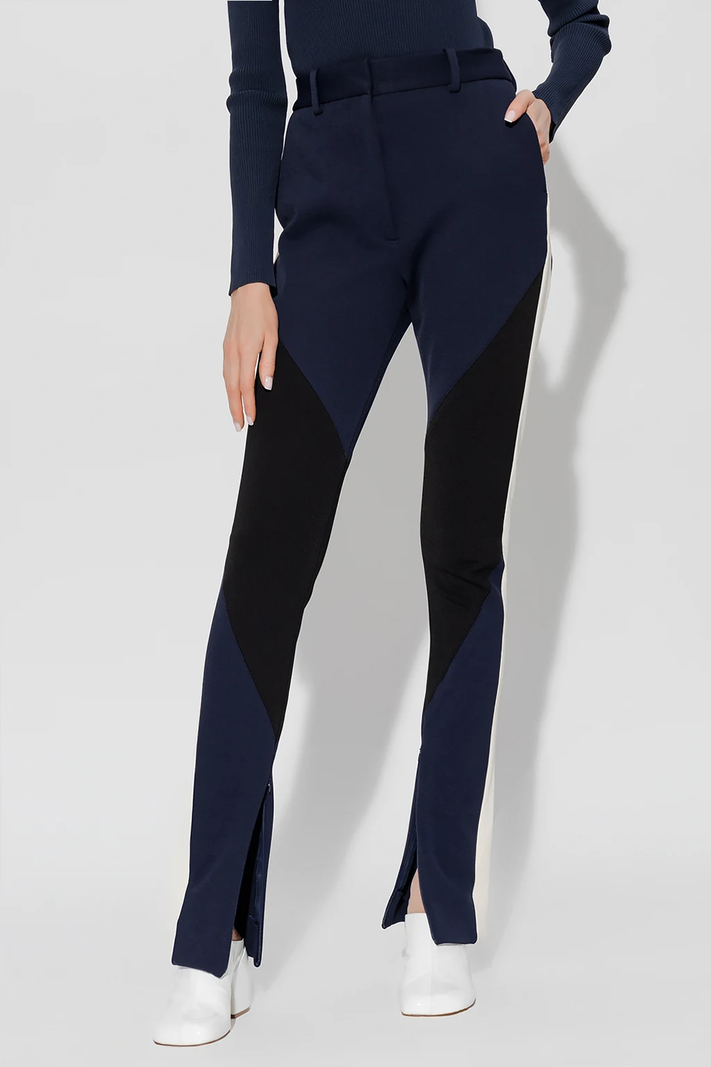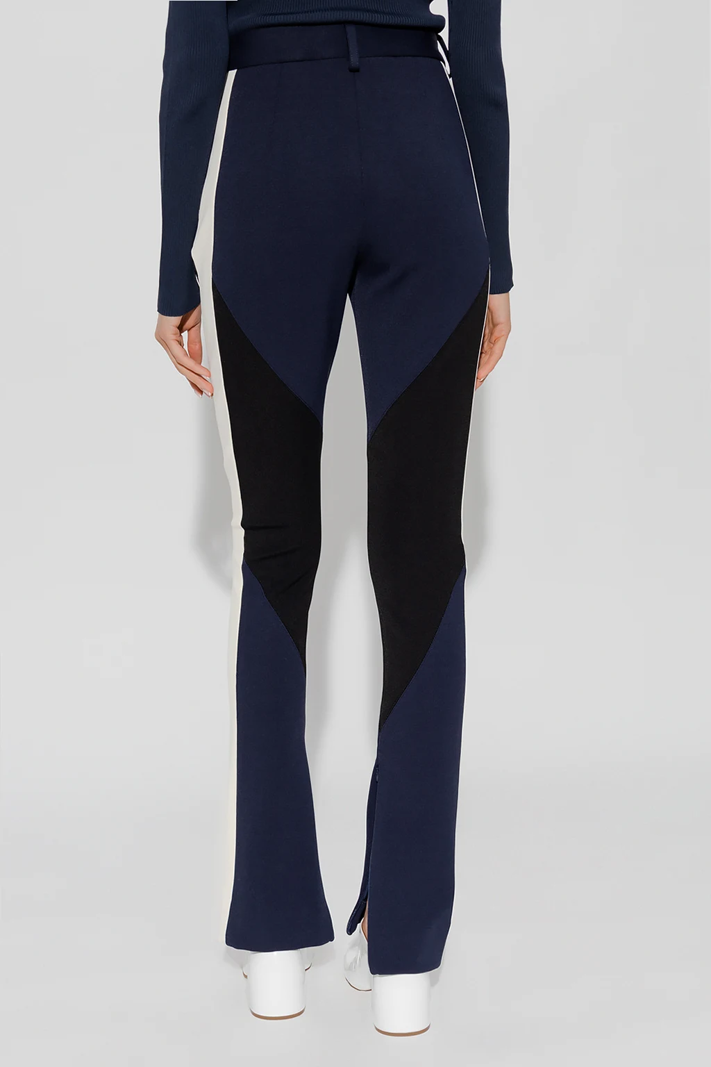 Navy blue, black and white trousers from Victoria Beckham. Falling with tapered legs, this pair features a high-rise waist, a zip fly with a button and a hook, two frontal pockets and zipped cuffs.