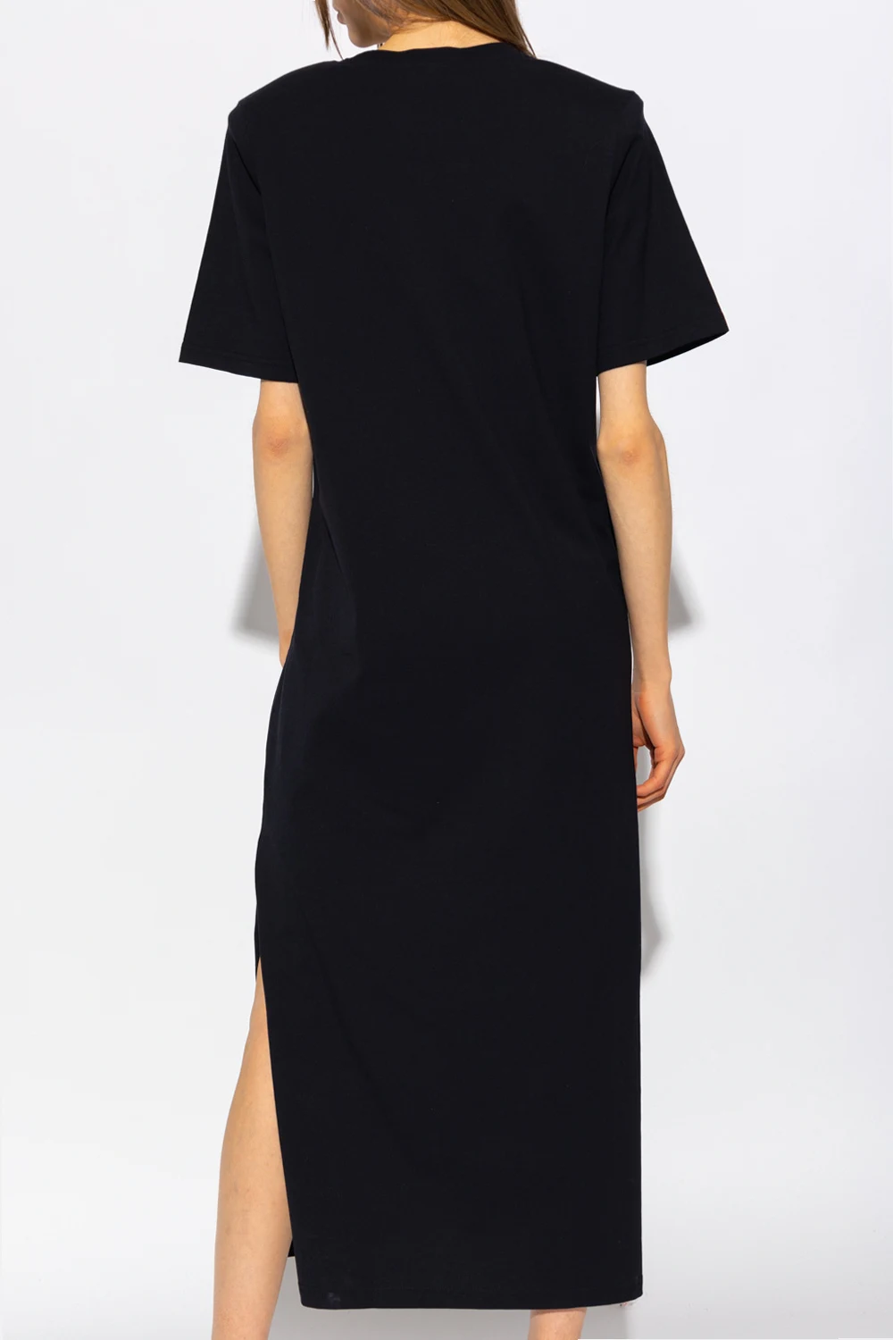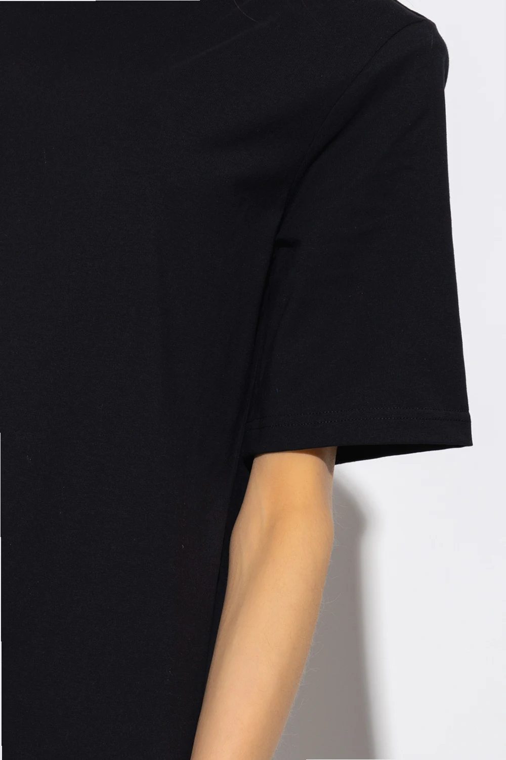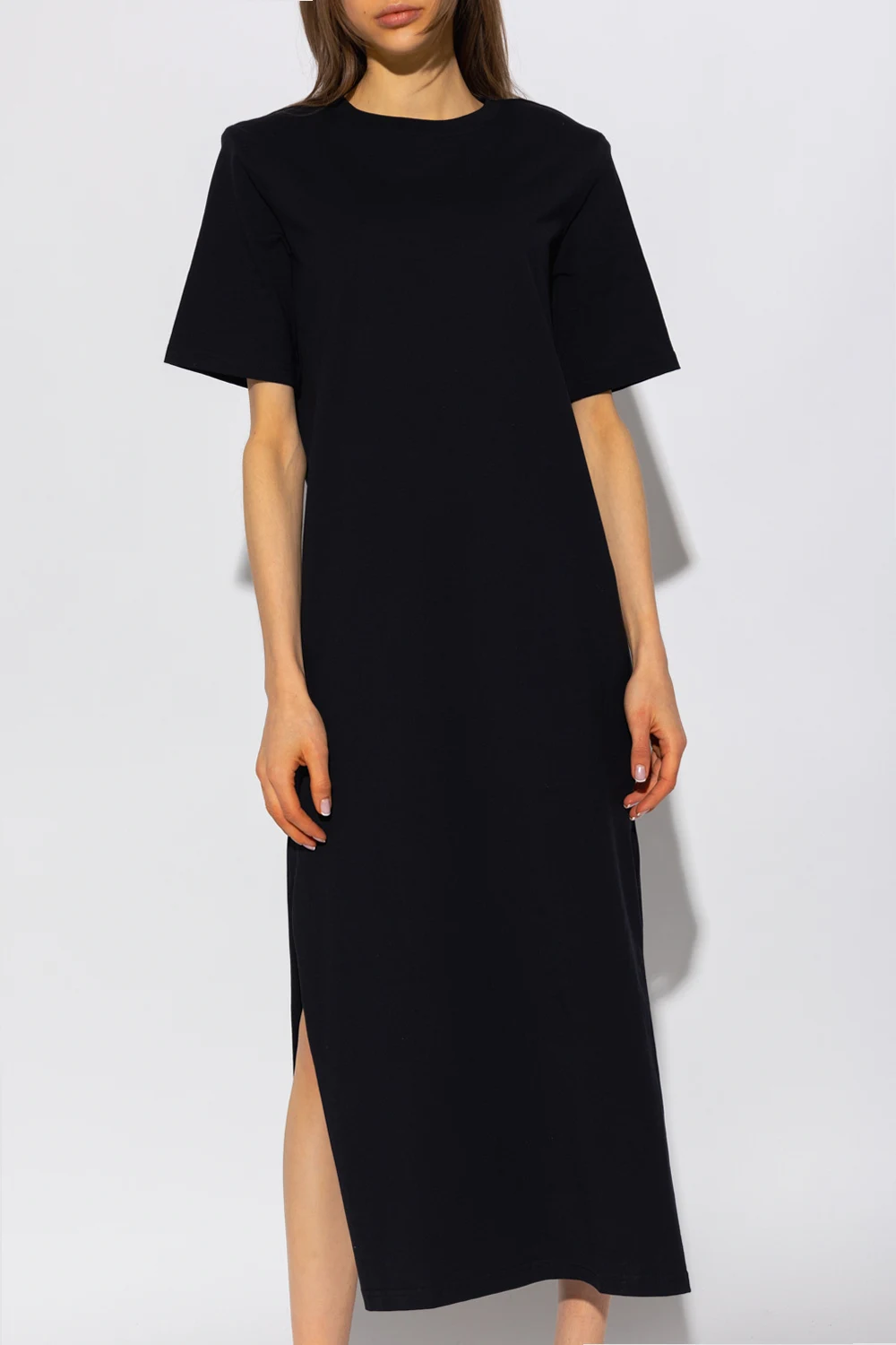 Black ‘Jannet’ midi T-shirt dress from Birgitte Herskind. Crafted from organic cotton with a relaxed fit, this style features an elasticated collar, side slits, padded shoulders and short sleeves.