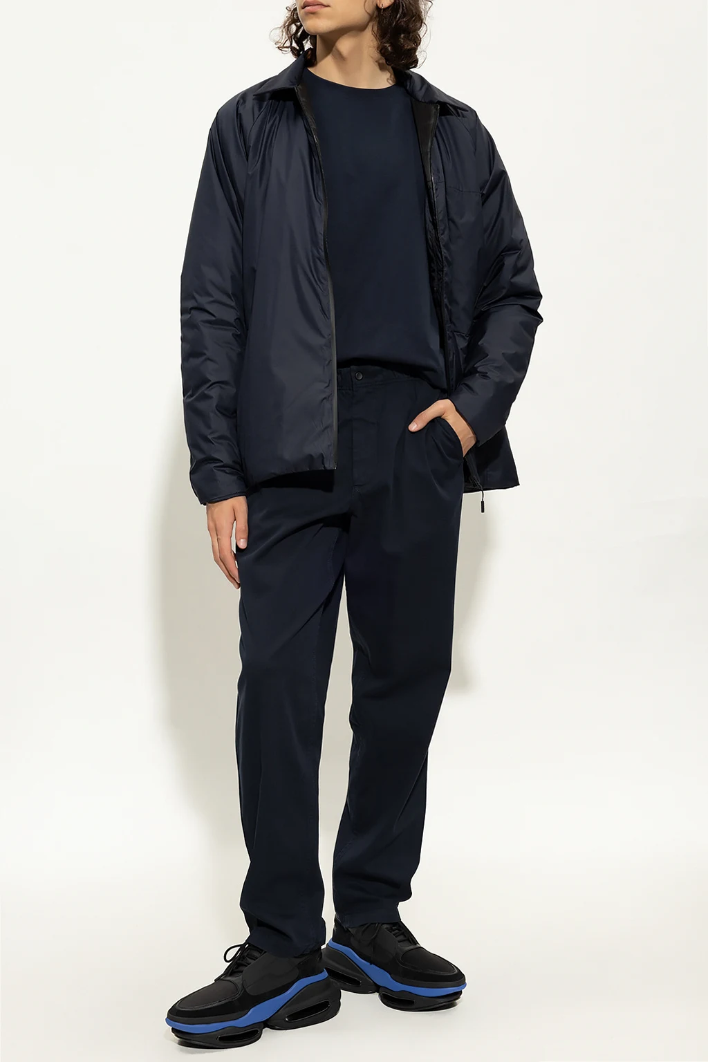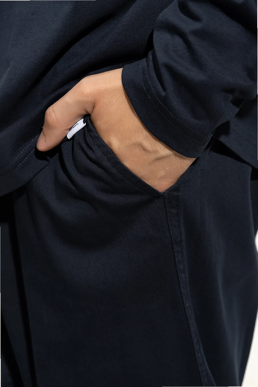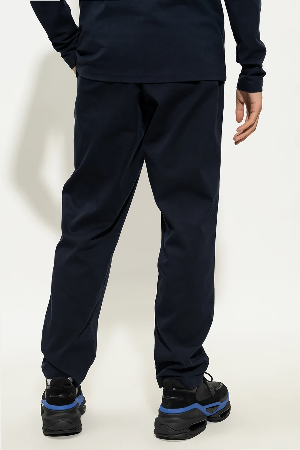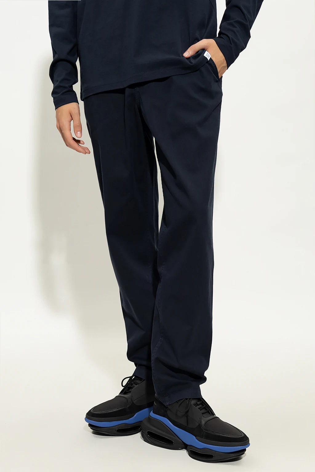 Navy blue ‘Ezra’ trousers from Norse Projects. Crafted from cotton, this pair falls with tapered legs and features a drawstring waistband accompanied by a zip fly with a button, two front slip pockets and two back slip pockets.