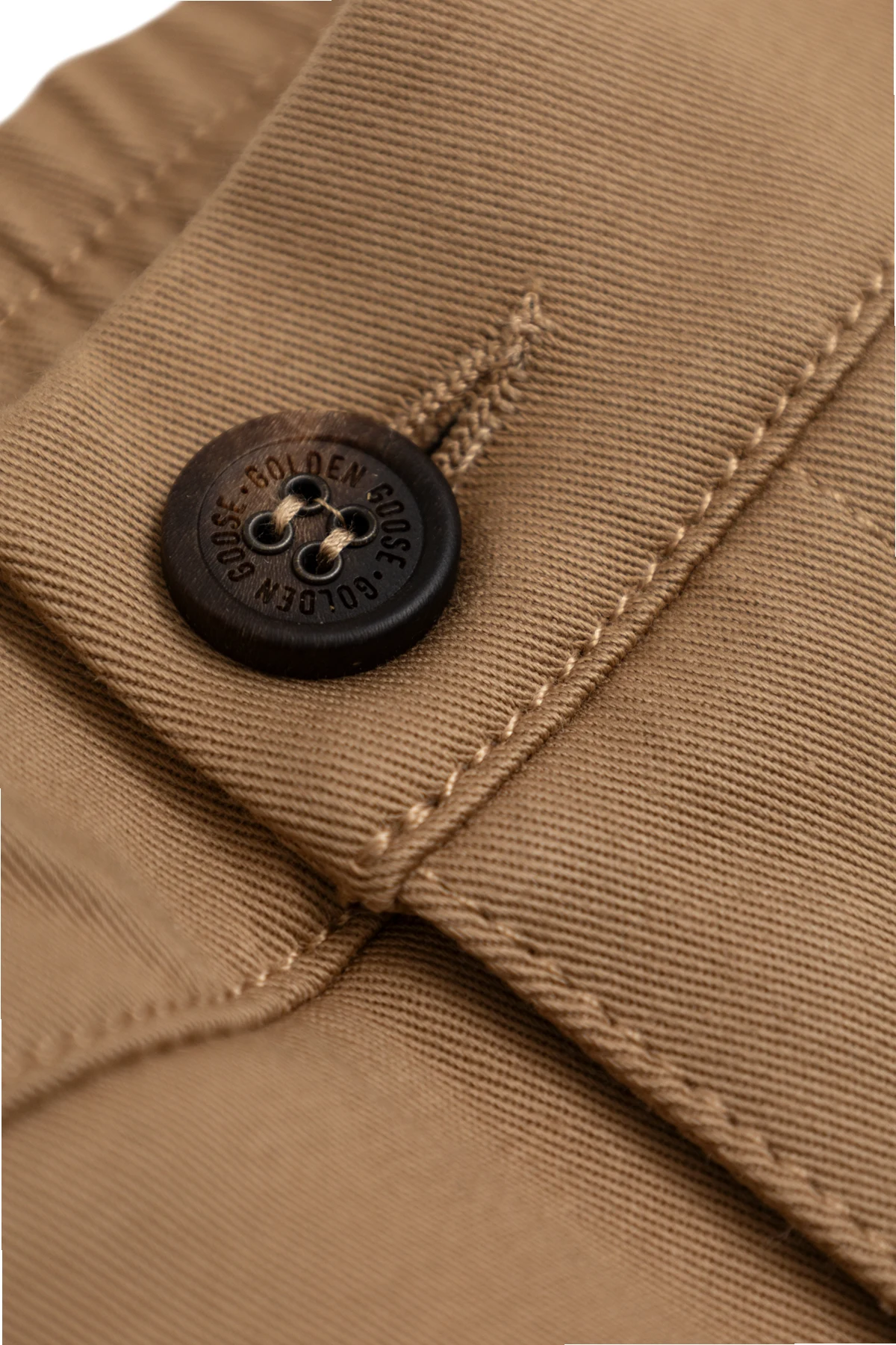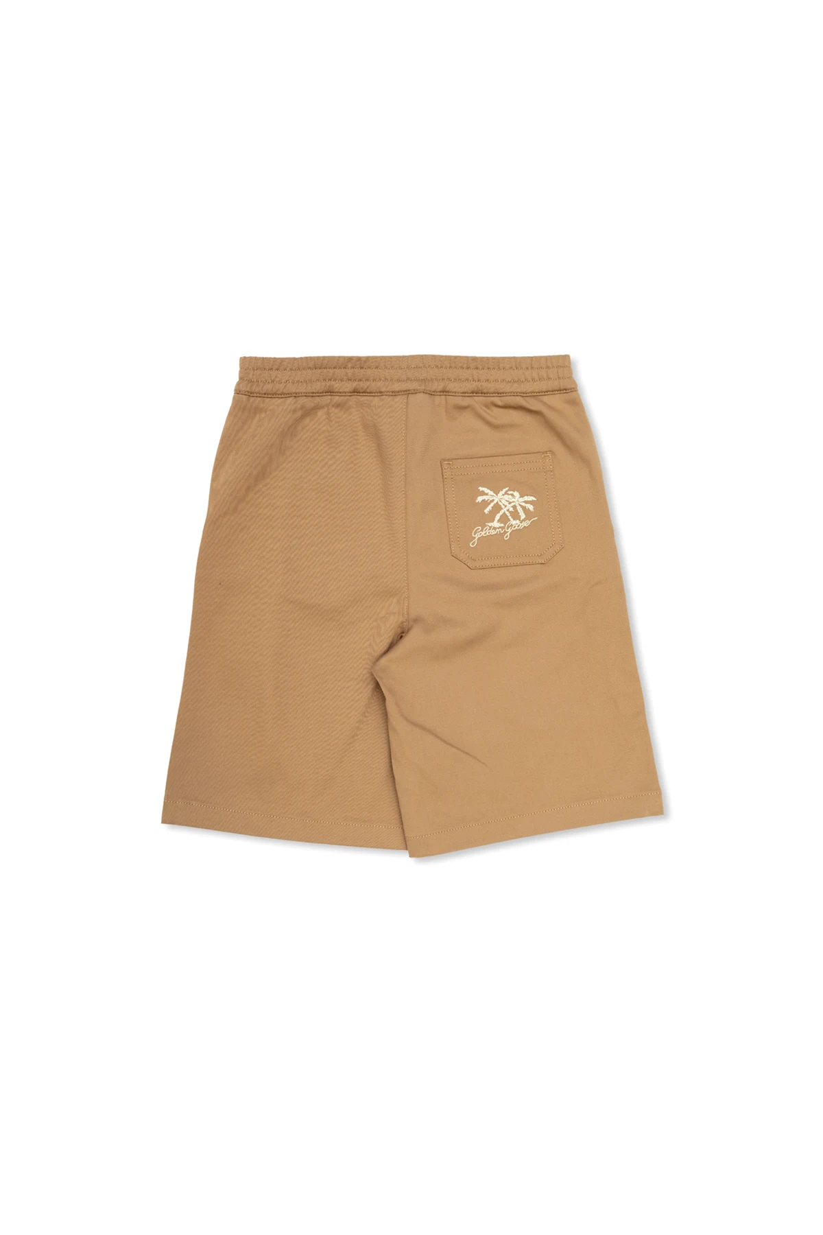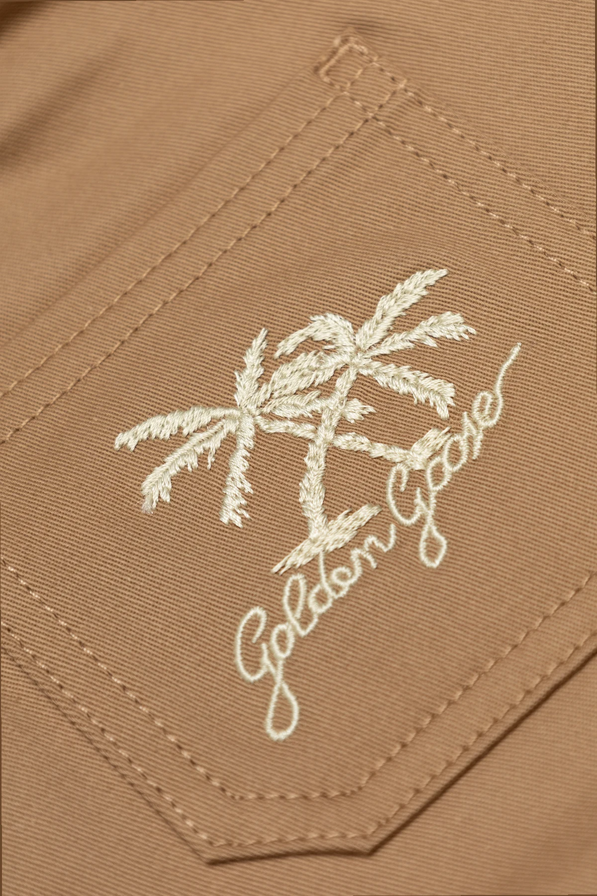 Introducing the Beige Embroidered Logo Shorts from the exquisite Golden Goose Kids collection. These shorts epitomize the harmonious blend of Italian luxury with playful sophistication, designed to captivate the discerning eye. Crafted from a smooth blend of cotton and elastane, these shorts offer a classic silhouette adorned with a dark button inscribed with \"Golden Goose\" for a touch of elegance. The zip and button closure ensures a comfortable yet refined fit. The rear pocket, embellished with a charming embroidery of two palm trees and the iconic \"Golden Goose\" script, is a testament to the meticulous craftsmanship synonymous with the brand. Each seam is expertly finished, underscoring the premium quality and attention to detail. Why Choose This Product? Exclusive design with exquisite embroidery High-quality material for superior comfort Iconic branding from a renowned luxury label Perfectly balanced between elegance and playful style