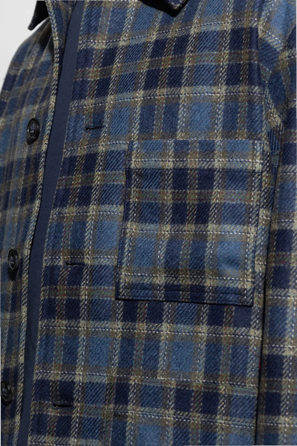 Navy, blue and grey ‘New Emile’ shirt jacket from A.P.C. Crafted from a wool blend, this design features button fastenings, a check pattern, three slip pockets and long sleeves with buttoned cuffs.