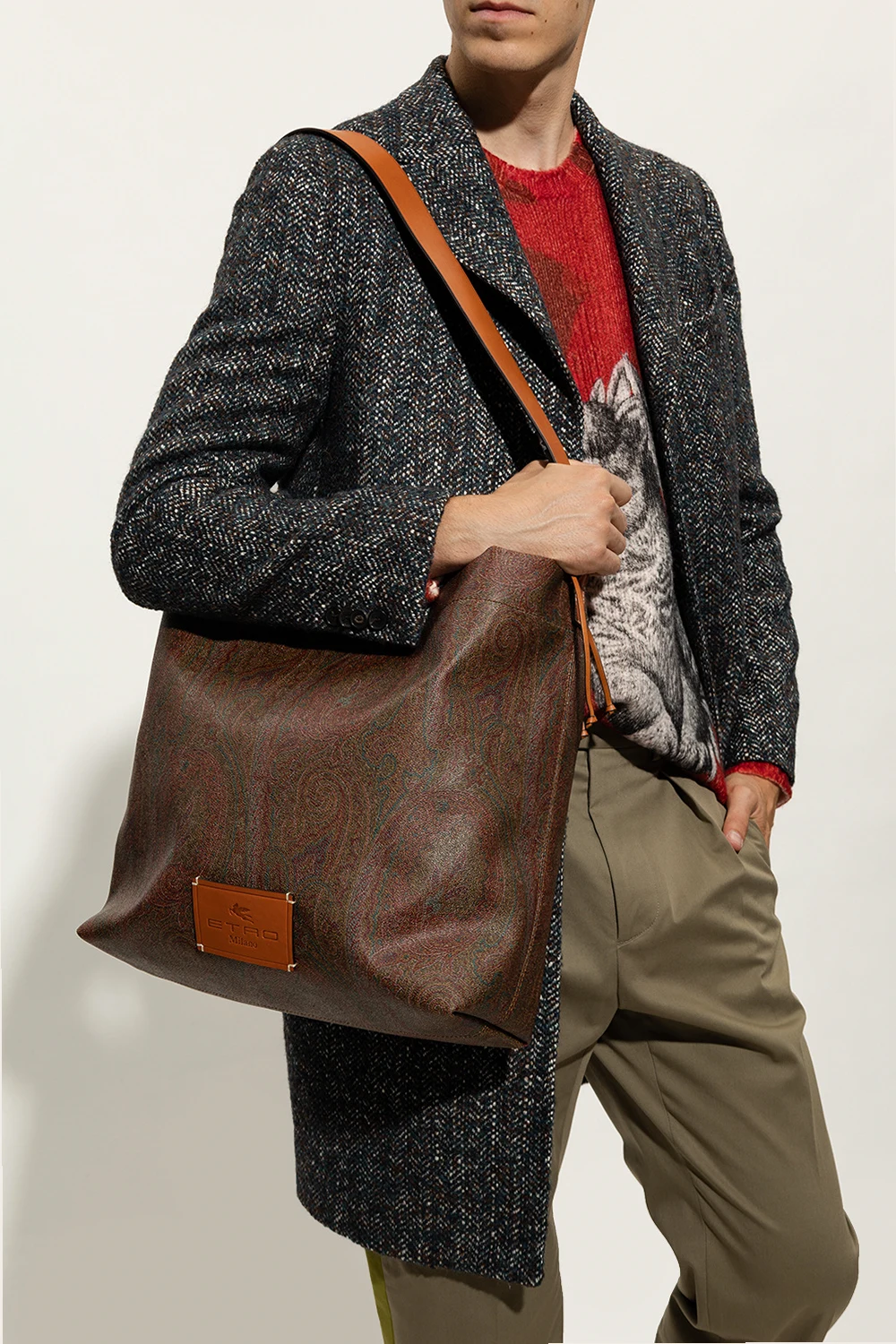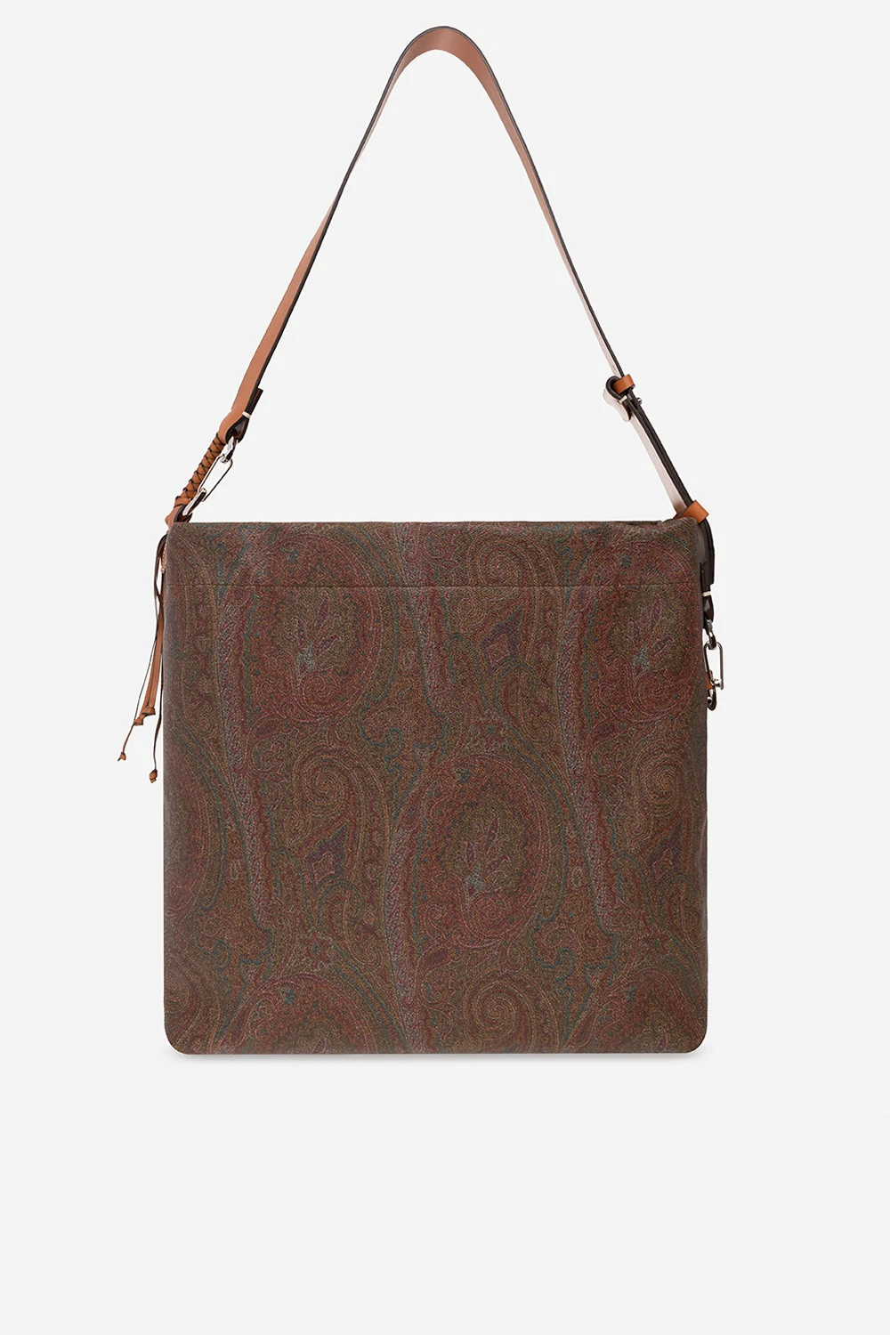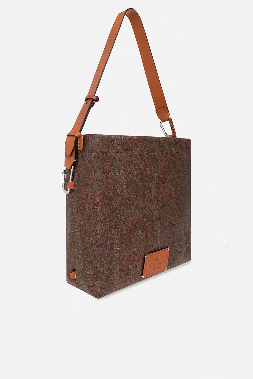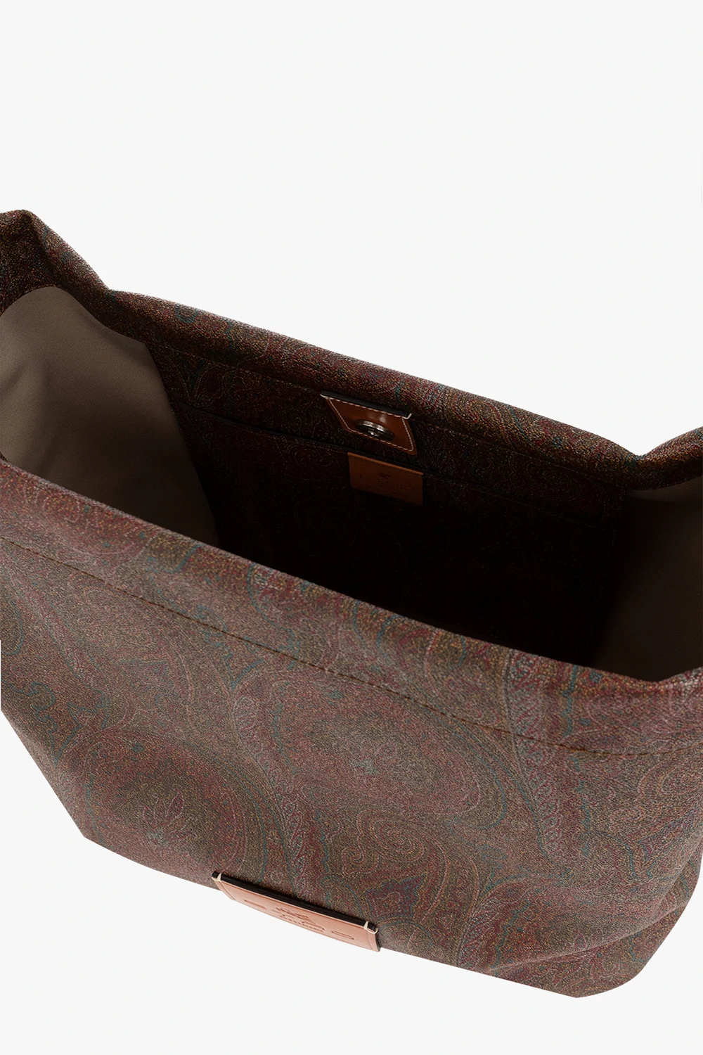 Brown shoulder bag from Etro. Made of coated canvas, this model features a multicolored paisley pattern, brown leather trims, snap closure, logo-embossed leather patch, silver-tone metal hardware, detachable and adjustable shoulder strap with a decorative weave as well as one internal compartment with one slip pocket.