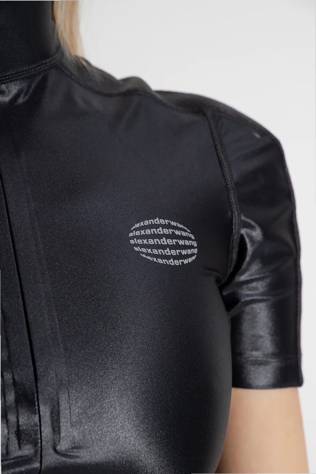 Black top with a high neck from Alexander Wang. Fastened with a concealed zip, this short sleeve design features a logo pattern and decorative texture.