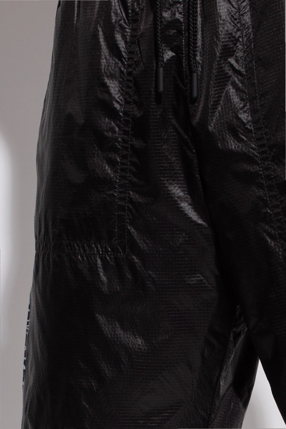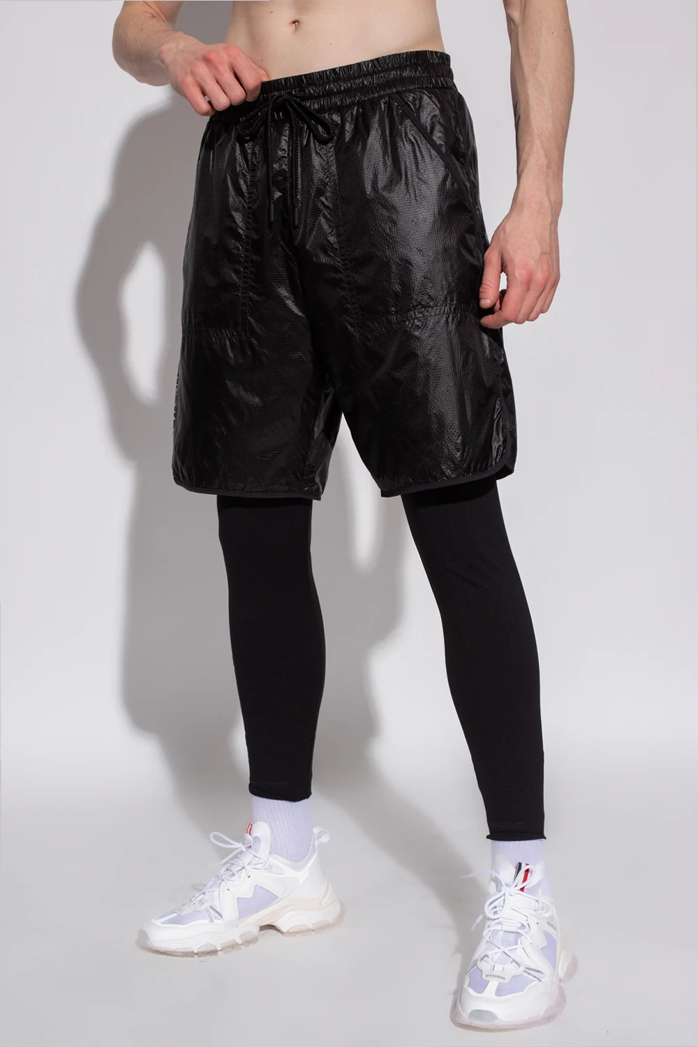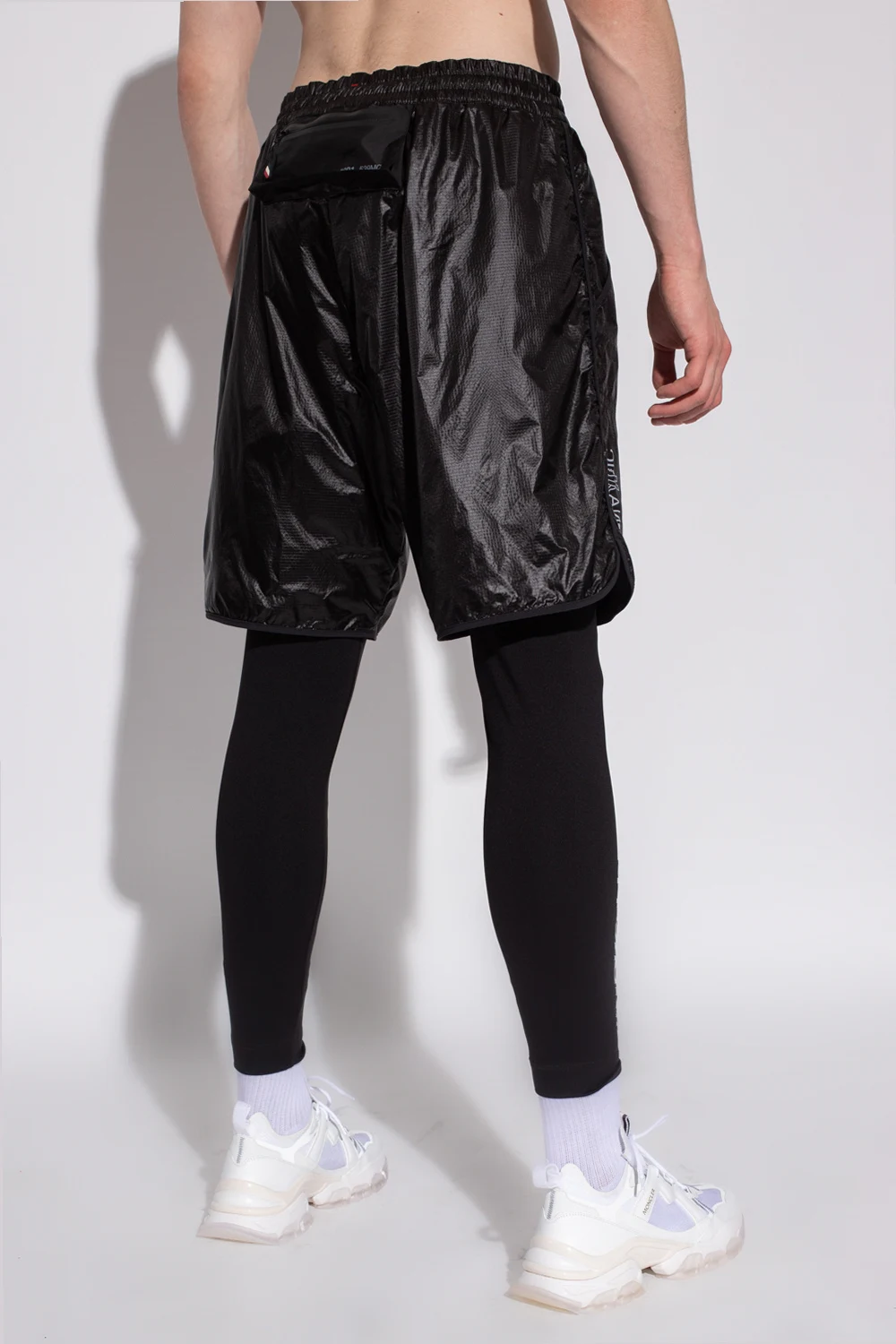 Black nylon shorts from Moncler Genius, the \'Grenoble no. 3 Day-Namic\' collection. Decorated with grey typography prints, this pair features a drawstring waistband, two front slip pockets and one back zipped pocket.