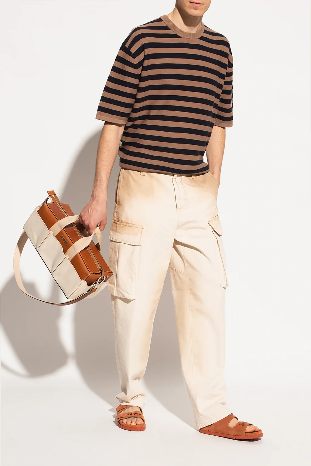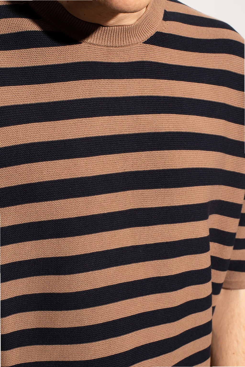 Navy and brown crewneck T-shirt from Samsoe Samsoe. Made of cotton, this garment is decorated with a stripe pattern.