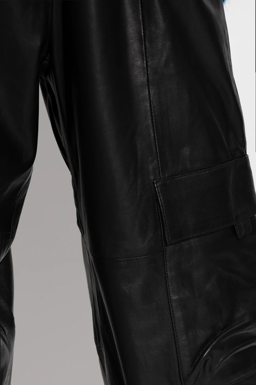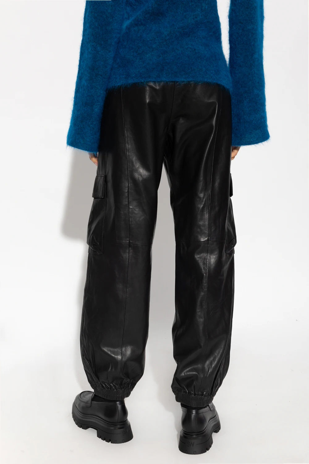 Black ‘KallieGZ’ cargo trousers from Gestuz. Crafted from lamb leather with the LWG certificate, this pair features an elasticated waistband, two slip pockets, two flapped pockets and elasticated cuffs.