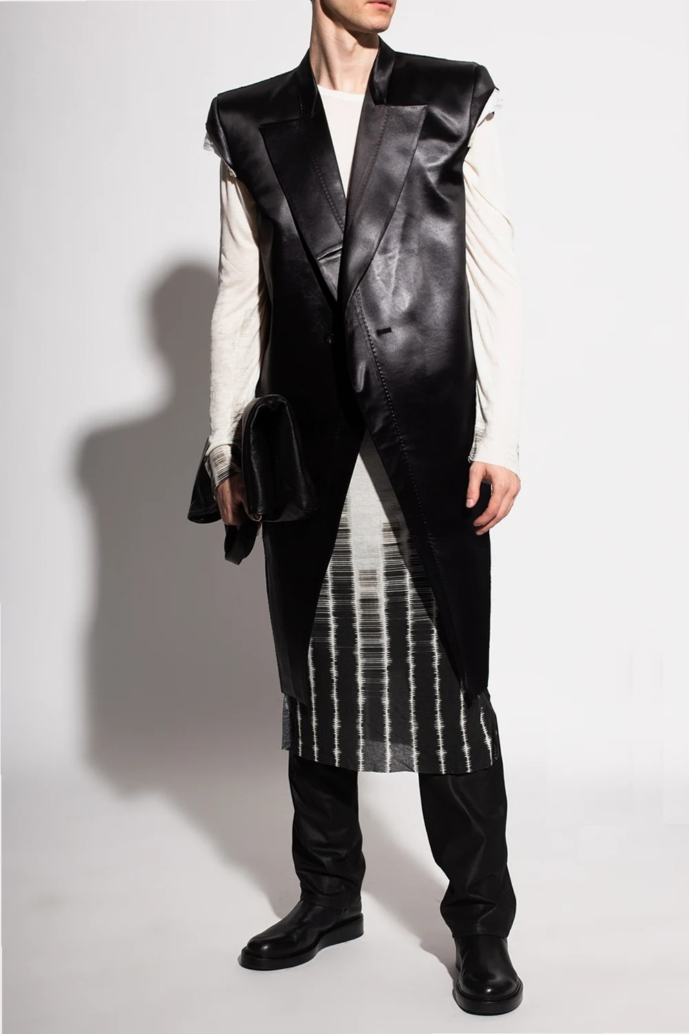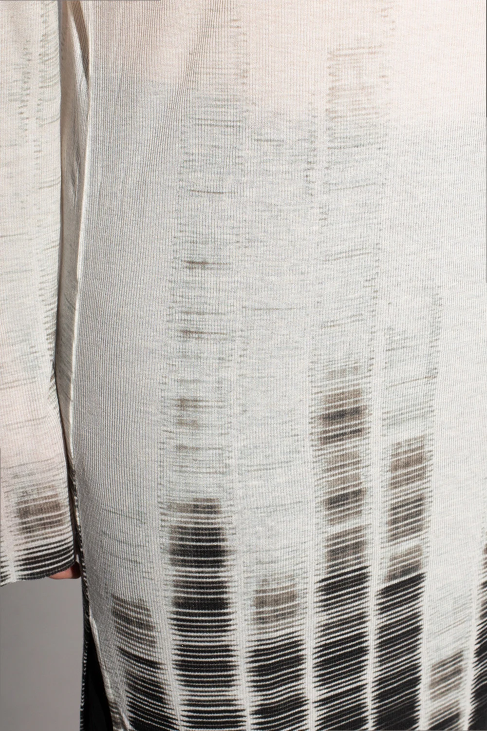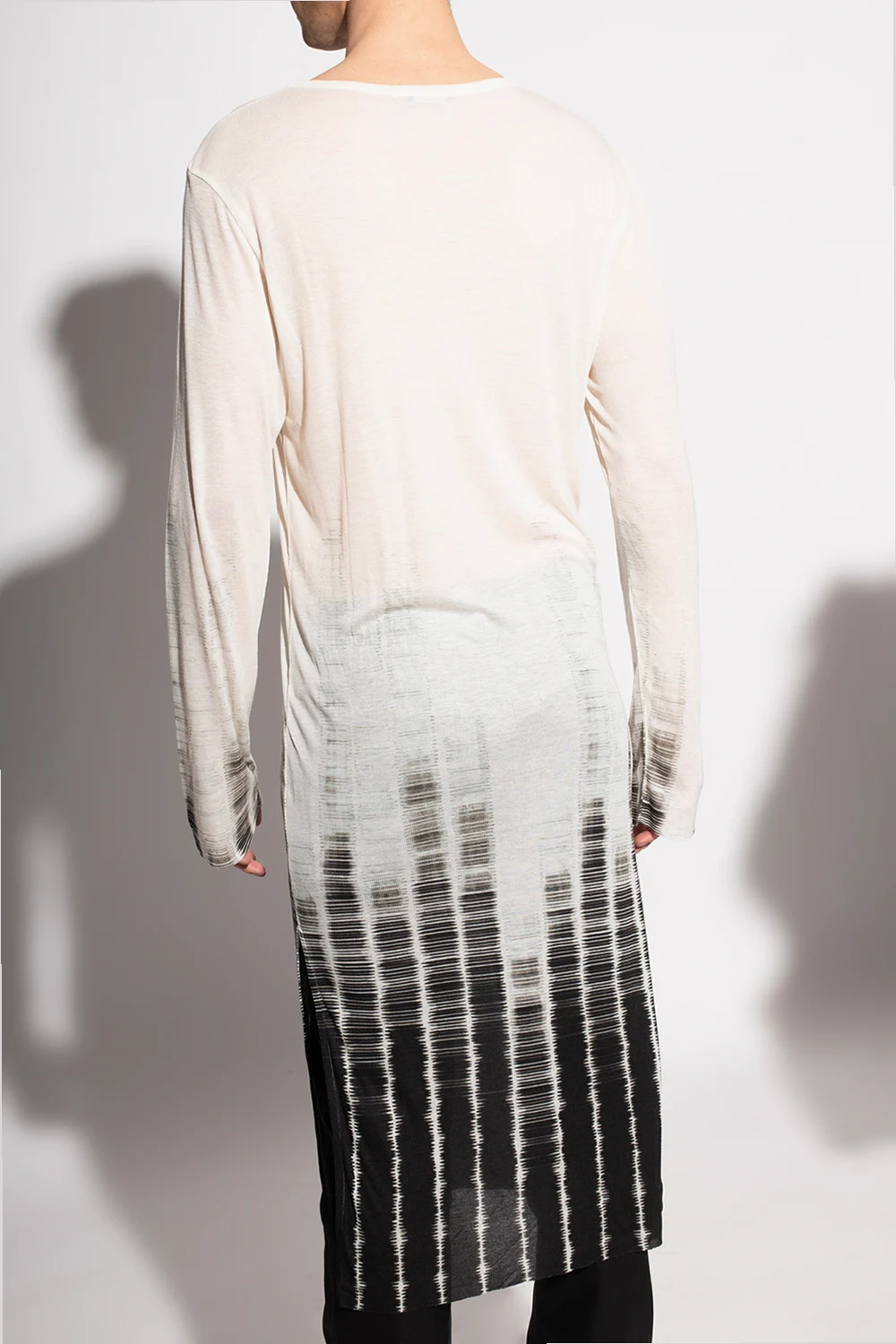 Cream and black long T-shirt from Ann Demeulemeester. This long-sleeve design features a round neck and a raw cut hem with side slits.