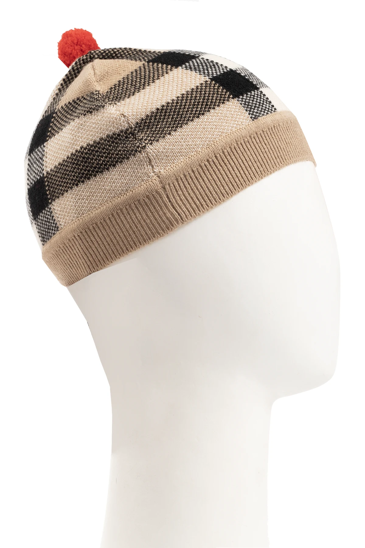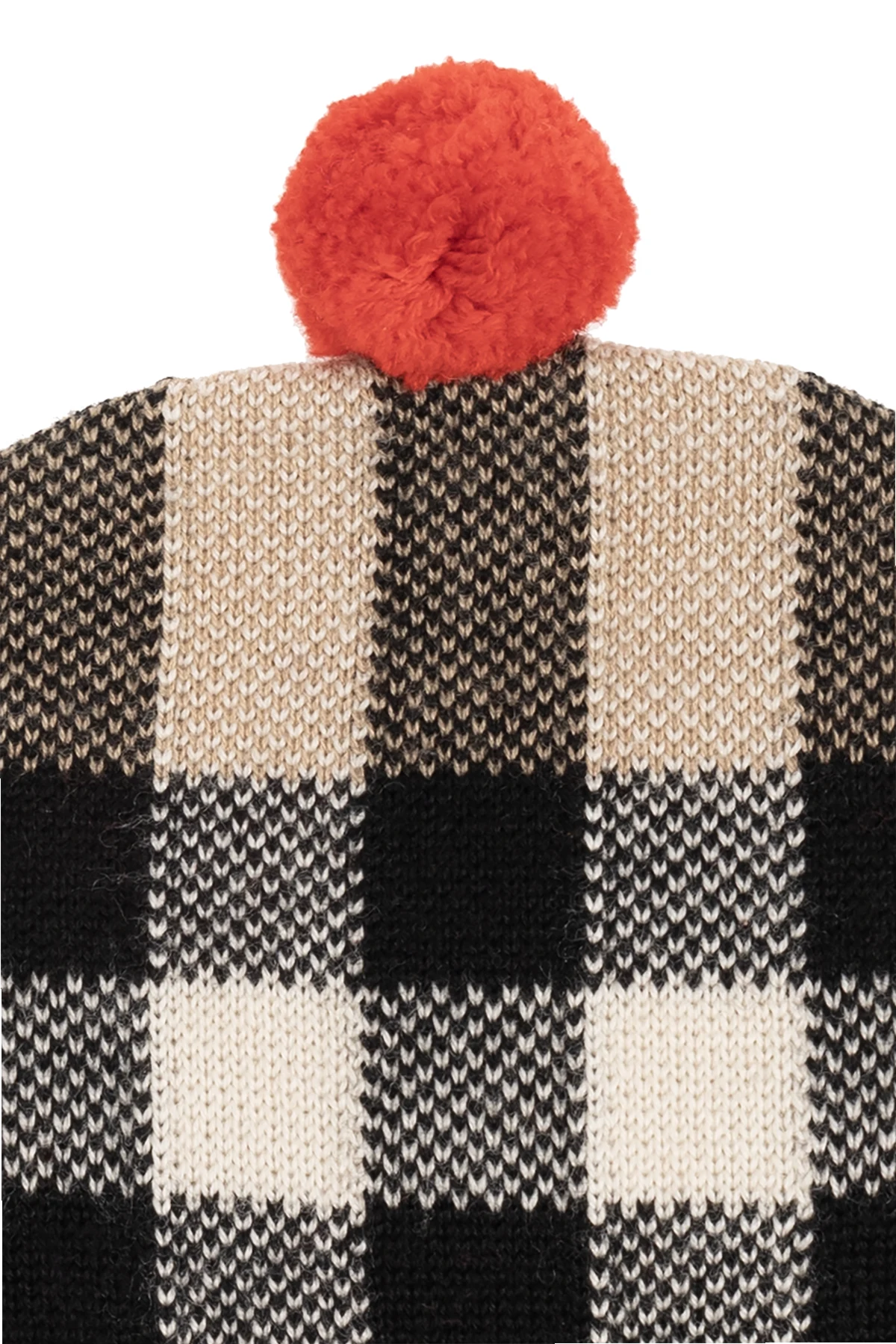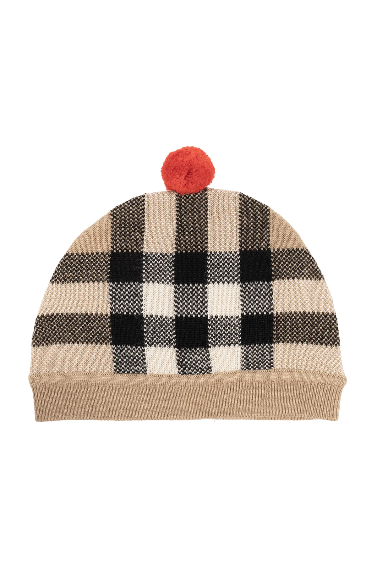 Beige, black and red beanie from Burberry. Made of a wool and cashmere blend, this item showcases a check pattern and a pompom.