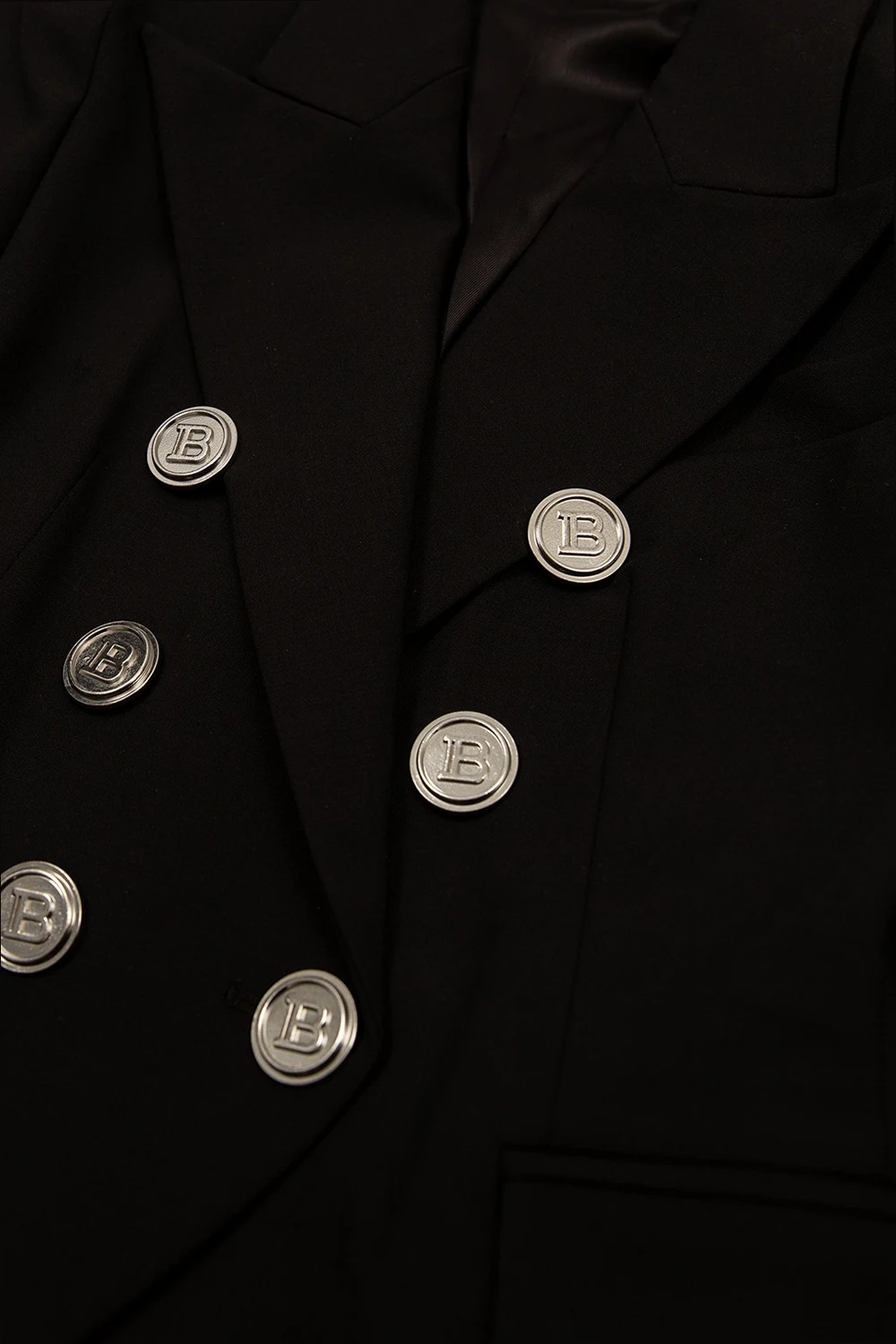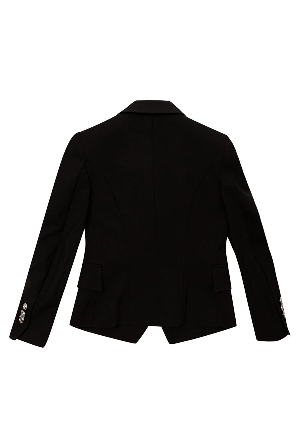 Black double-breasted blazer with peak lapels from Balmain Kids. Made of wool, this garment features decorative logo buttons in silver-tone, two flap pockets, one slip pocket and long sleeves with button cuffs.