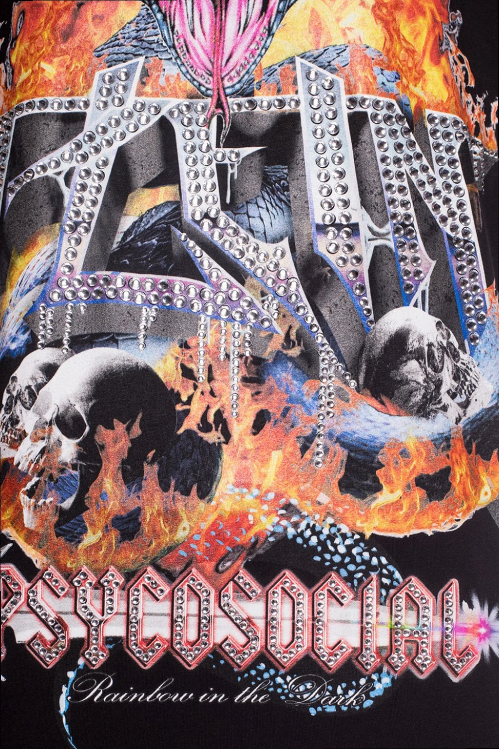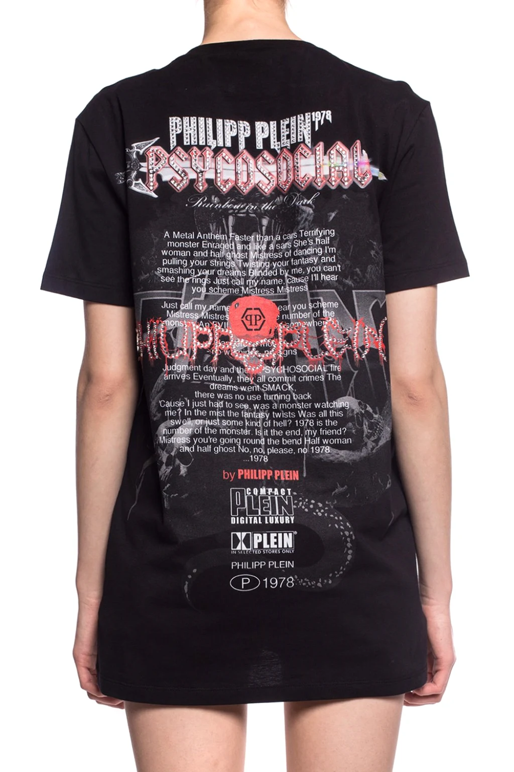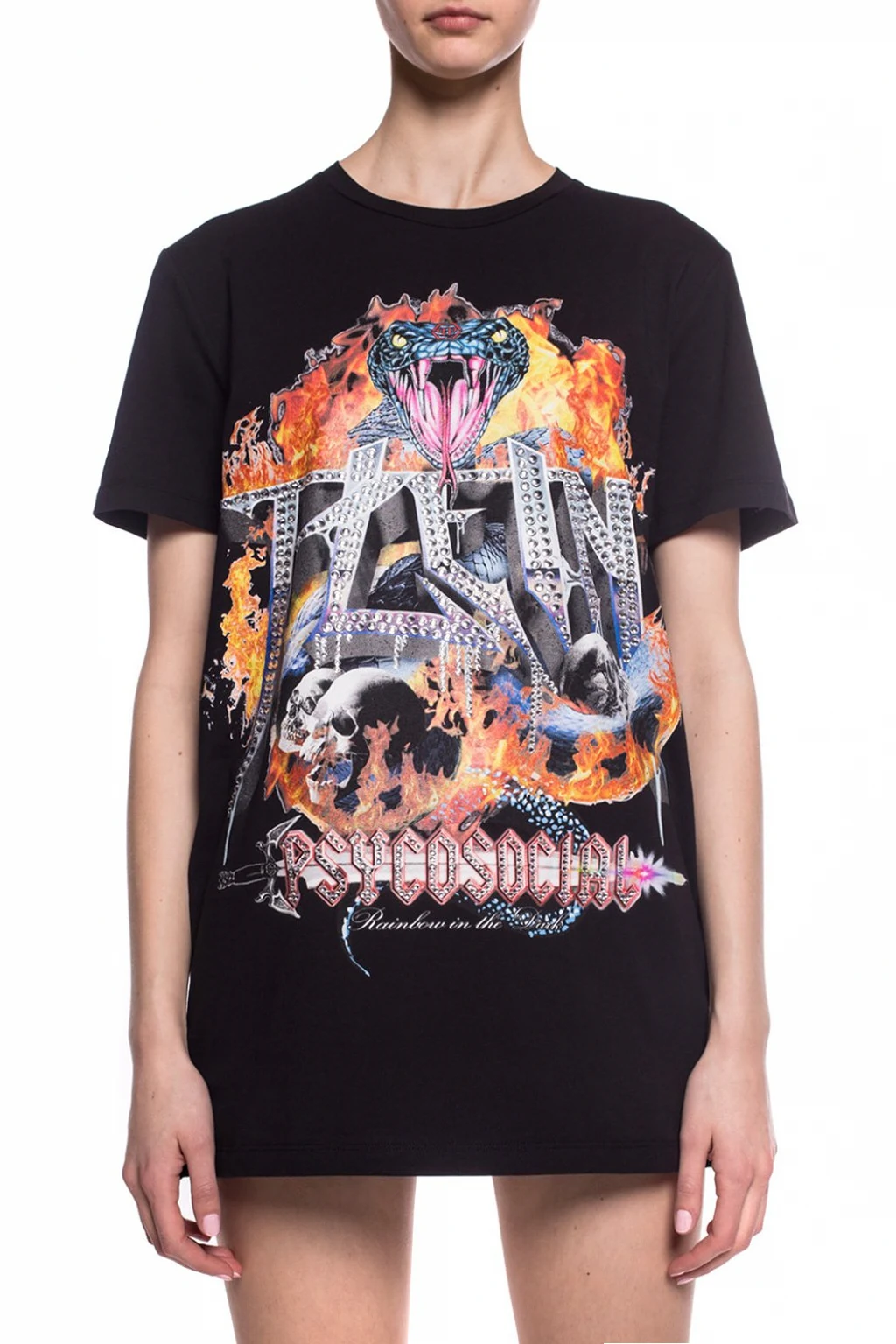 Black T-shirt from Philipp Plein. Made of cotton. Enriched by a colorful print and decorative elements in silver-tone. Round neck.