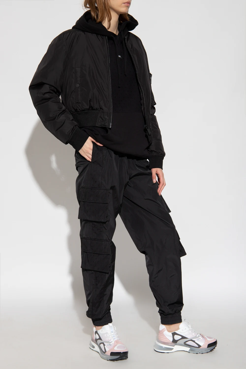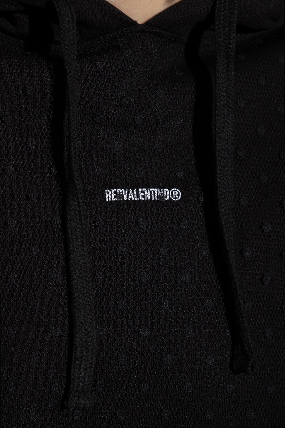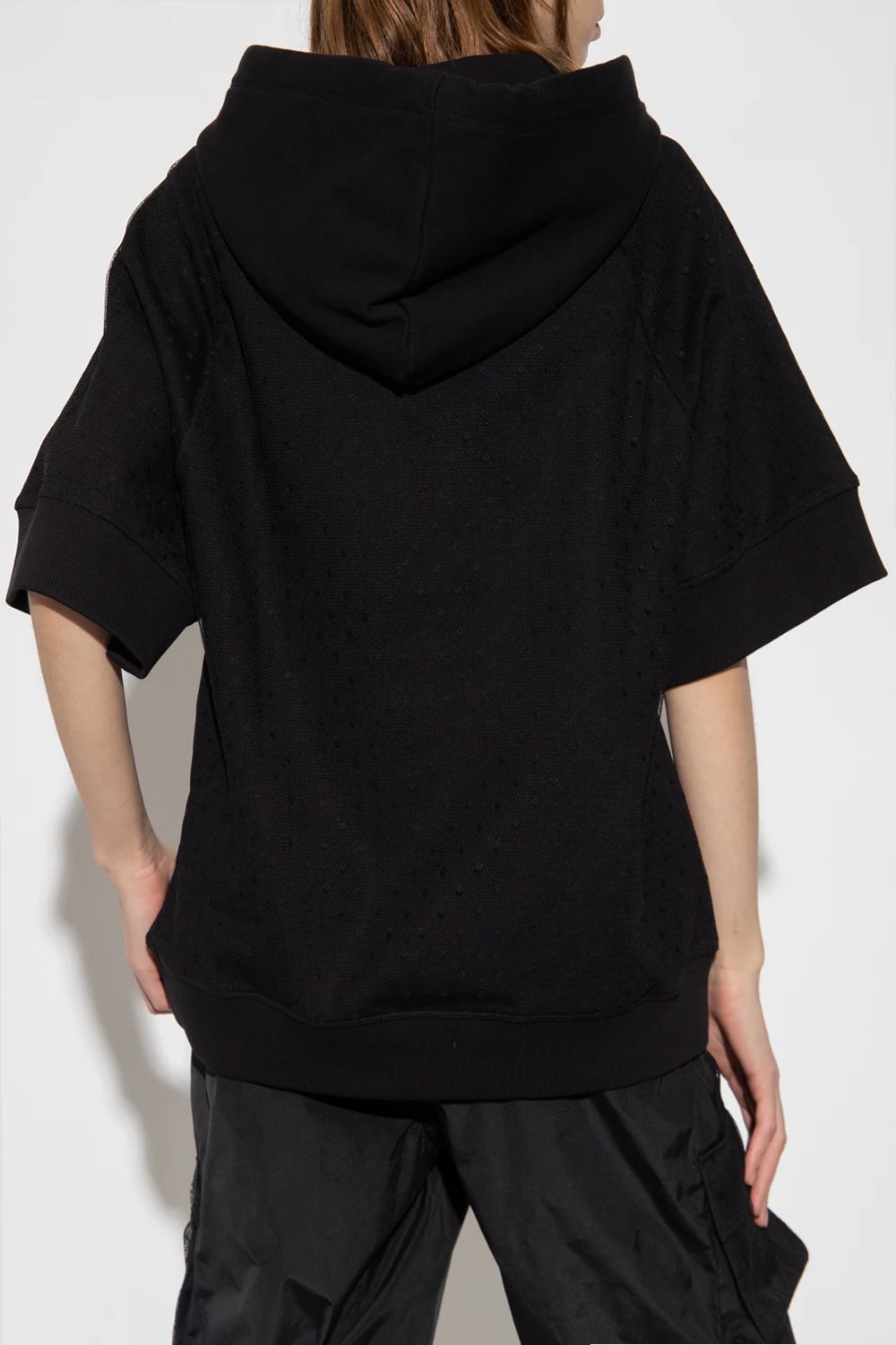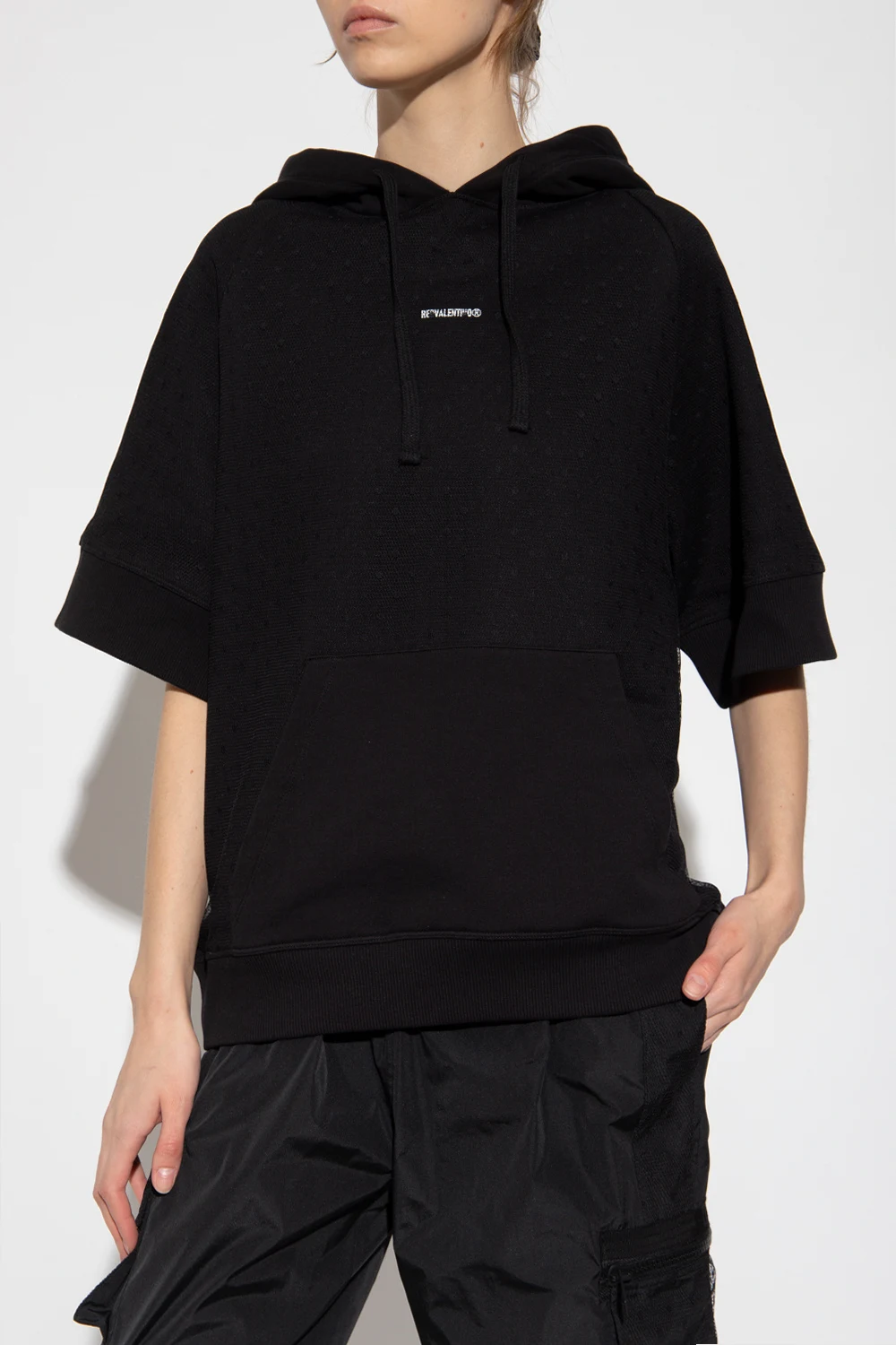 Black sweatshirt with a drawcord-adjustable hood from Red Valentino. Crafted from cotton jersey, this style features tulle accents, short sleeves, a white logo print accompanied by a kangaroo pocket on the front and an elasticated trim at the bottom hem.