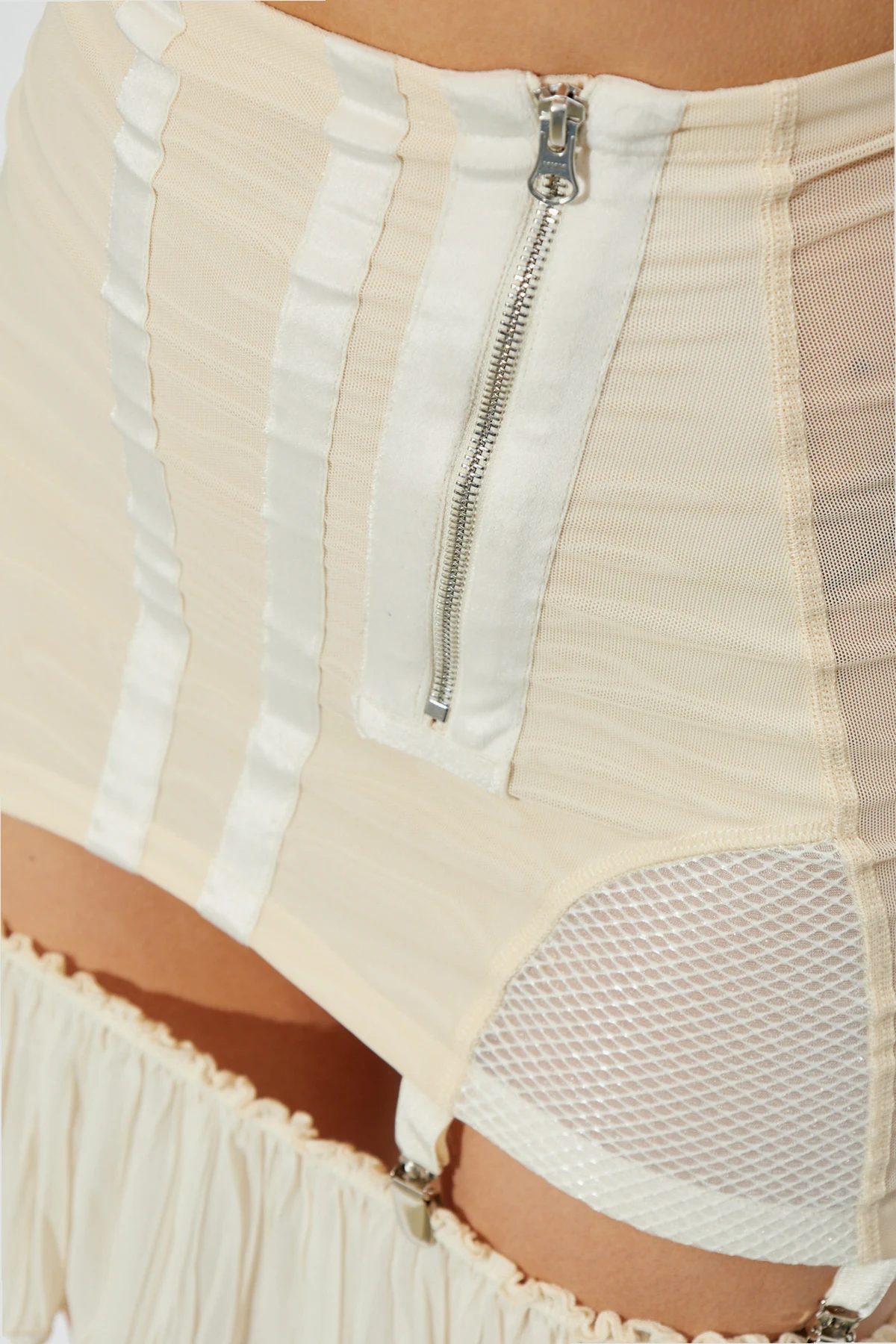 Introducing the ‘Uma’ Skirt by KNWLS—an avant-garde interpretation of feminine sophistication. This high-waisted mini skirt is artfully tailored to flatter the figure, with a sleek fitted upper and playfully flared lower silhouette, evoking a sense of contemporary allure. Crafted from a dynamic juxtaposition of materials, the skirt boasts lustrous satin vertical bands, airy mesh panels, and an exquisite pleated hem composed of whisper-light chiffon or organza. The composition creates a multidimensional texture, while the striking metallic front zipper serves as both a bold statement and a practical detail. Distinctive ruching gracefully accents the lower tier, nodding to vintage-inspired lingerie motifs with modern finesse. The Uma skirt is the epitome of refined rebellion, designed for those who seek elegance with an edge. Why choose this product? Exclusive KNWLS design with a sophisticated, modern edge Luxurious blend of satin and airy mesh for visual intrigue Hand-finished pleating and intricate ruching for unique texture Eye-catching metal zipper offers function and decorative flair Versatile statement piece for a discerning wardrobe