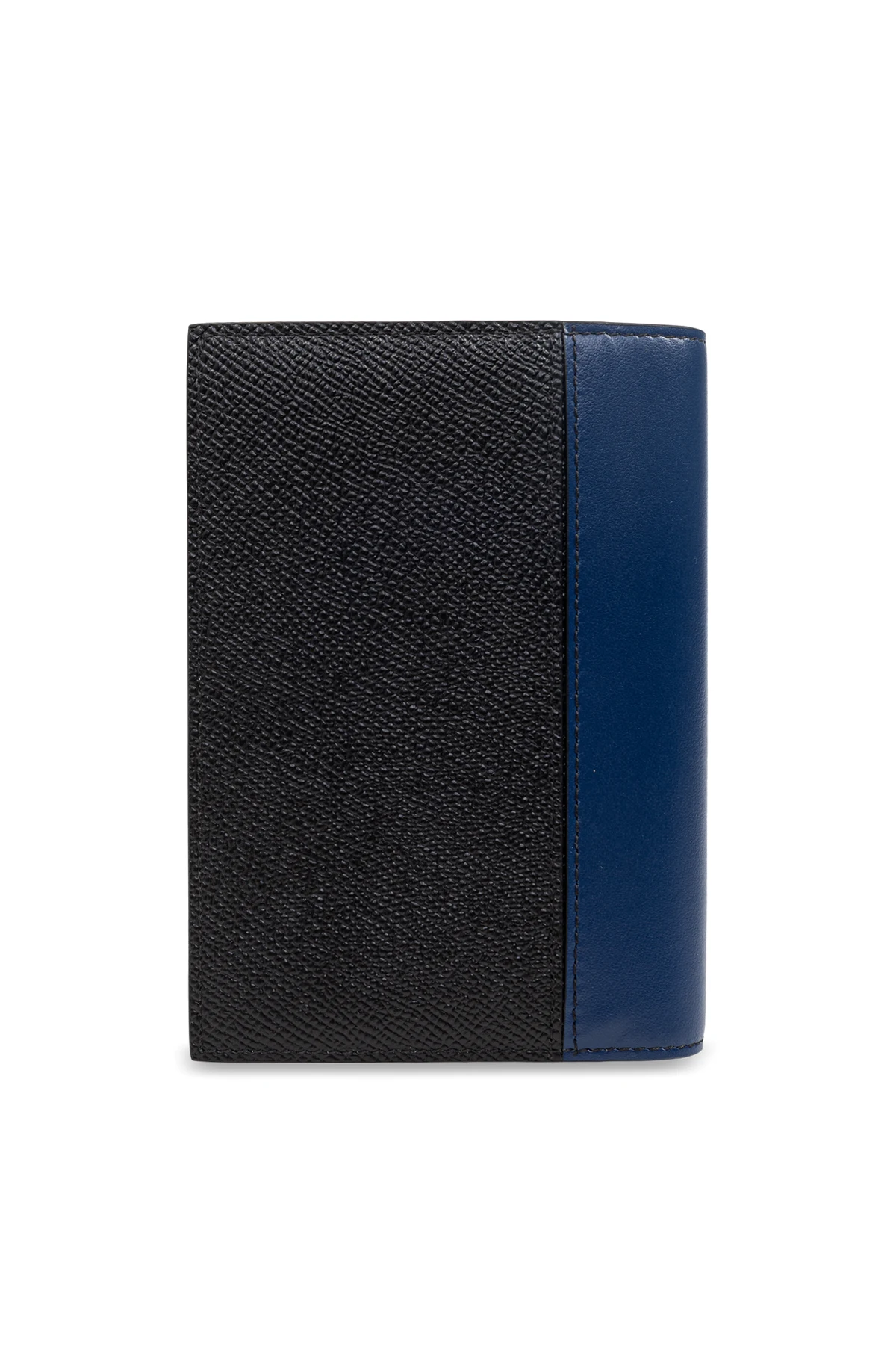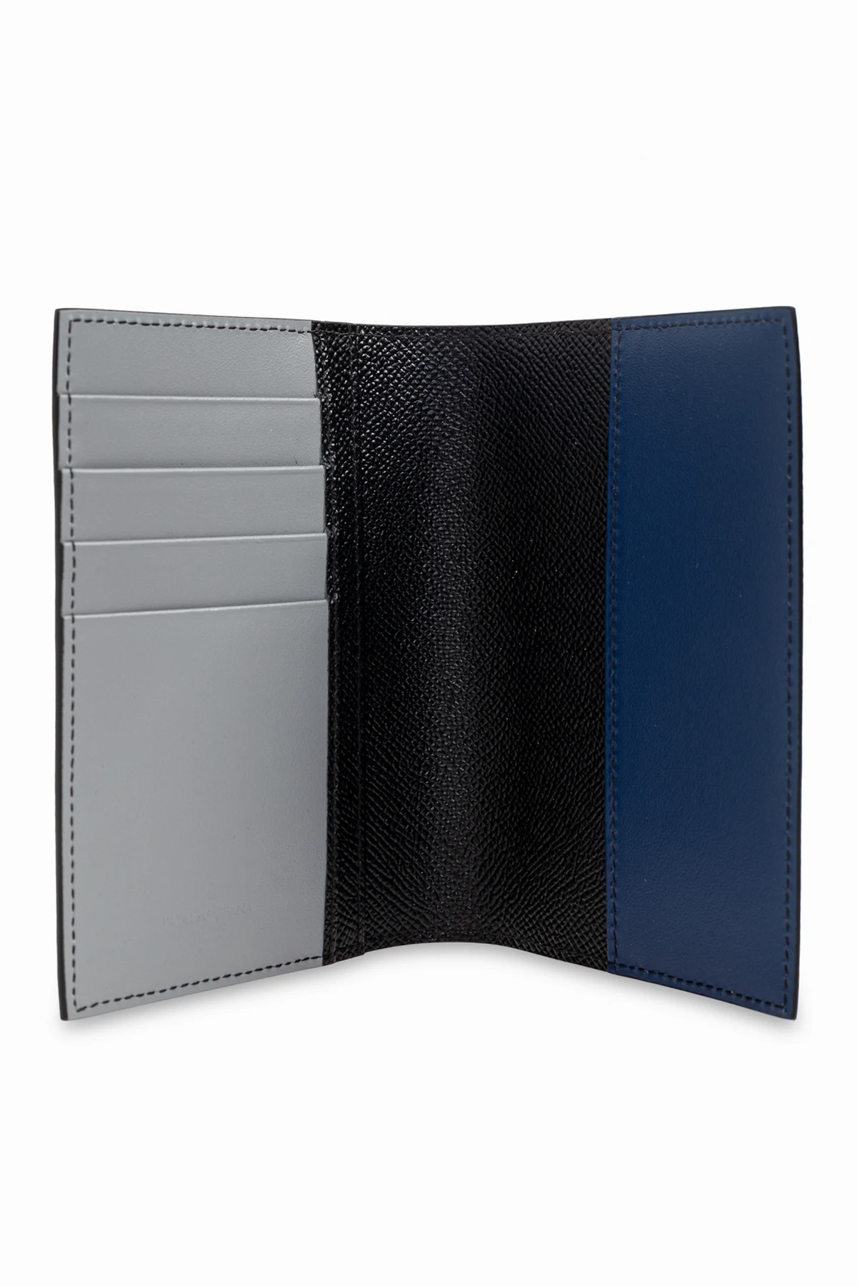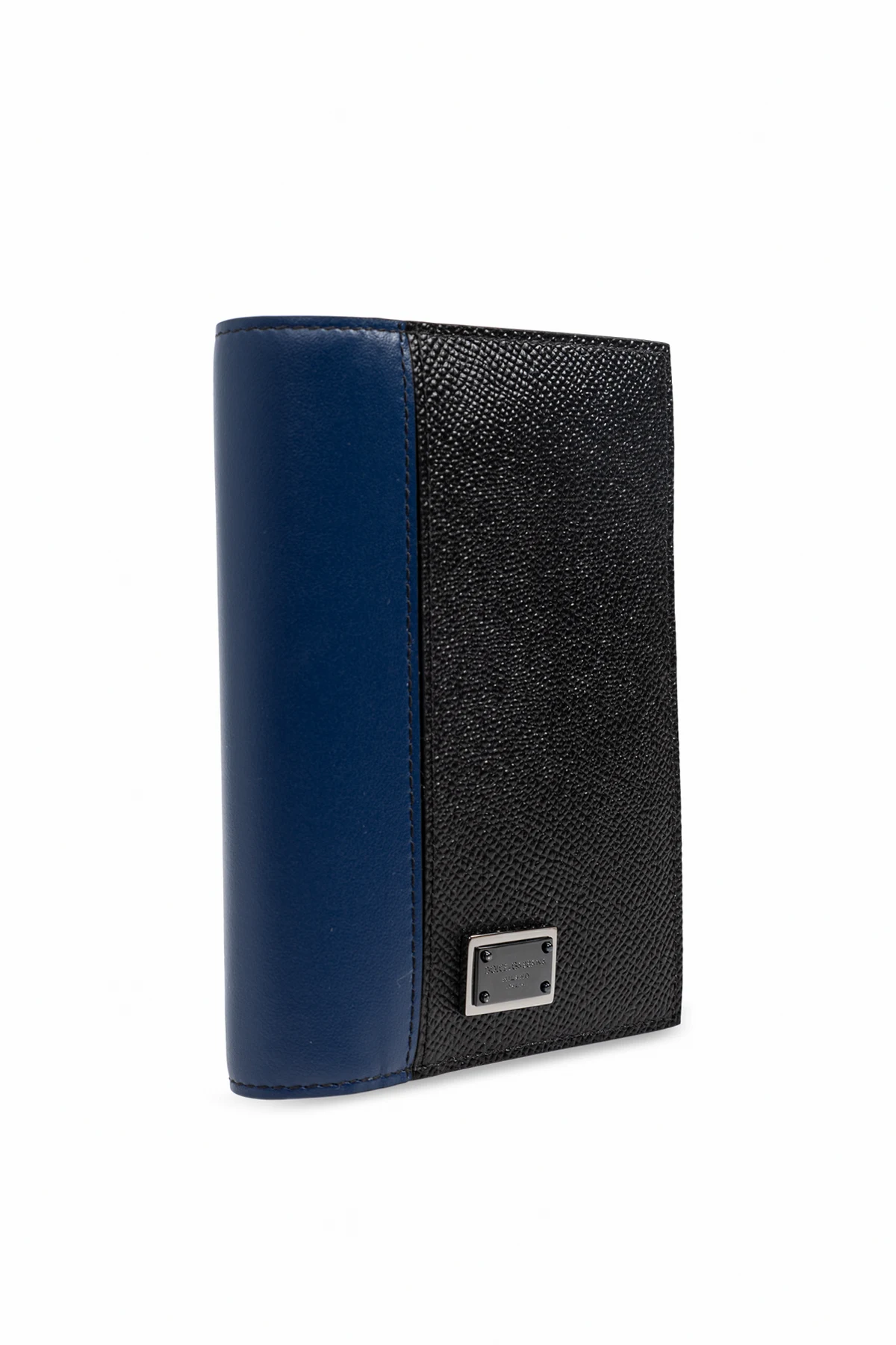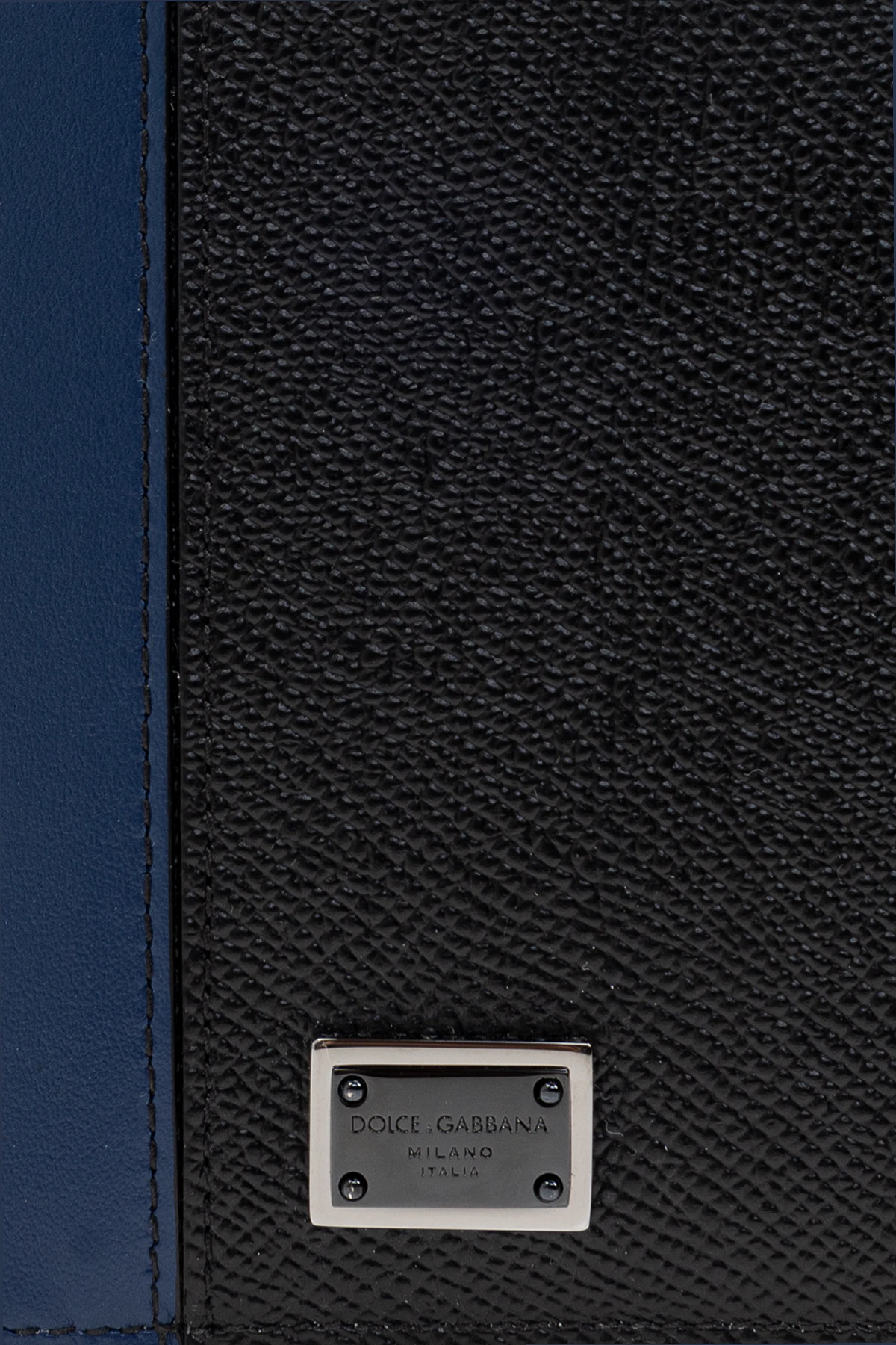 Introducing the Dolce & Gabbana Passport Case, a paragon of sophistication and luxury. Crafted from the finest leather, this exquisite accessory showcases a harmonious blend of deep black and a striking blue stripe, exuding timeless elegance. The leather\'s textured surface adds a touch of refinement, while the metallic plaque embossed with the “Dolce & Gabbana Milano Italia” logo emphasizes its opulent nature. Inside, the case features a light gray lining, meticulously designed with multiple card slots to enhance its practicality. Its classic rectangular form is perfect for safeguarding your passport and other essential documents, embodying a seamless fusion of modern design and classical elegance. This passport case is ideal for those who appreciate both luxury and functionality. Why Choose This Product? Premium leather with a unique textured finish Elegant color palette with a distinctive blue accent Iconic Dolce & Gabbana branding Spacious interior with a passport slot and four card holders Timeless design for the discerning traveler