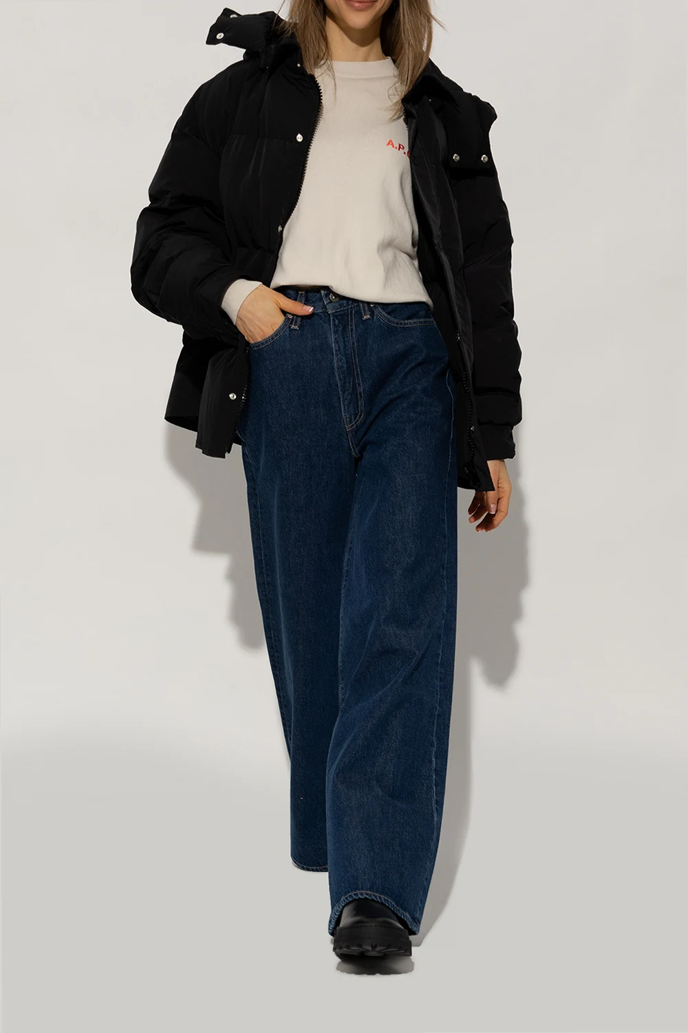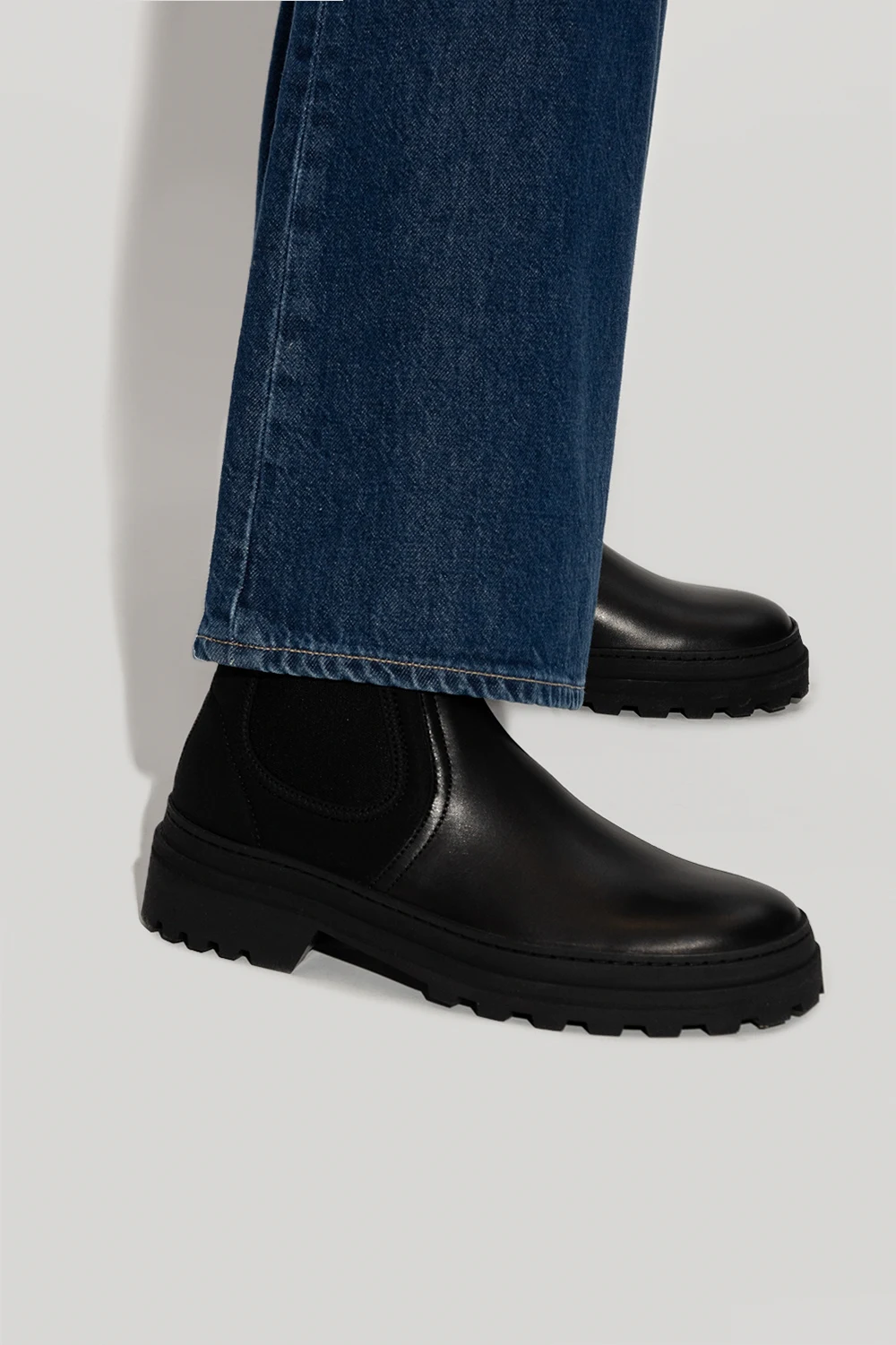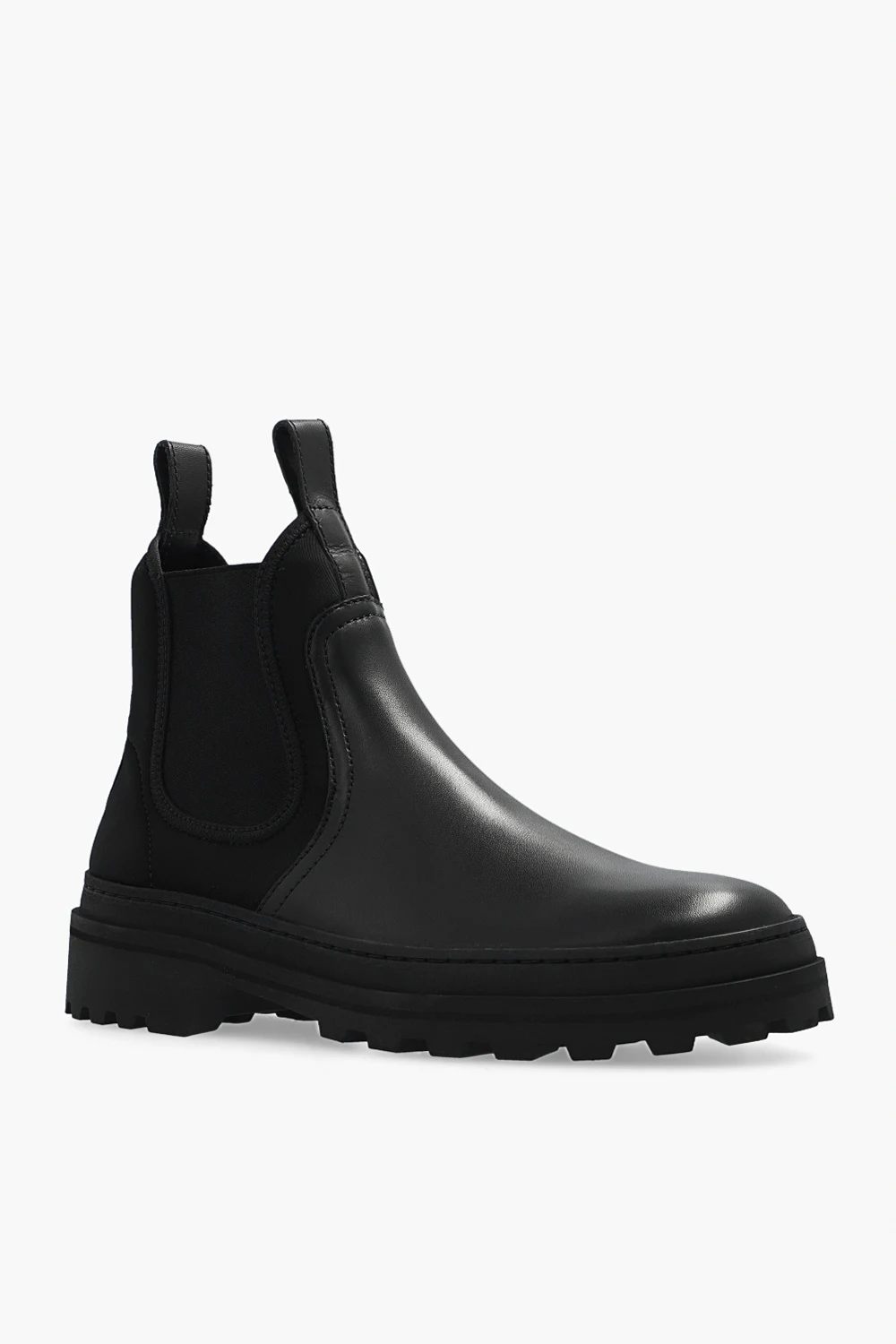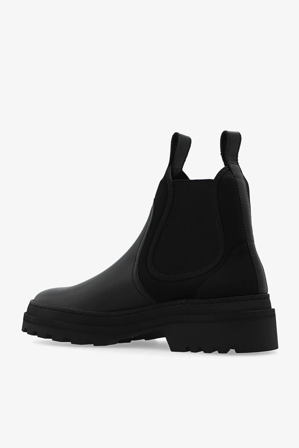 Black slip-on Chelsea boots from A.P.C. Partially crafted from leather, this pair is complete with elastic side panels, round toe, pull tabs and black rubber sole.