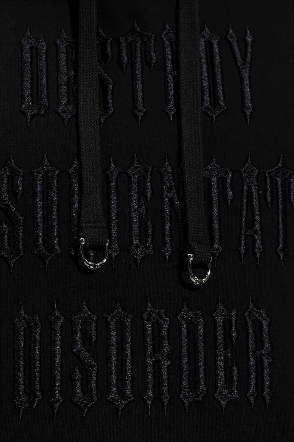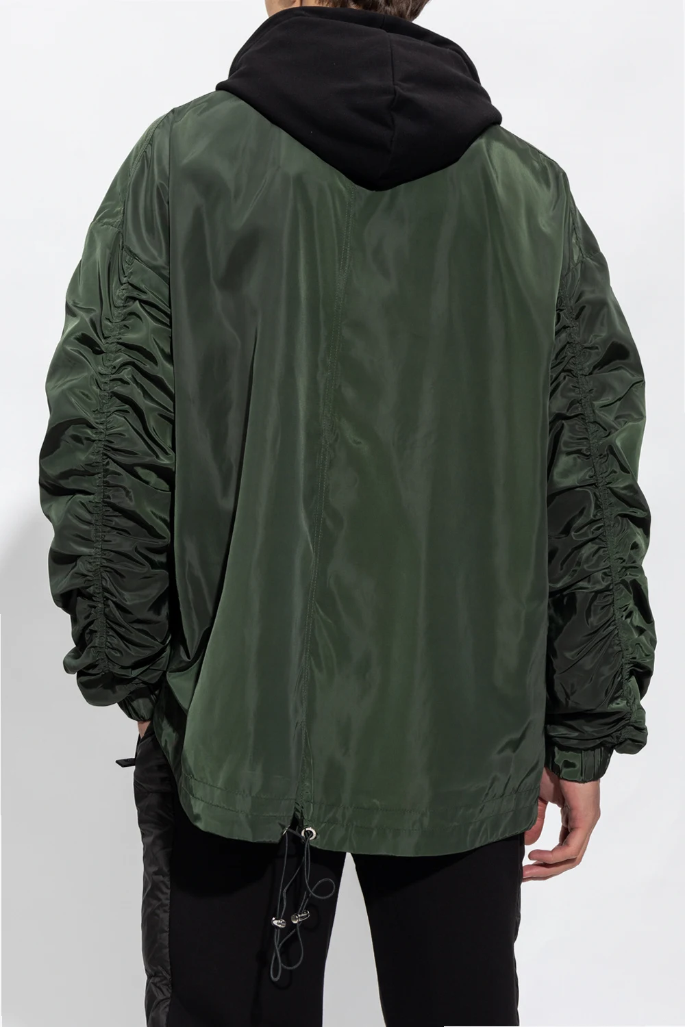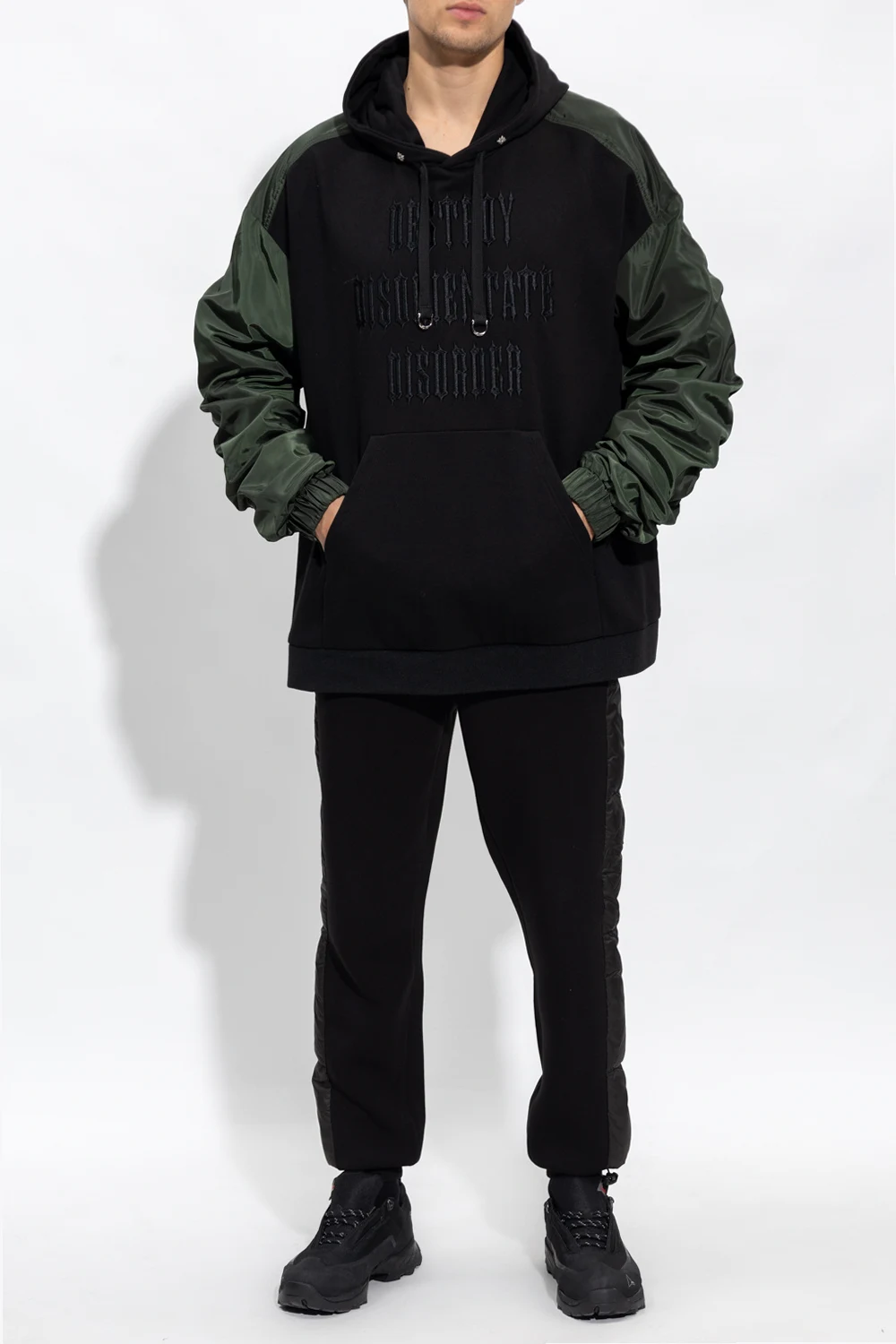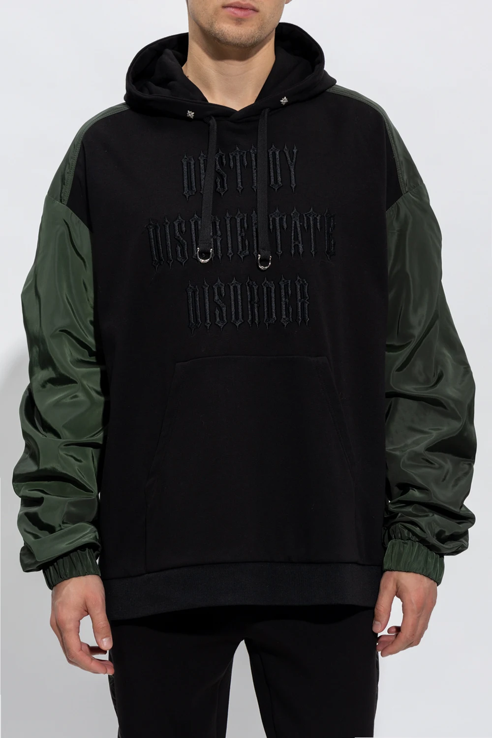 Black and green hoodie from John Richmond. Assembled from different fabric panels, this style features a drawcord-adjustable hood and back, a kangaroo pocket, slogan embroidery on the front, gathered sleeves and elasticated trims on the bottom hem and cuffs.