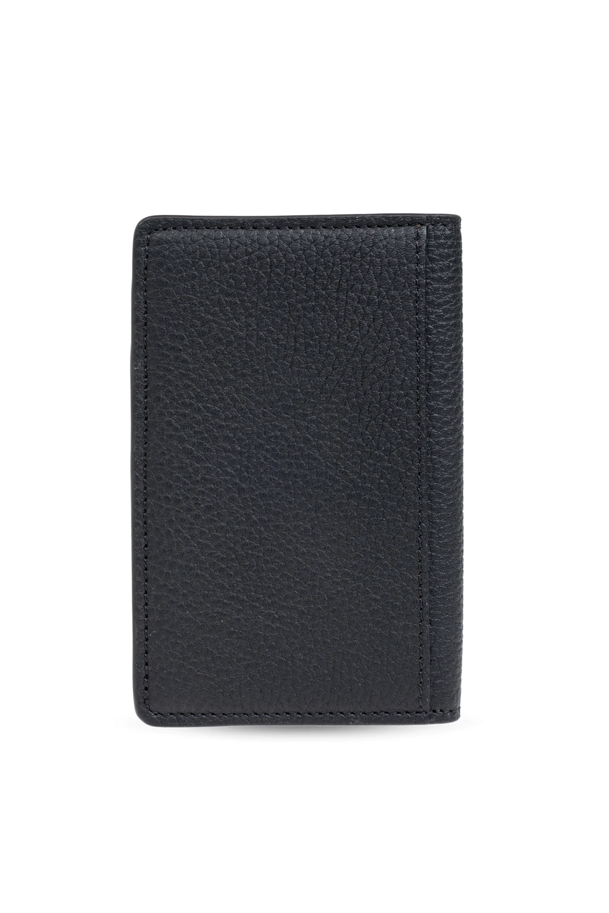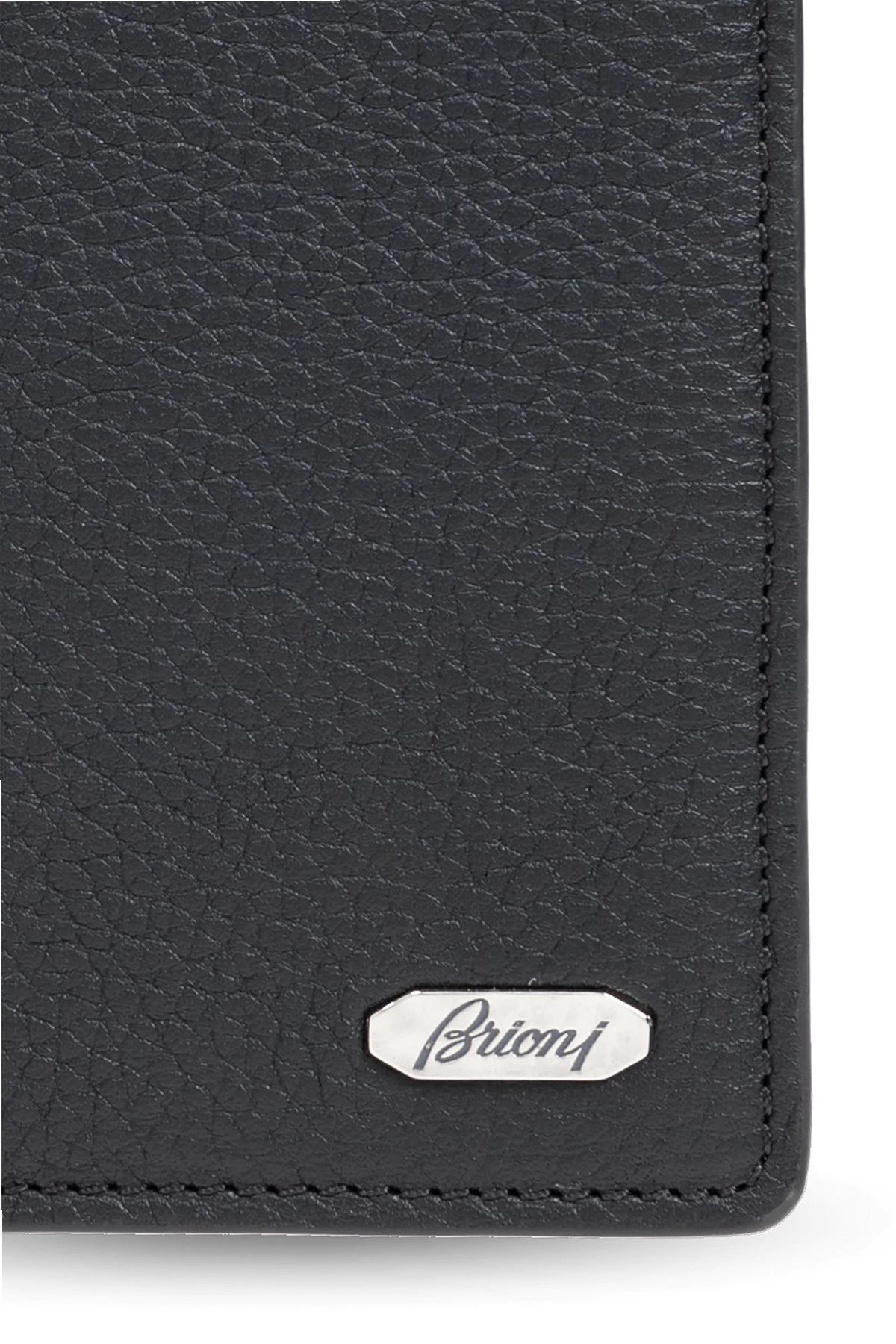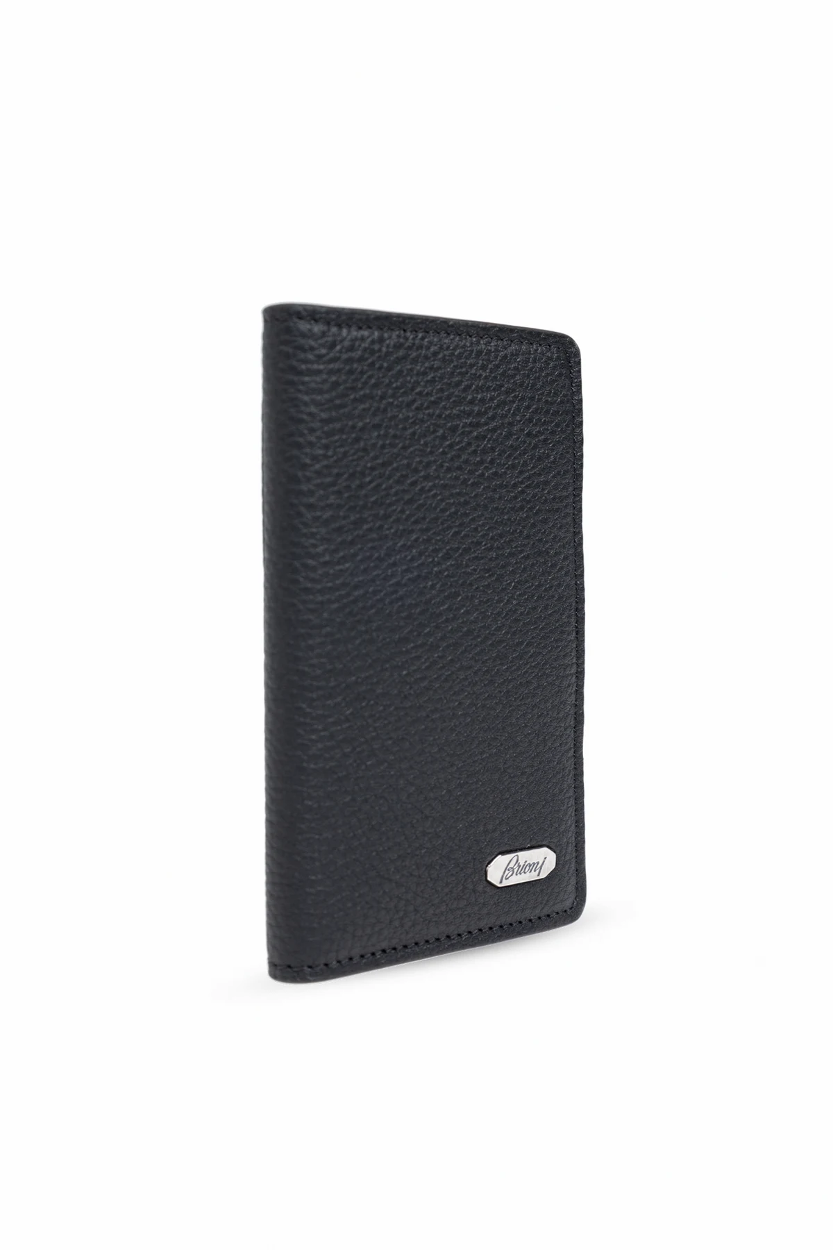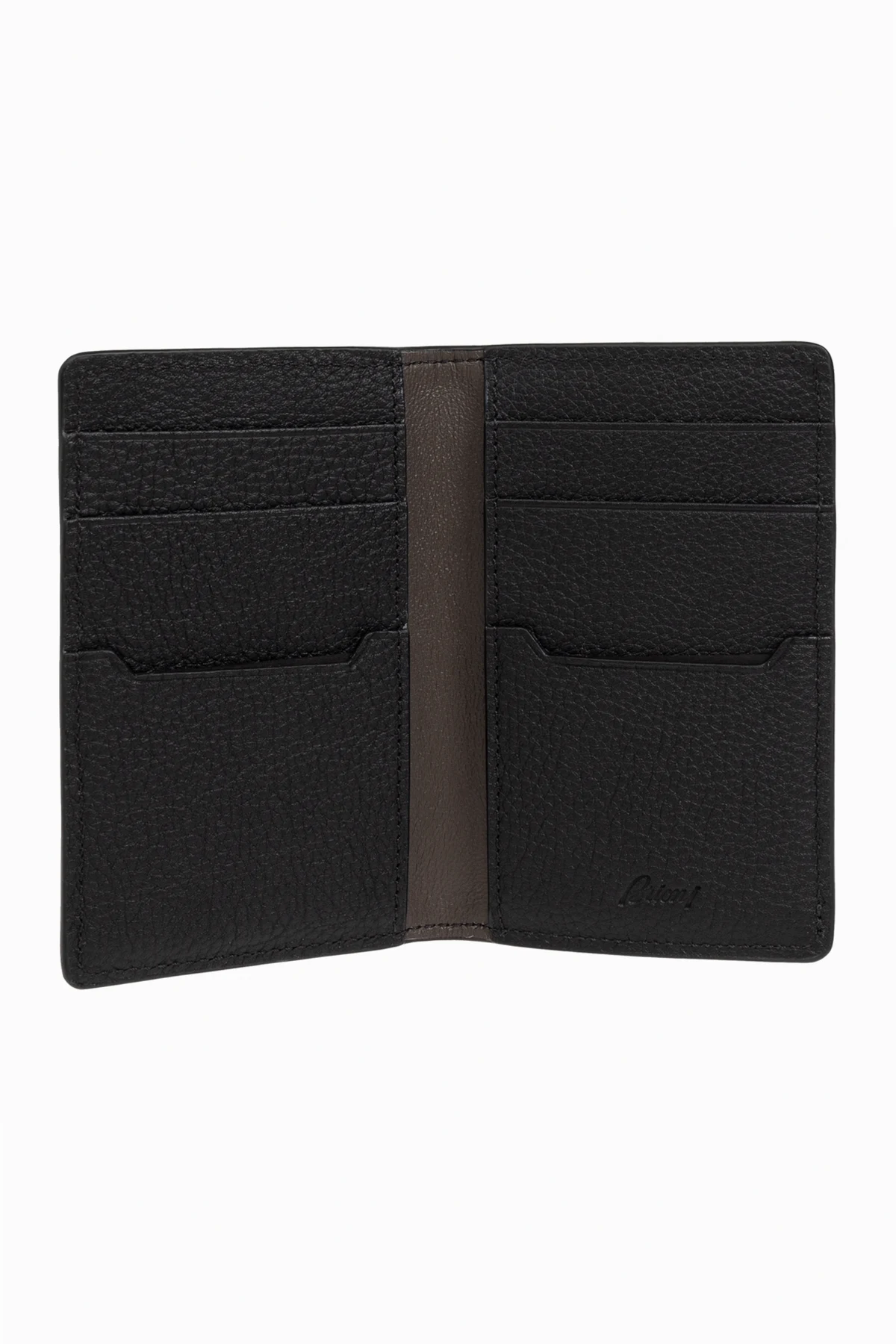 Introducing the quintessence of sophistication and functionality - the Brioni Leather Card Holder. Crafted meticulously from 100% grain-textured leather, this black card holder not only promises durability but also exudes an air of elegance. Its sleek vertical silhouette is accentuated by precisely stitched edges, underlining Brioni\'s commitment to excellence and attention to detail. The front of this exquisite accessory is adorned with a discreet, metallic logo that is rectangular with rounded edges, featuring the designer\'s name in cursive. This hallmark of design not only establishes the card holder\'s authenticity but also enhances its luxurious appeal. Why Purchase This Product? Elegance and Durability: High-quality, grain-textured leather ensures both a sophisticated look and longevity. Exclusive Design: The subtle, metallic designer logo adds an exclusive touch, making it a distinctive accessory. Precision Craftsmanship: Impeccably stitched edges showcase the meticulous craftsmanship typical of Brioni\'s luxurious offerings. Functional Elegance: Its sleek, vertical format offers a stylish way to organize and carry your cards.