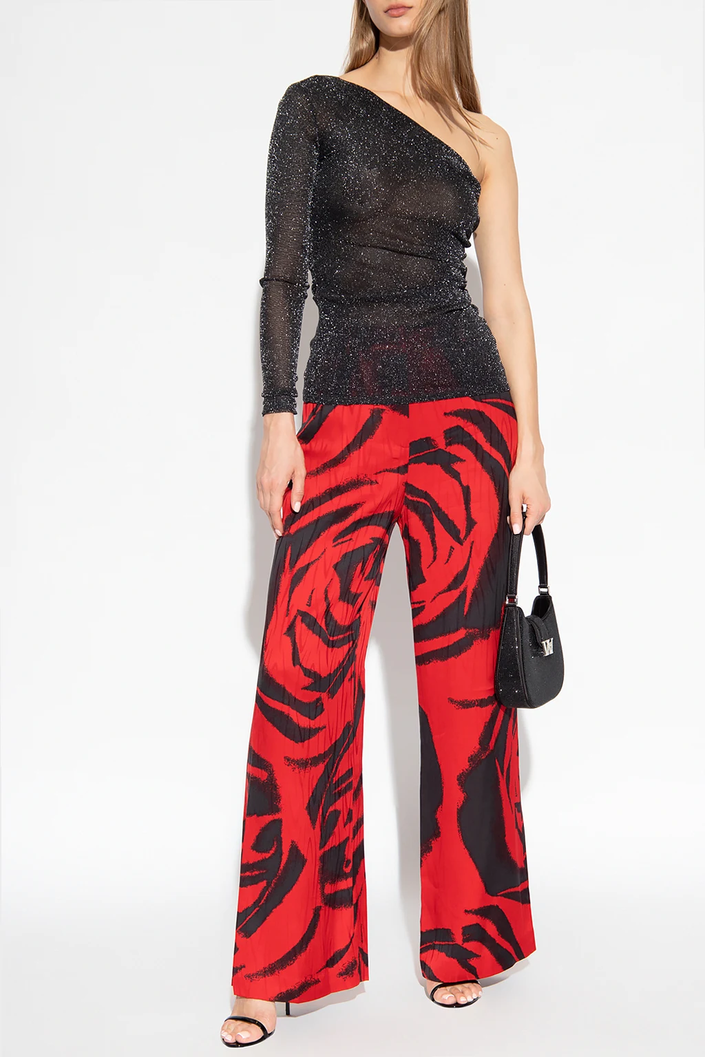 Black ‘Chaos’ one-shoulder top from Diane Von Furstenberg. Crafted stretchy material inlaid with silver-tone lurex yarn, this style features a form-fitting silhouette, an asymmetrical neckline, decorative draping and one long sleeve.