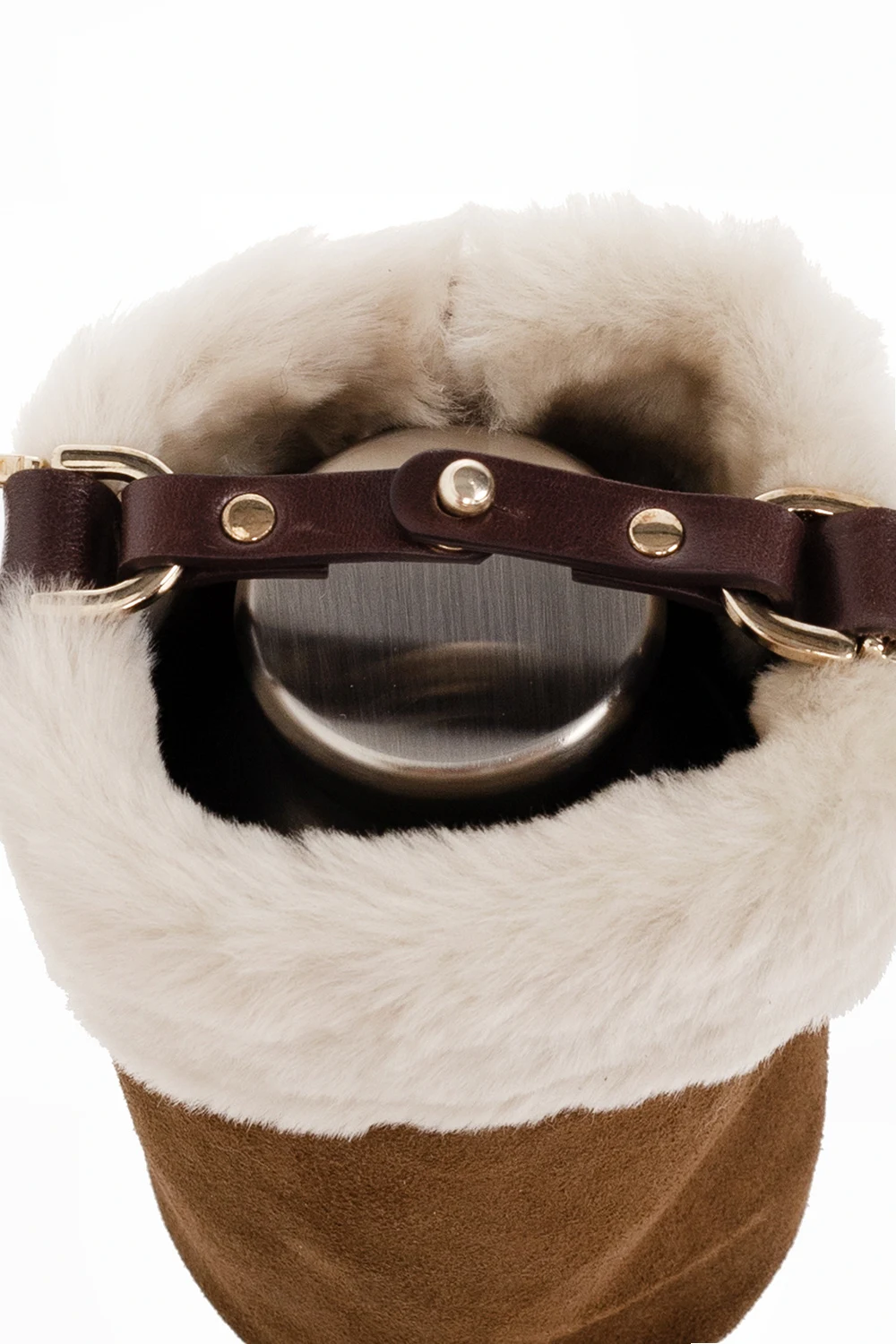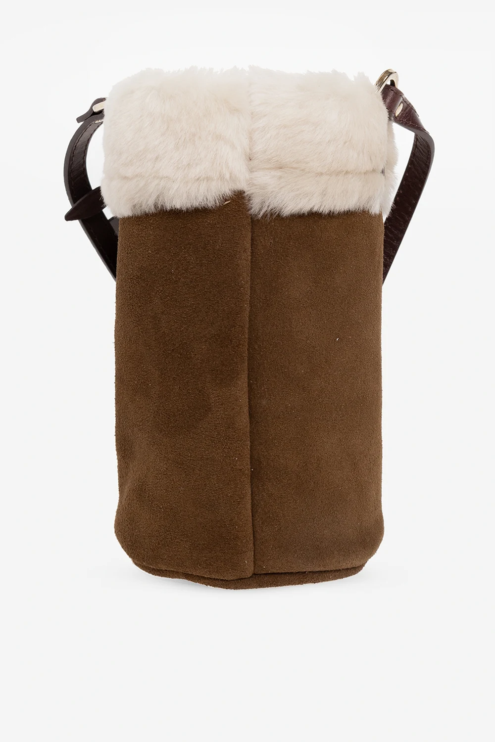 Silver-tone thermal bottle from Bonpoint. This item comes with a brown case made of suede and smooth leather featuring faux-fur trims, a logo charm, an adjustable strap and gold-tone metal hardware.