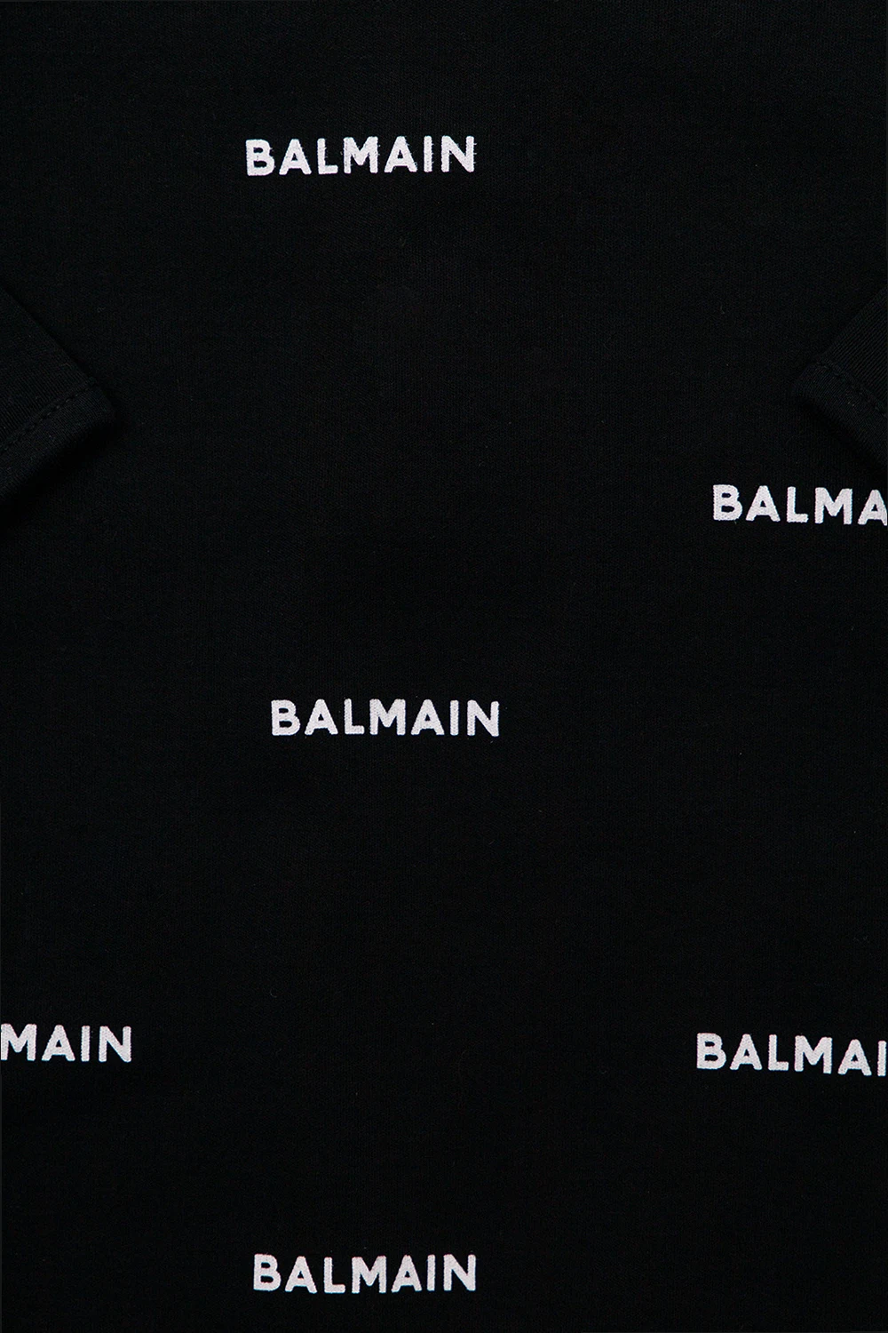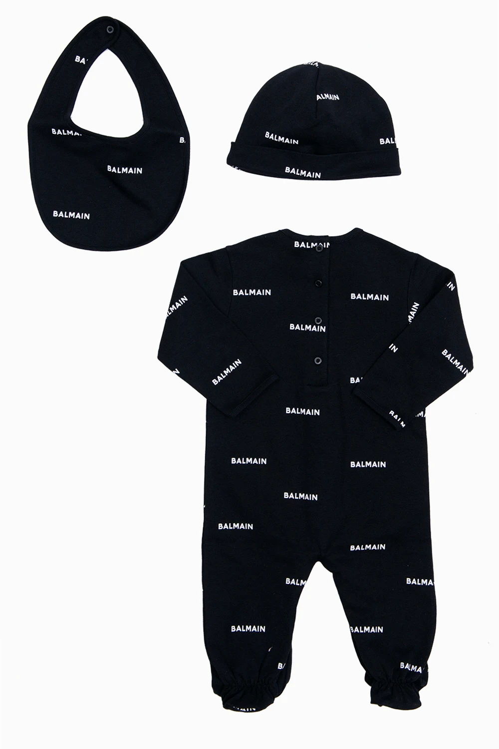 Black set from Balmain Kids. Made of cotton and decorated with a white graphic print with the brand\'s logo, it includes a romper suit, a hat and a bib.