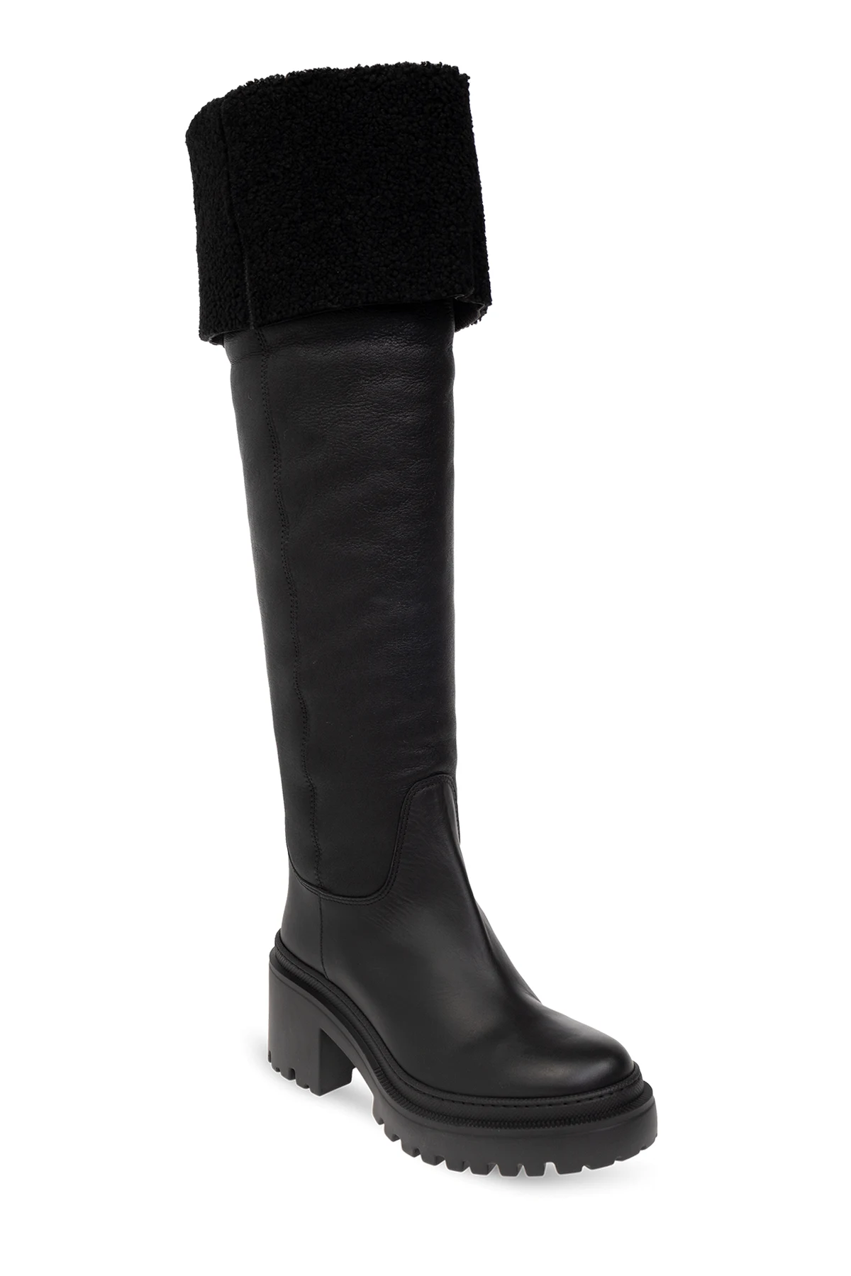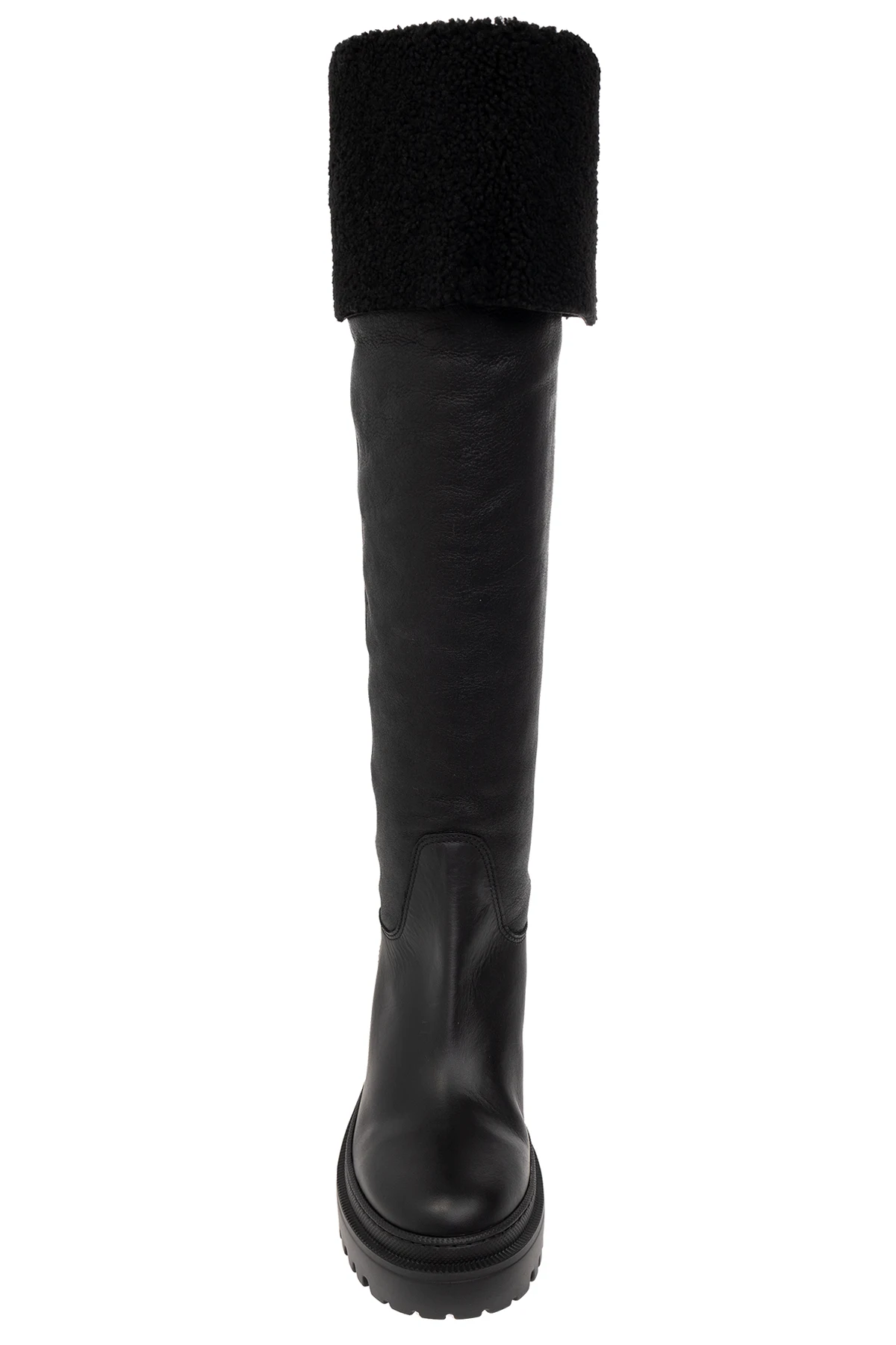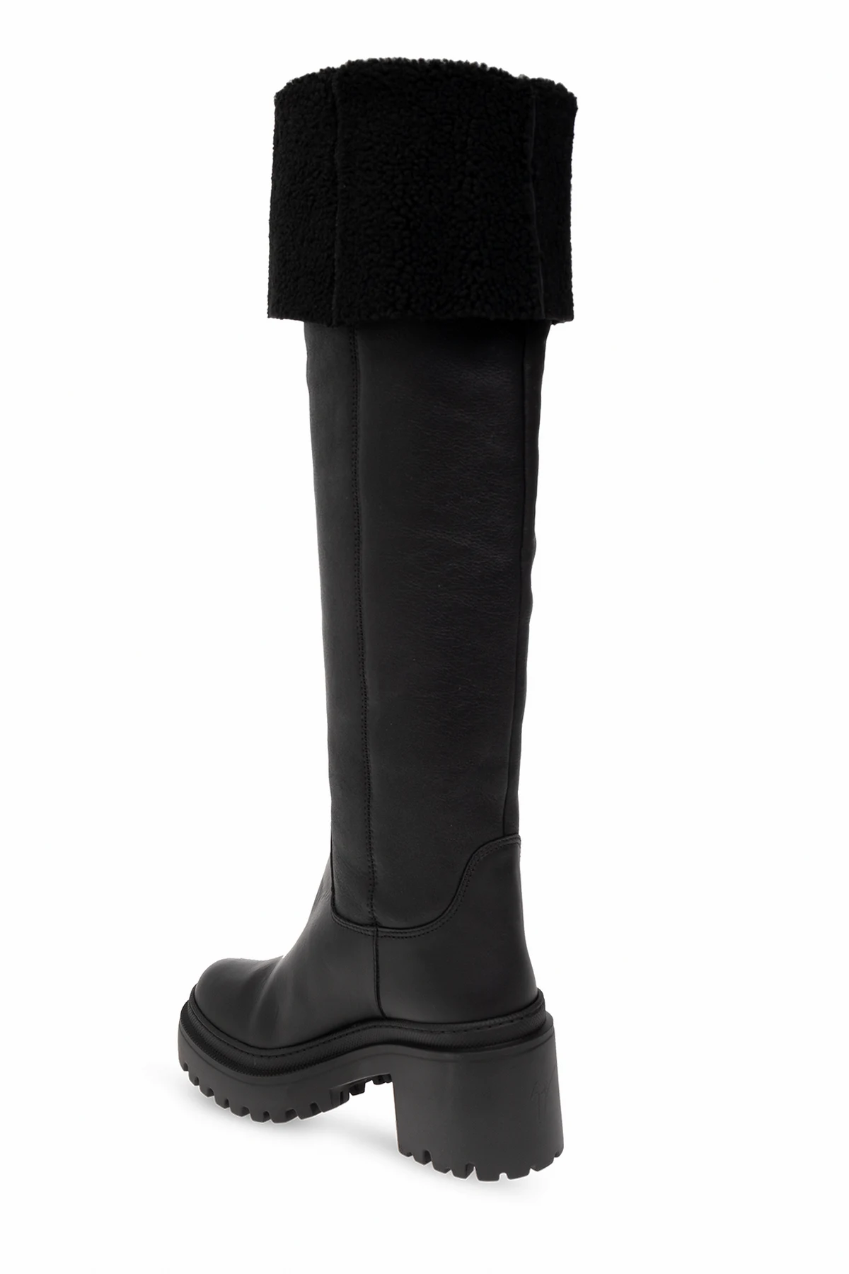 Black ‘Iwona’ heeled boots from Giuseppe Zanotti. Made of leather and trimmed with fur, this model sits on a black rubber sole and features a round toe.