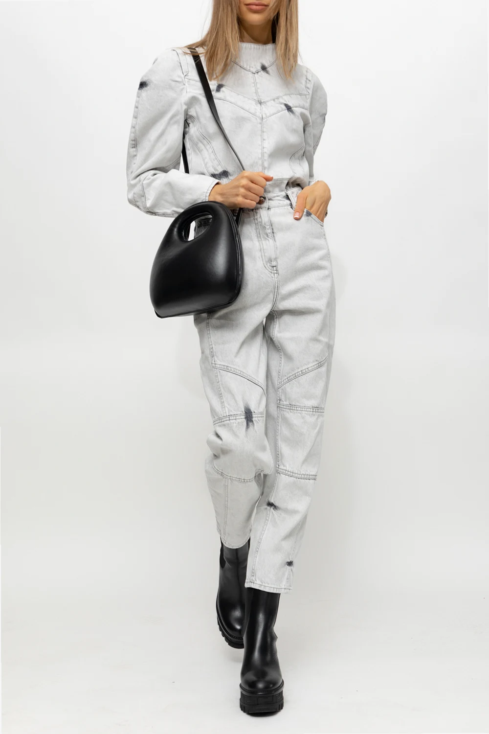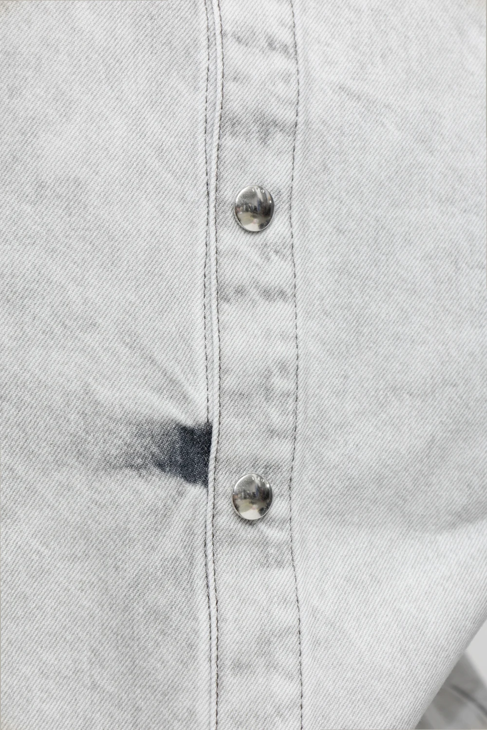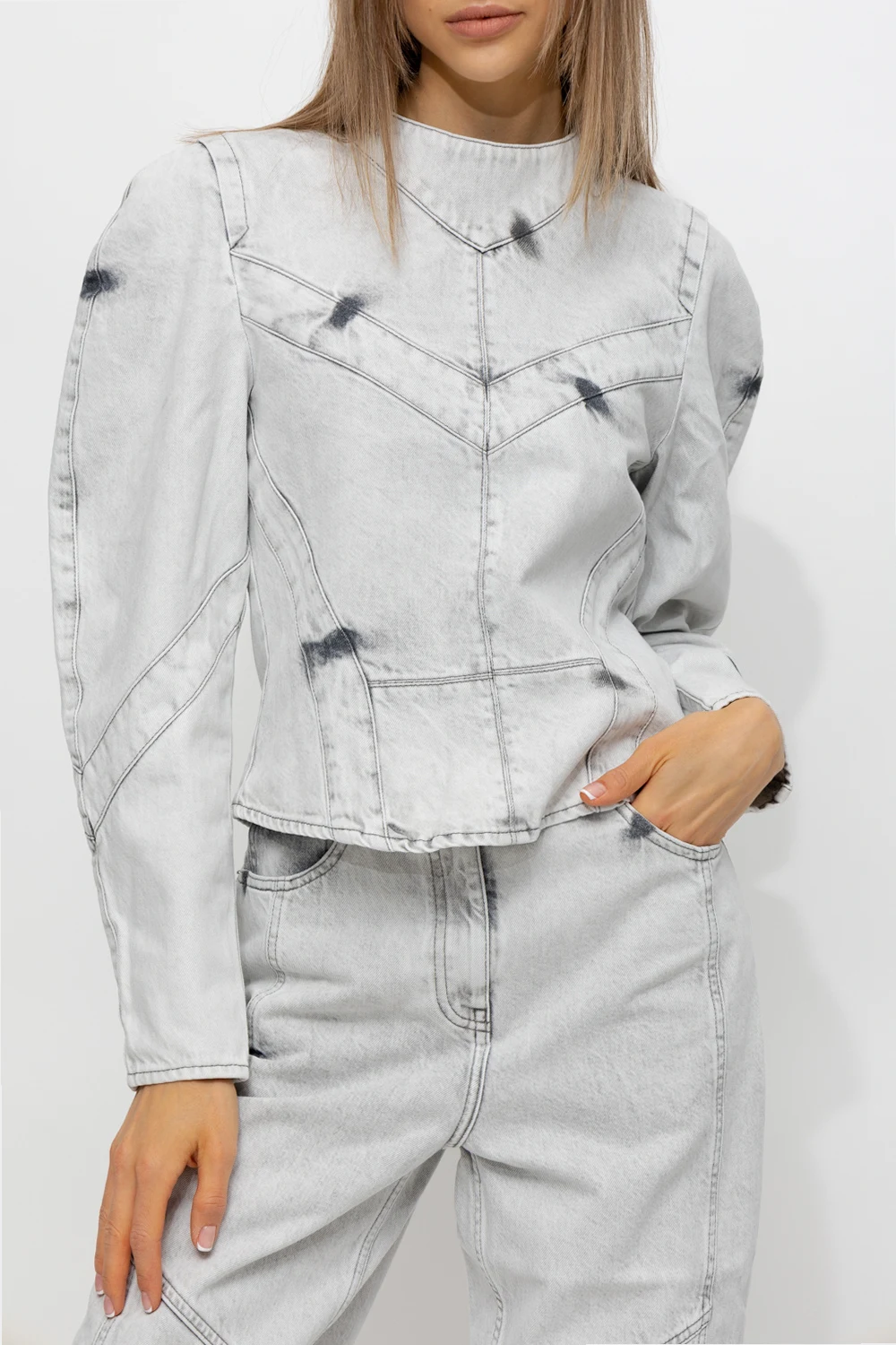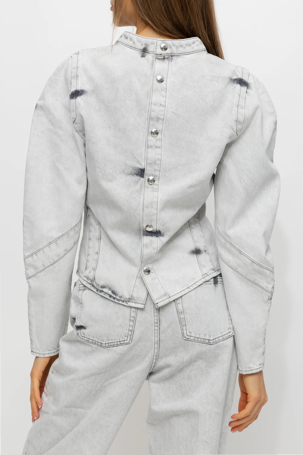 Light grey denim top from Iro. Crafted from cotton, this style features snap fastenings, a distressed effect, exposed stitching details and long puff sleeves.
