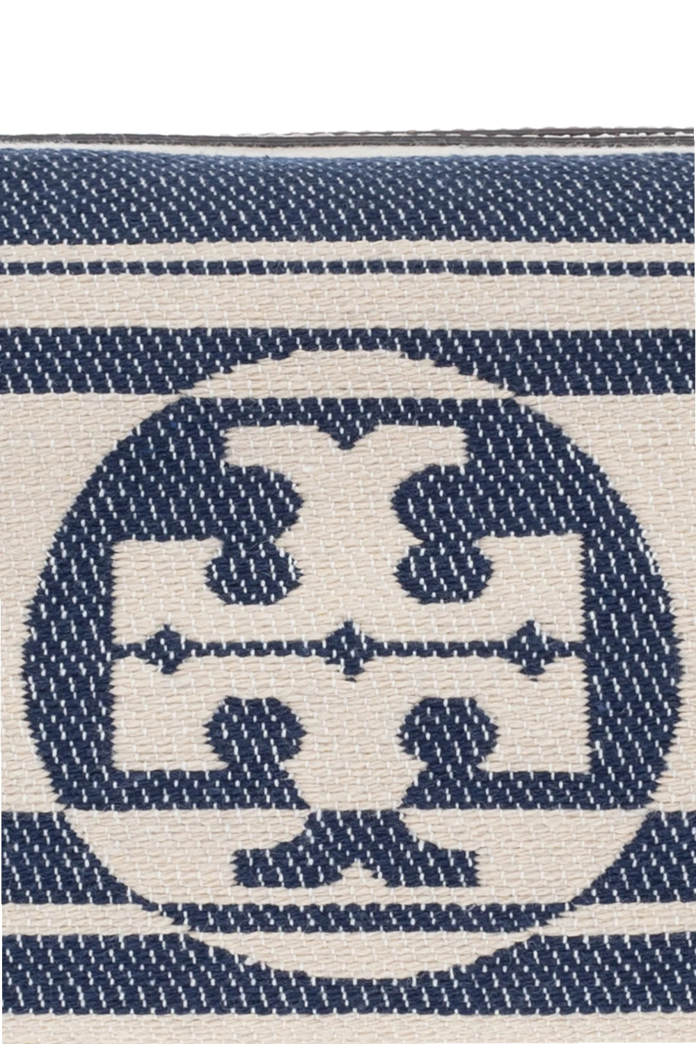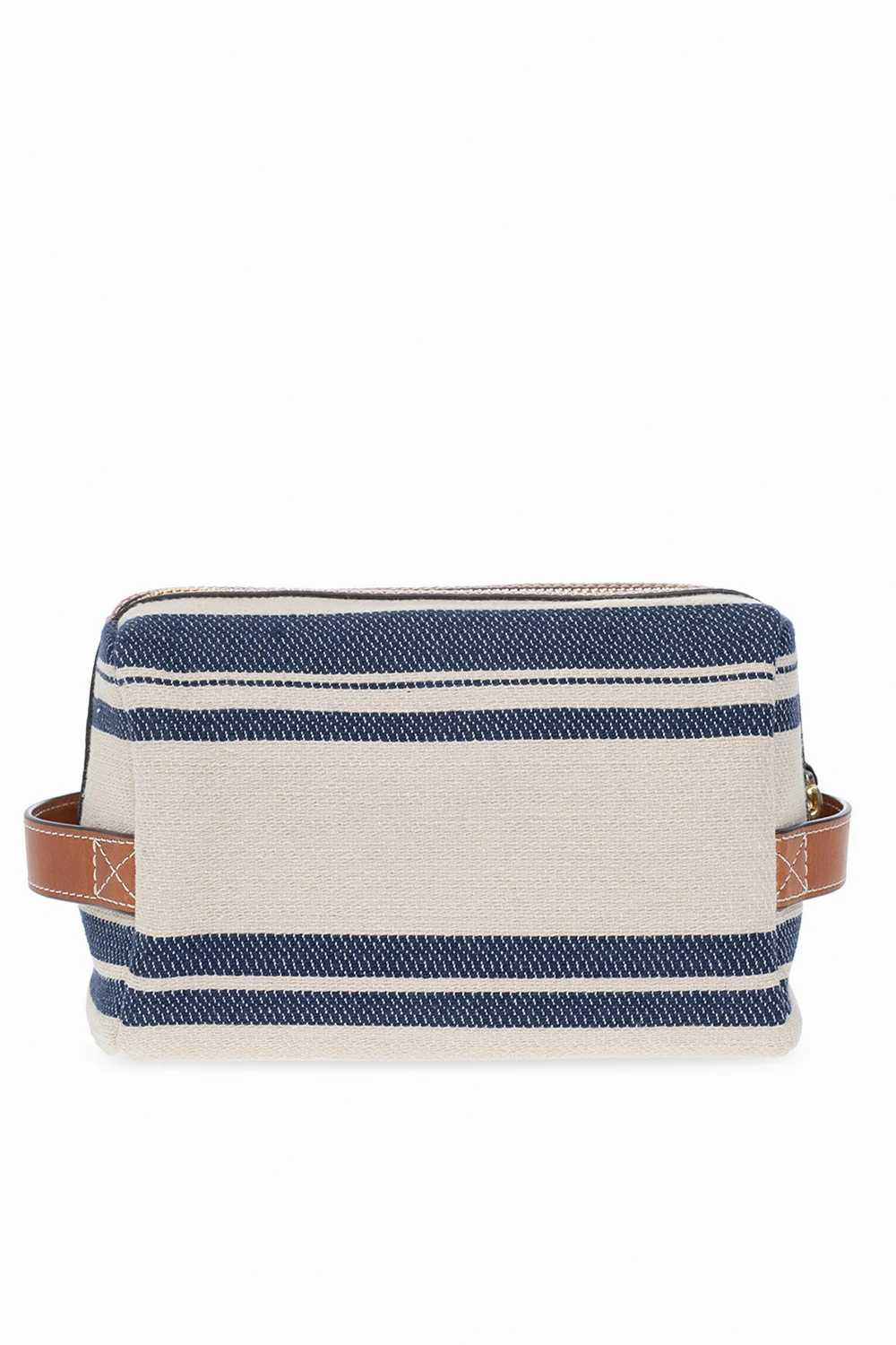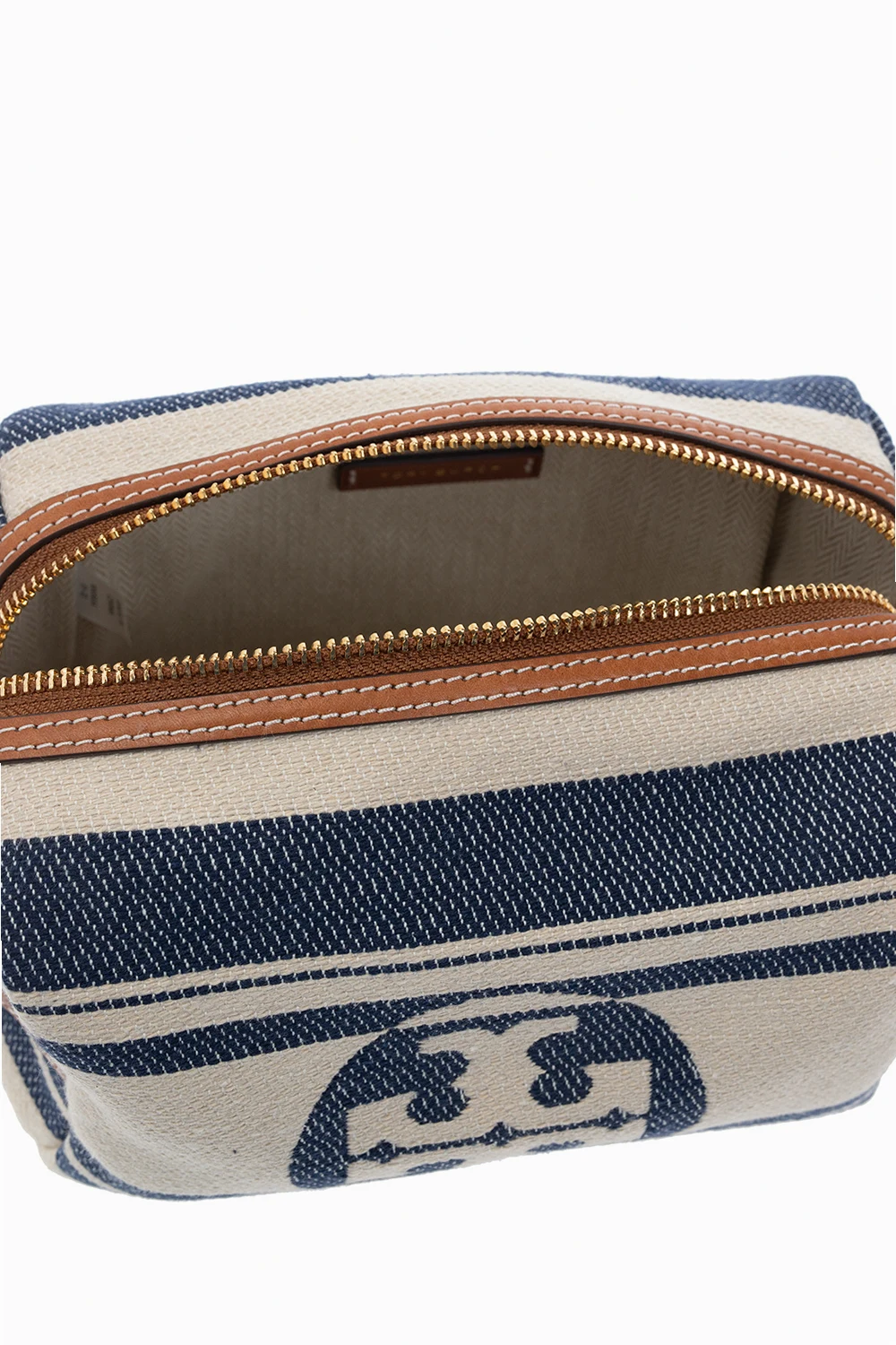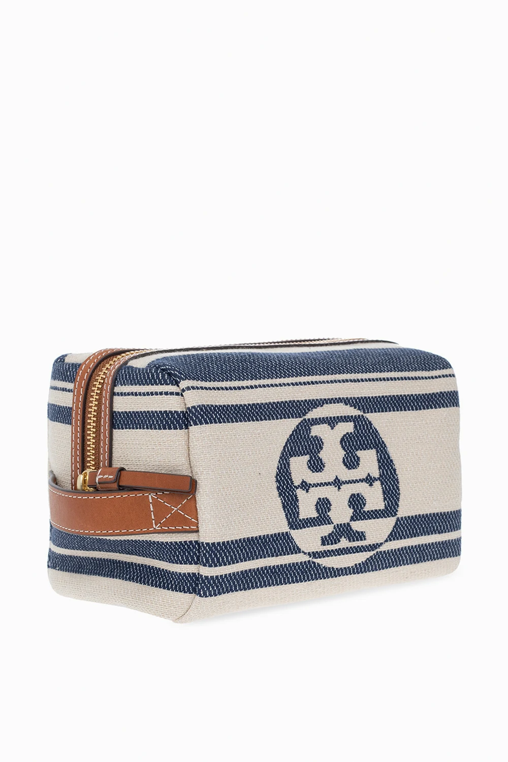 Cream, navy blue and brown ‘Ella’ wash bag from Tory Burch. Crafted from canvas with horizontal stripes and logo embroidery, this design features a zip fastening leather trims, two short handles and one internal compartment.