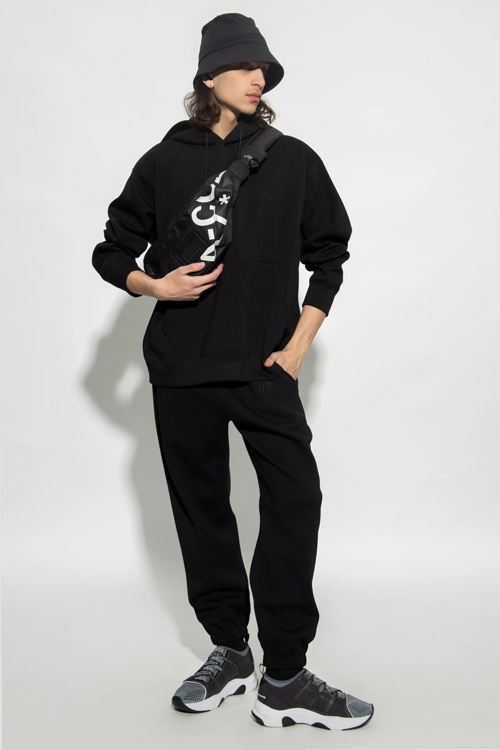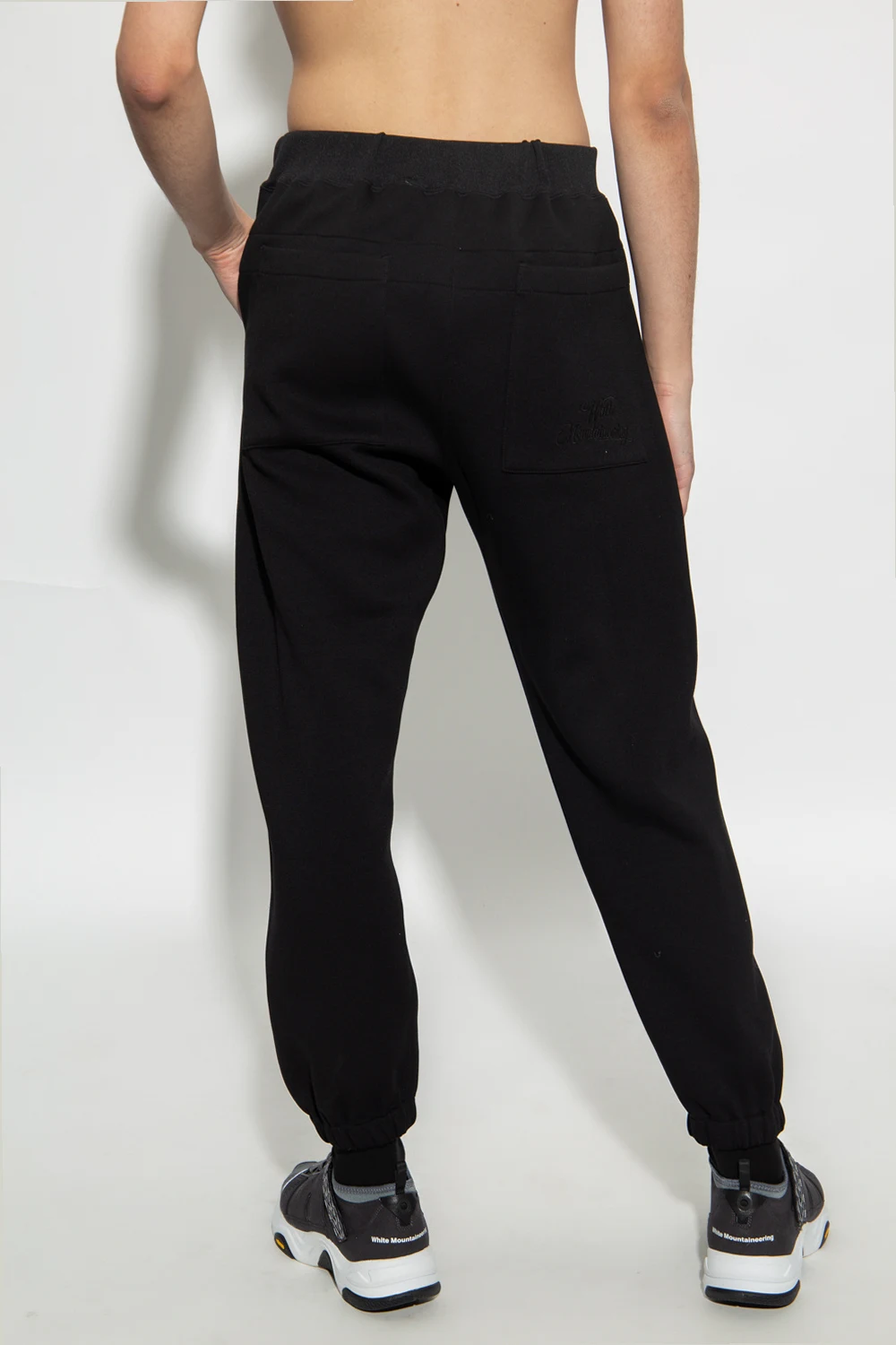 Black sweatpants from White Mountaineering. Embroidered with the brand\'s logo, this pair features a drawstring waist, elasticated cuffs and four slip pockets.