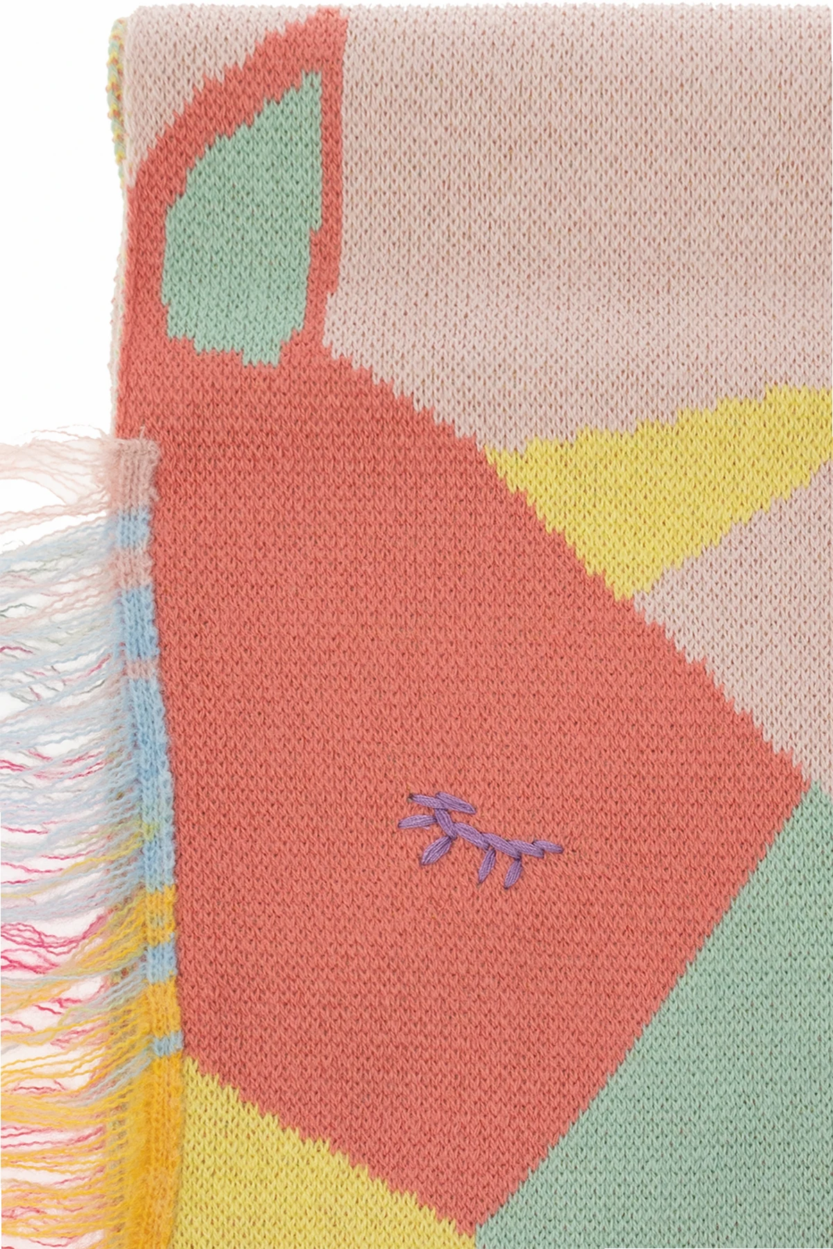 Pink scarf from Stella McCartney Kids. Made from a blend of organic cotton and wool, this design features a multicolored unicorn motif and fringes.