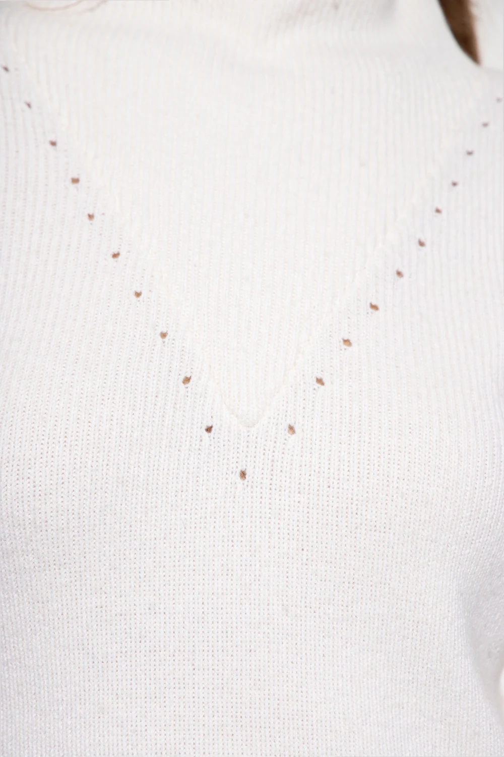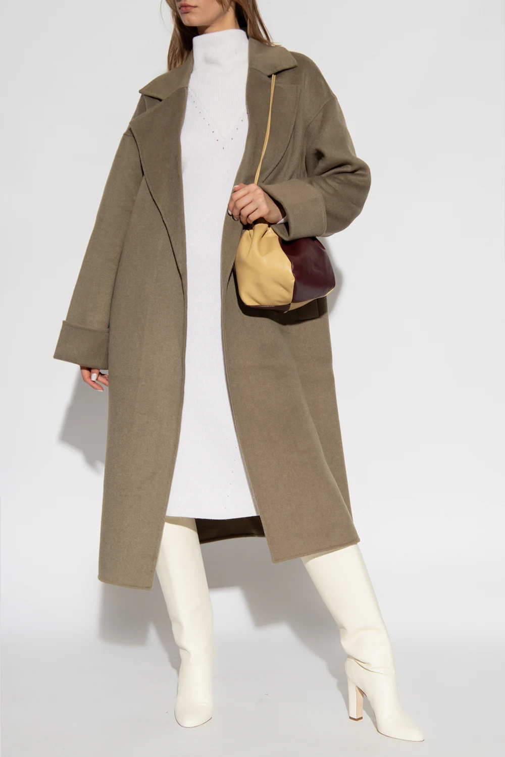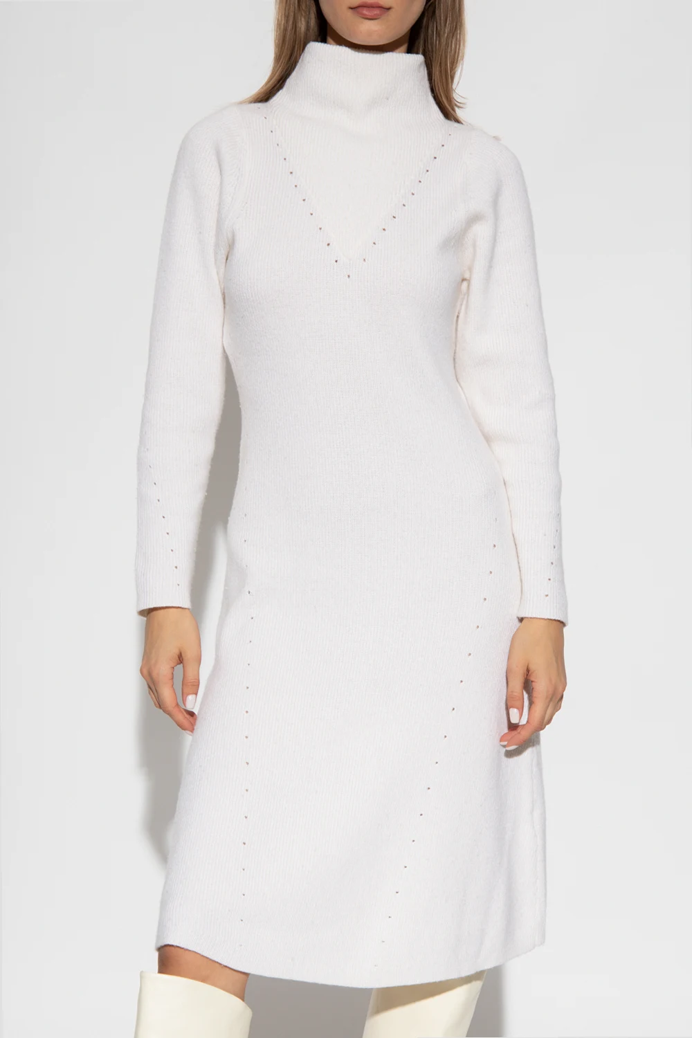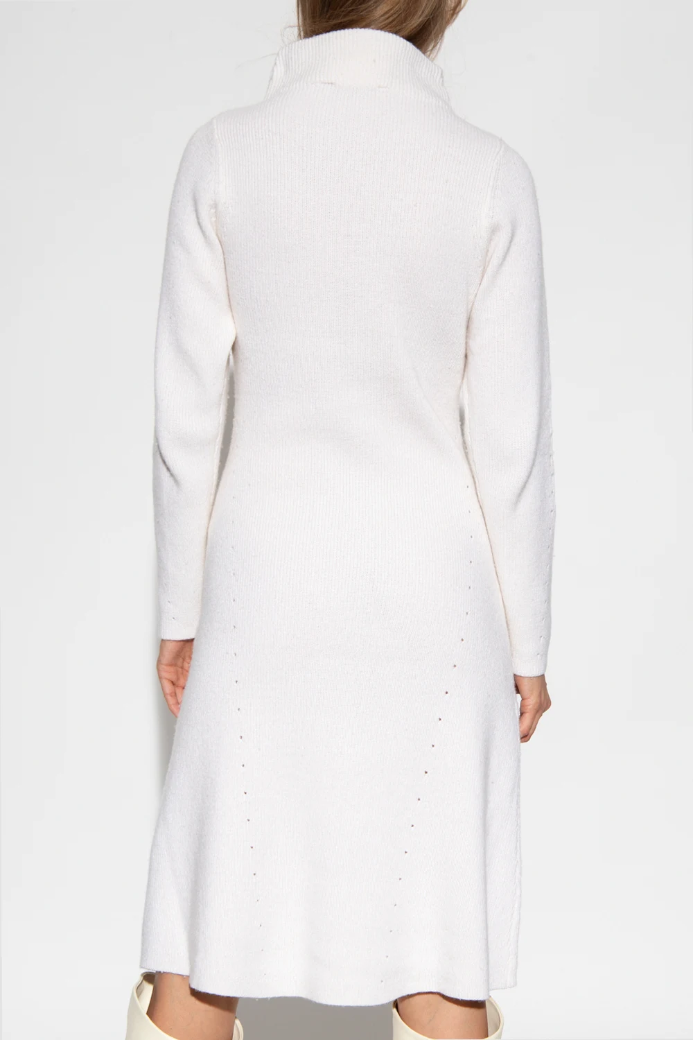 Cream ‘Erin’ dress with a standing collar from Notes Du Nord. Crafted from a blend of recycled material, organic cotton and wool with the RWS certificate, this style features a ribbed knit and long sleeves.