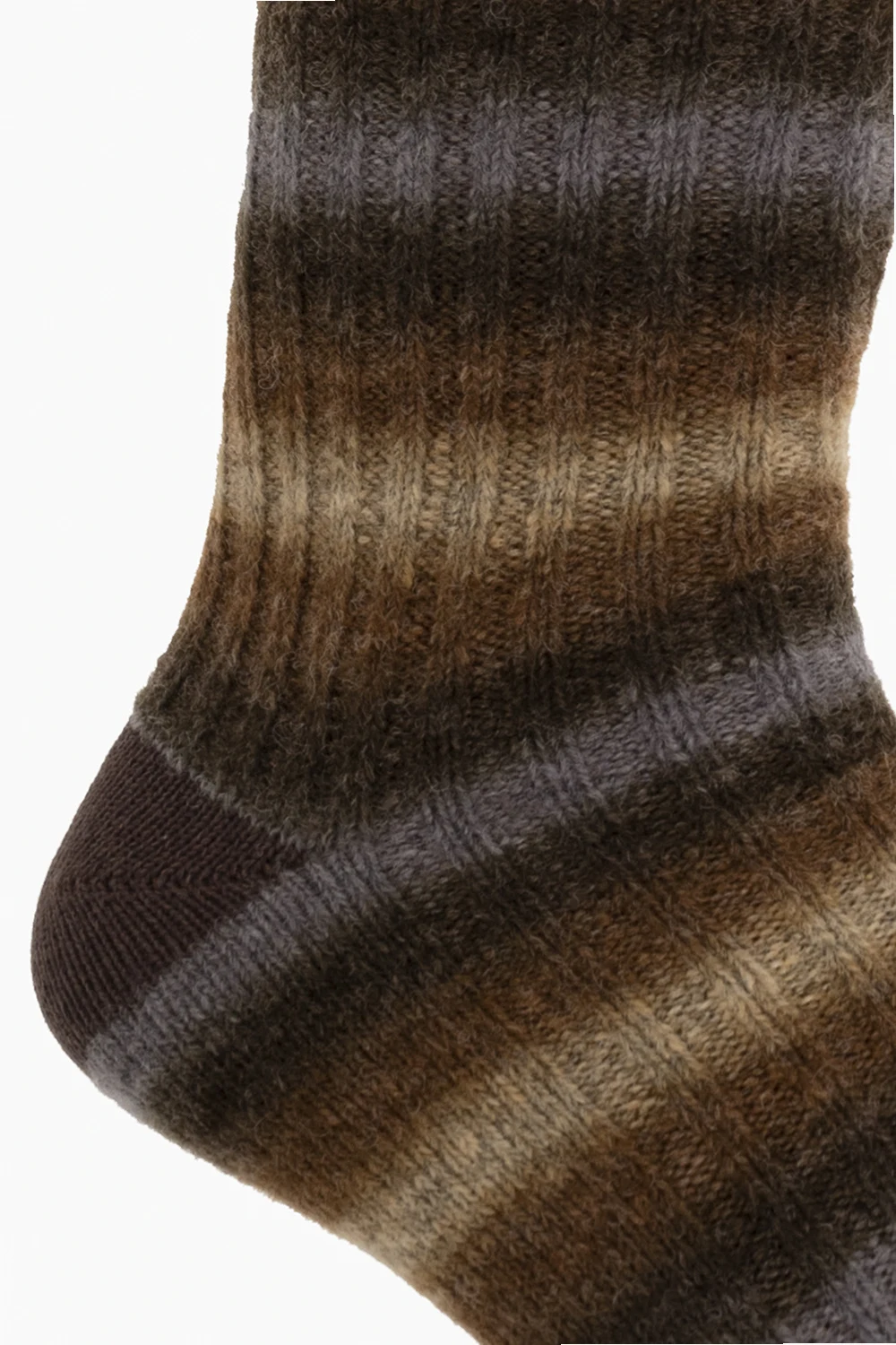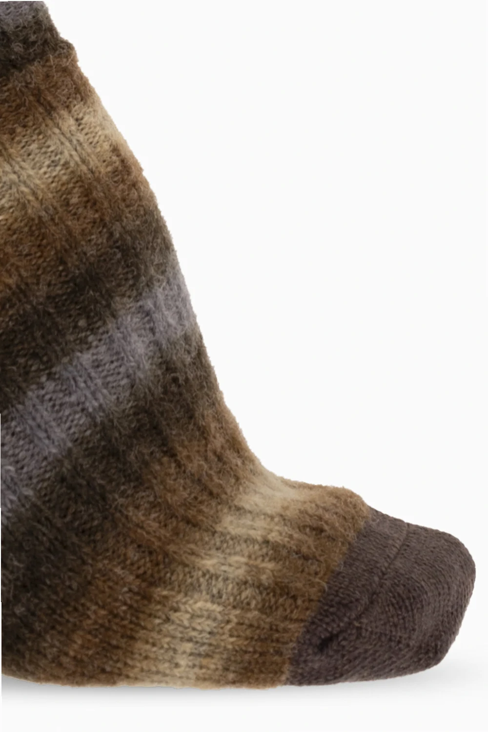 Brown, beige and grey socks from Norse Projects. Embellished with a stripe pattern, this pair features ribbed cuffs and a white logo print.