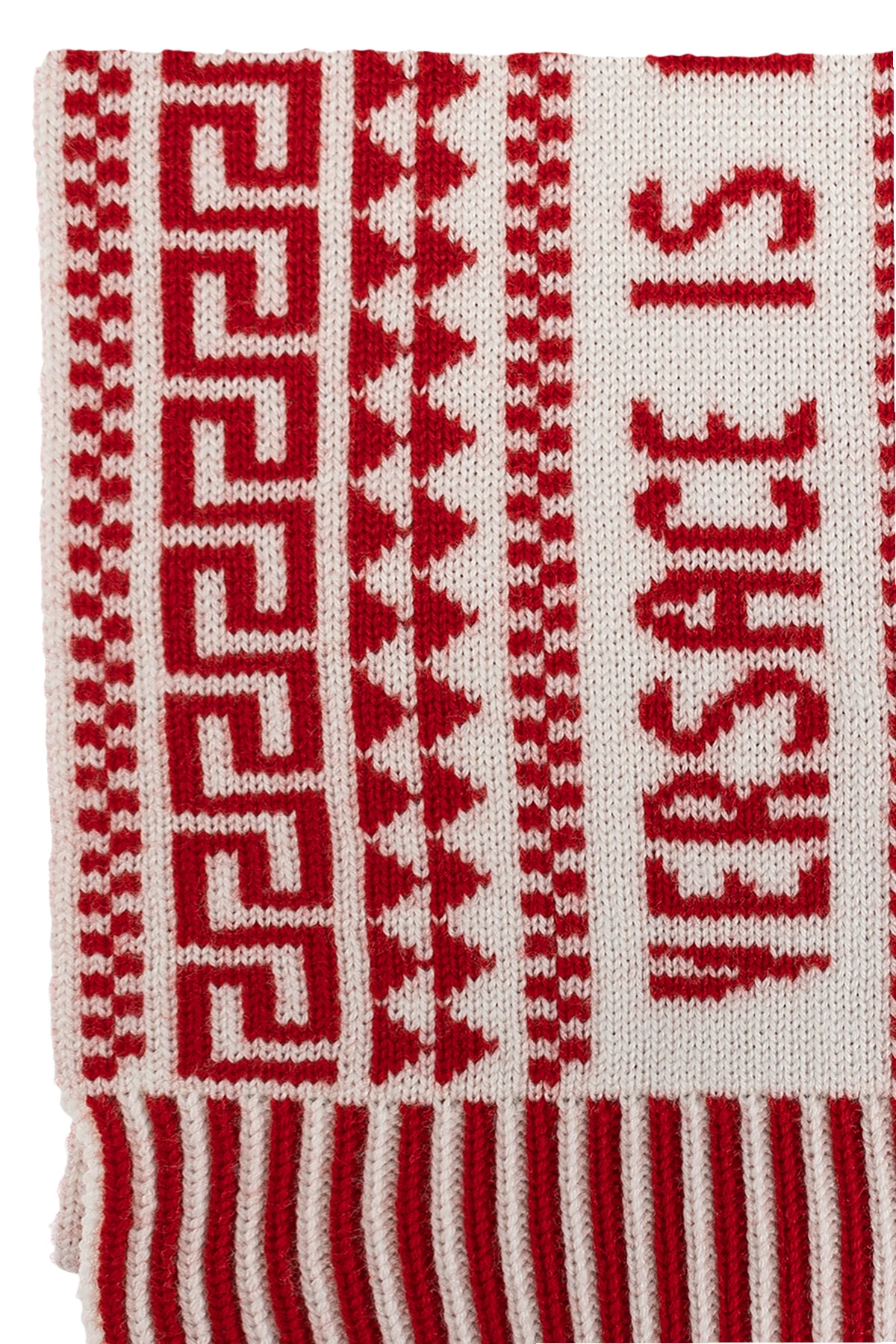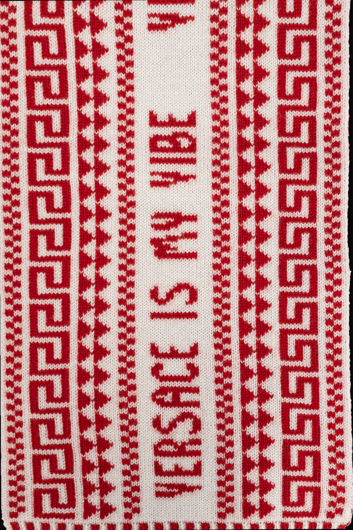 Indulge in the opulence of the Versace Kids Wool Scarf, a distinguished piece from an exclusive collection that embodies the quintessence of luxury. This exquisite scarf, crafted from premium wool, showcases a dominant red hue accentuated by white elements, creating a visual tapestry of modern elegance. Adorned with diverse geometric patterns, including distinctive Greek meanders and tree-like motifs, this scarf captures the imagination. The centerpiece, a bold inscription of \"VERSACE IS MY VIBE,\" fortifies its status as a hallmark of style and sophistication. Finely striped edges lend an air of graceful refinement, encapsulating a seamless blend of contemporary design with timeless patterns. Why Choose This Product? Crafted from luxurious wool for unparalleled warmth and comfort. Features iconic Greek and tree motifs, adding a unique flair. Includes the exclusive \"VERSACE IS MY VIBE\" inscription. Elegantly finished with striped edges for a polished look.