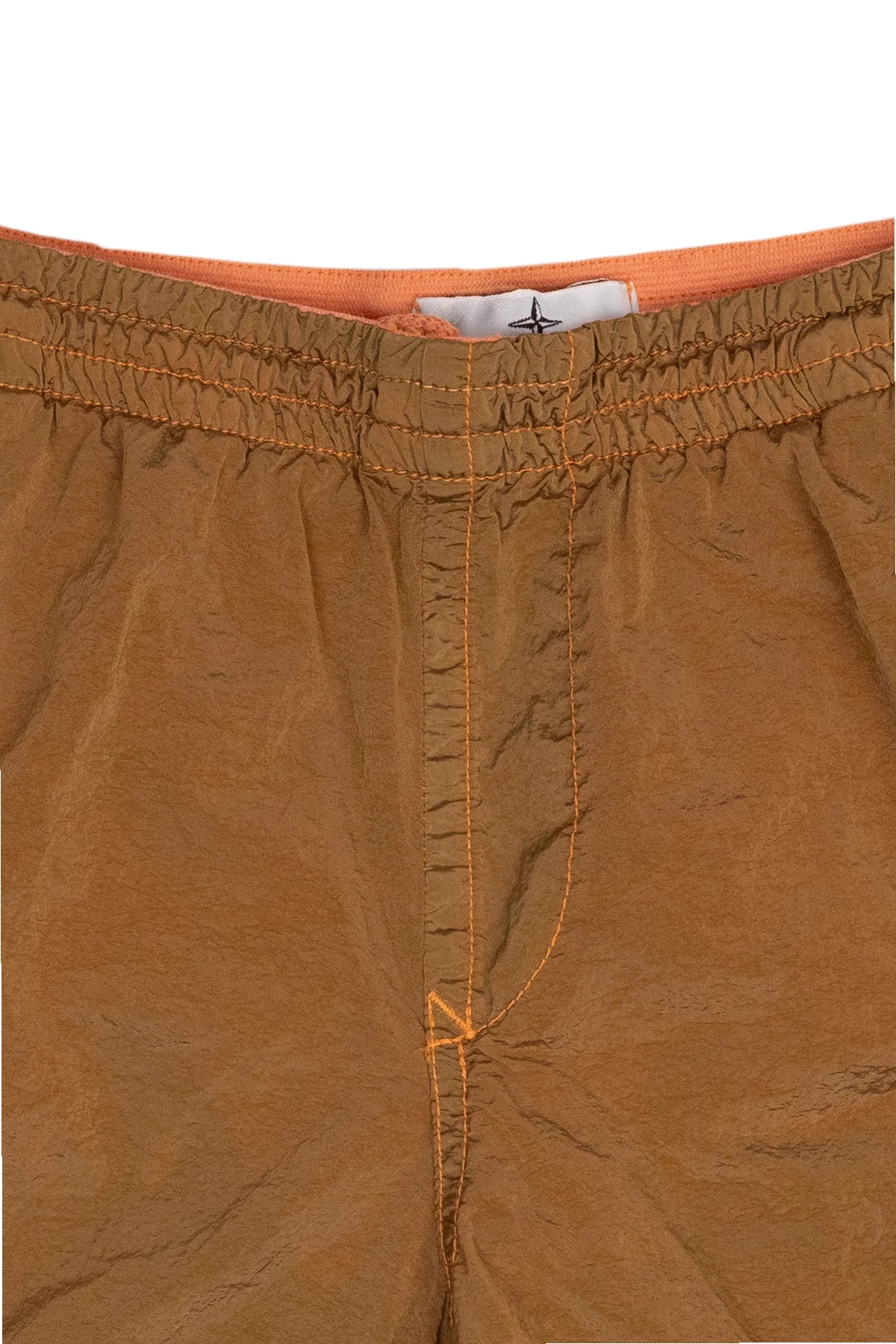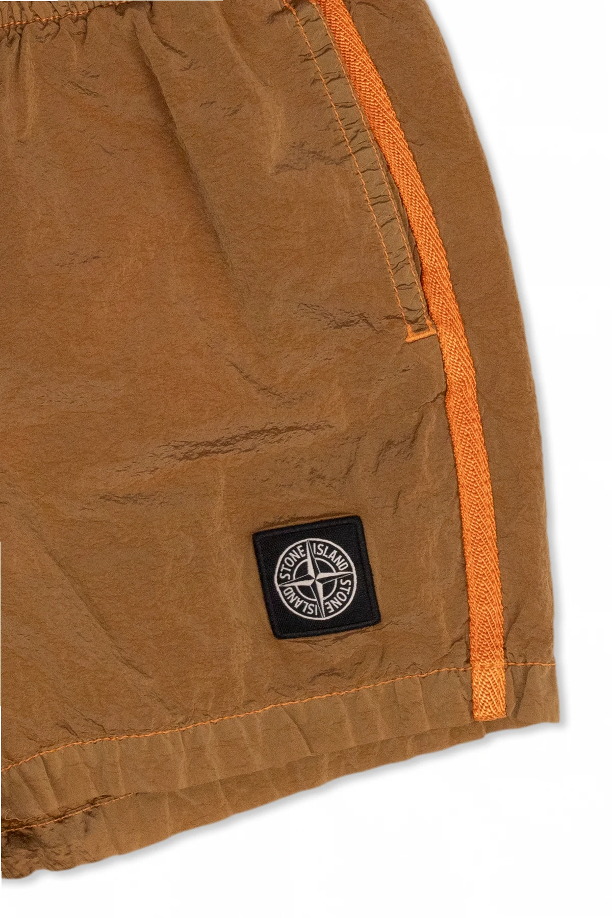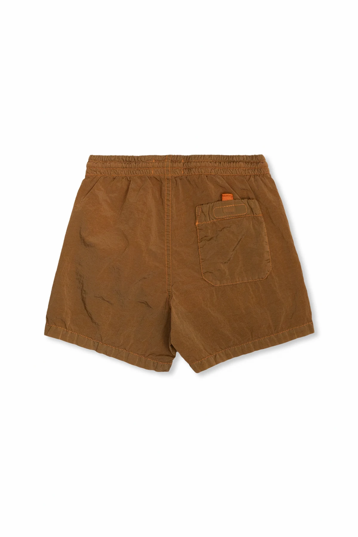 Brown and orange swim shorts from Stone Island Kids. Made of recycled fabrics, this pair features an elastic drawstring waistband, a logo patch, two slip pockets and one zip pocket.