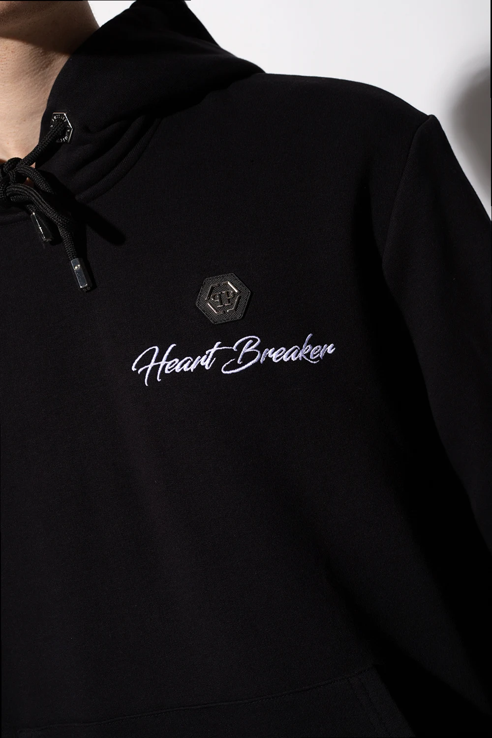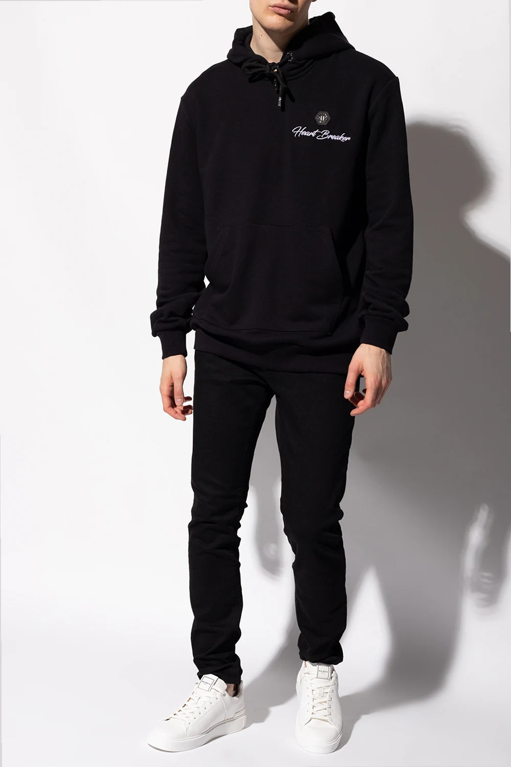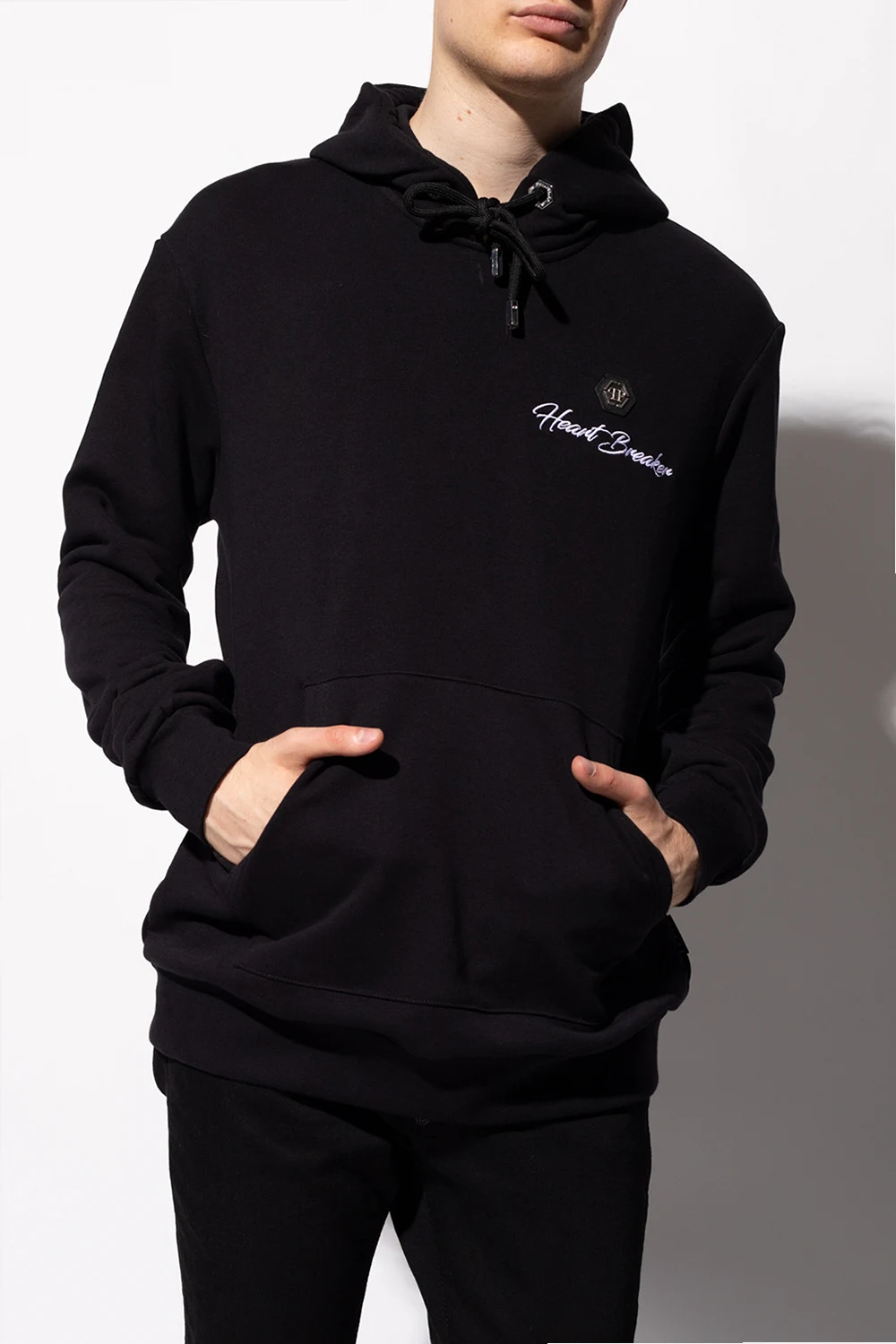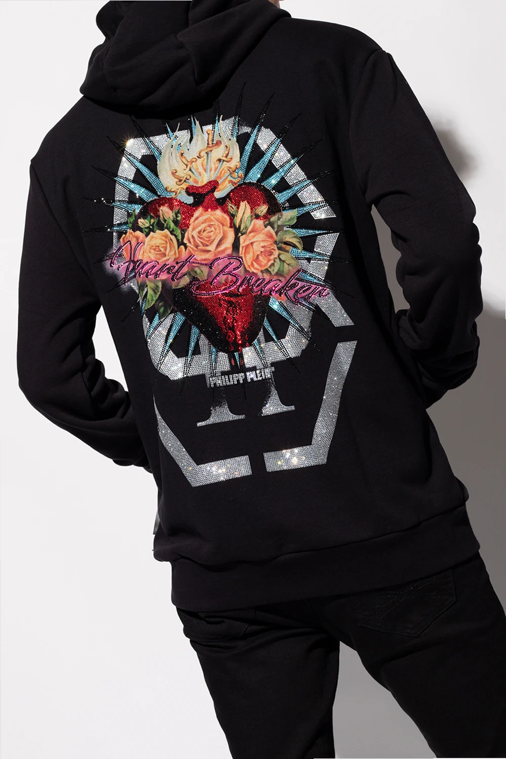 Black sweatshirt with a drawcord-adjustable hood from Philipp Plein. Crafted from cotton jersey, this hoodie showcases graphic embroidery, a logo patch, a colourful, shimmering floral appliqué, a kangaroo pocket and ribbed trims on the bottom hem and cuffs.