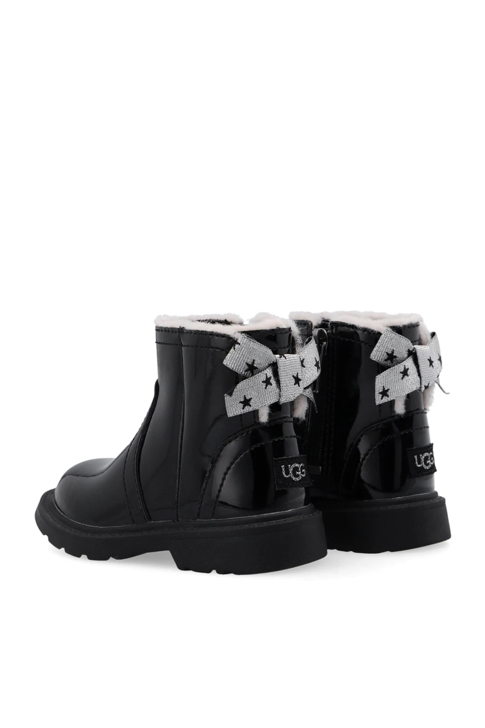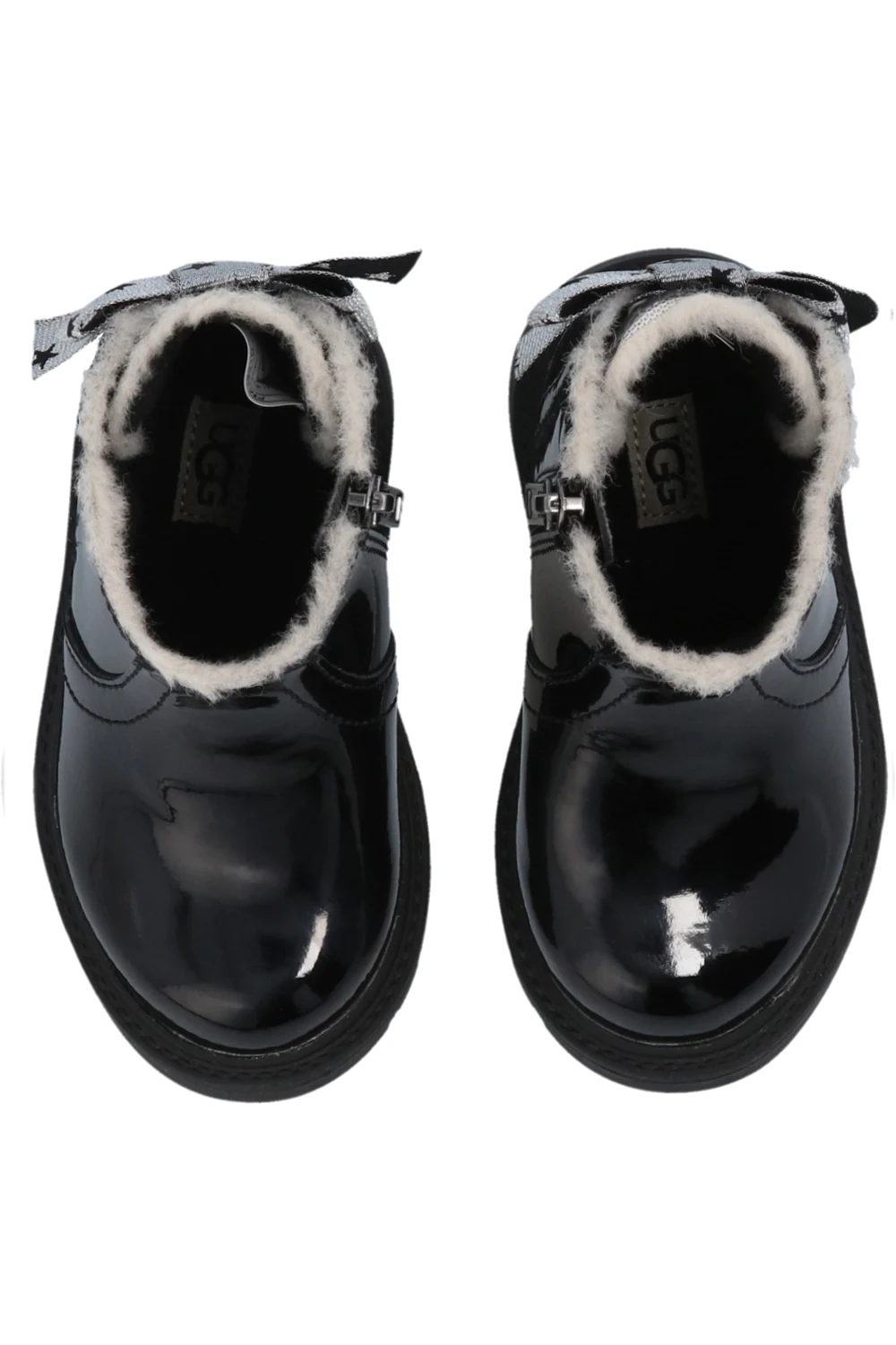 Black ‘T Lynde Patent’ ankle boots from UGG Kids. Crafted from patent leather, this pair features a side zip, logo patch at the back, decorative silver-tone bow, UGGpure™ wool lining and black rubber sole.